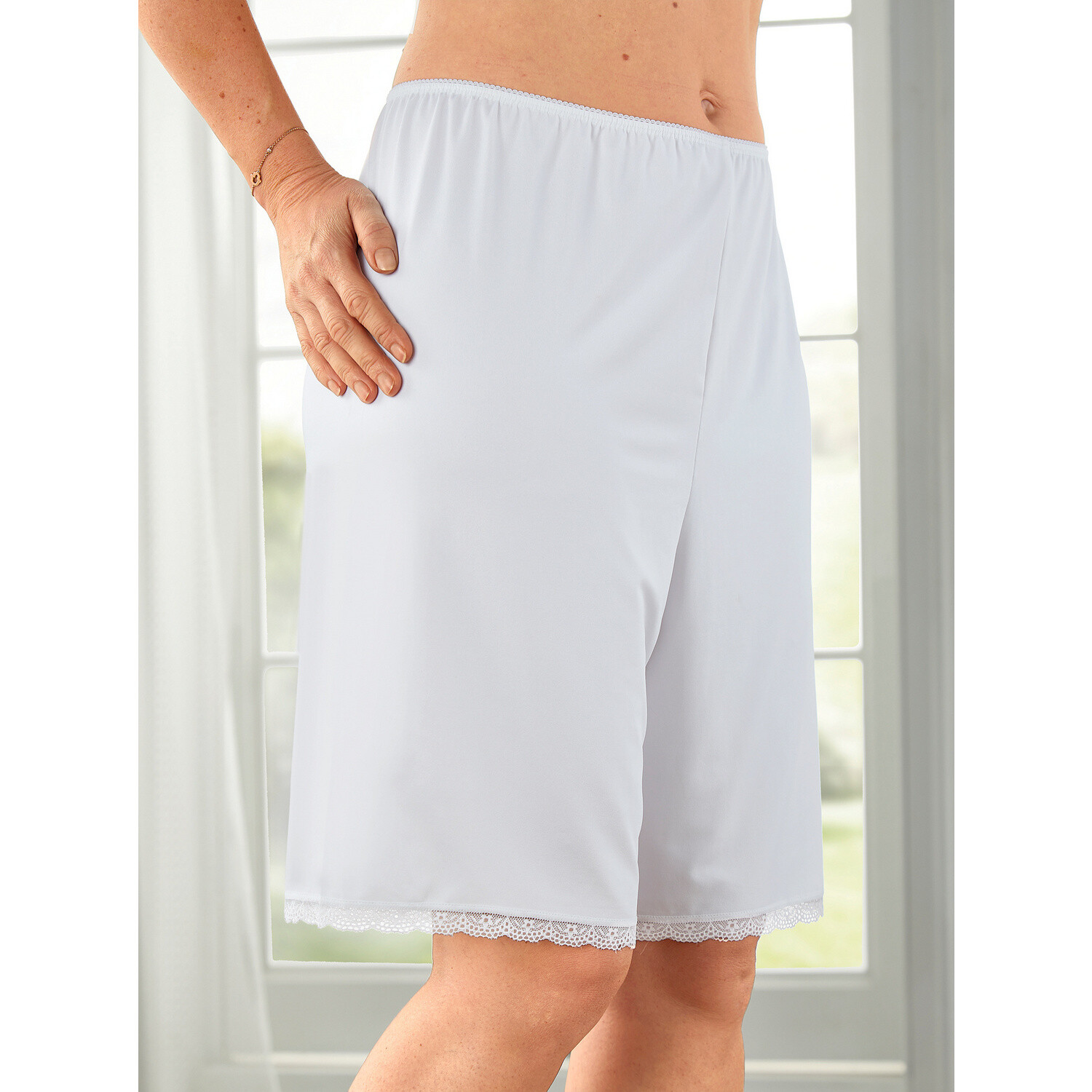 Струмлива, вишукана якість завжди надає вашим сукням та спідницям ідеально гладкого вигляду та запобігає небажаній прозорості. Надзвичайно зручні, як штани, з приємною м'якою еластичною талією, широкими штанинами та невеликим мереживним подолом. Доступний як комплект у білому та нюдовому кольорах. Захист від небажаних поглядів. Функція під'юбника. М'який і гладкий.