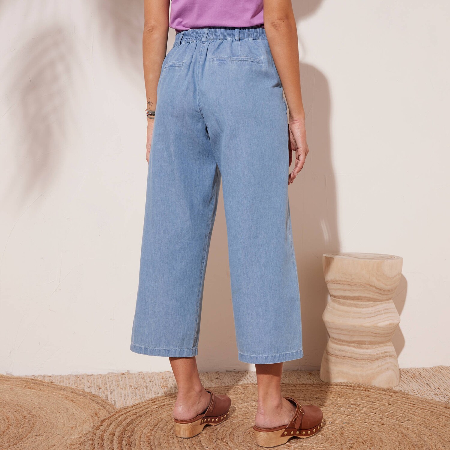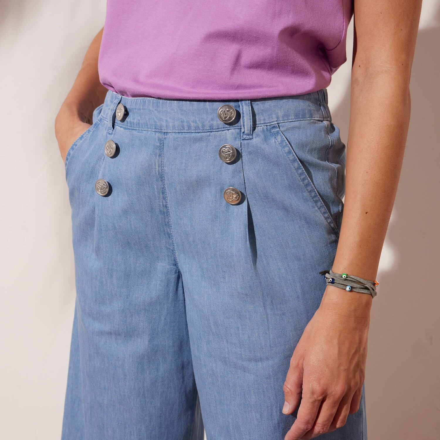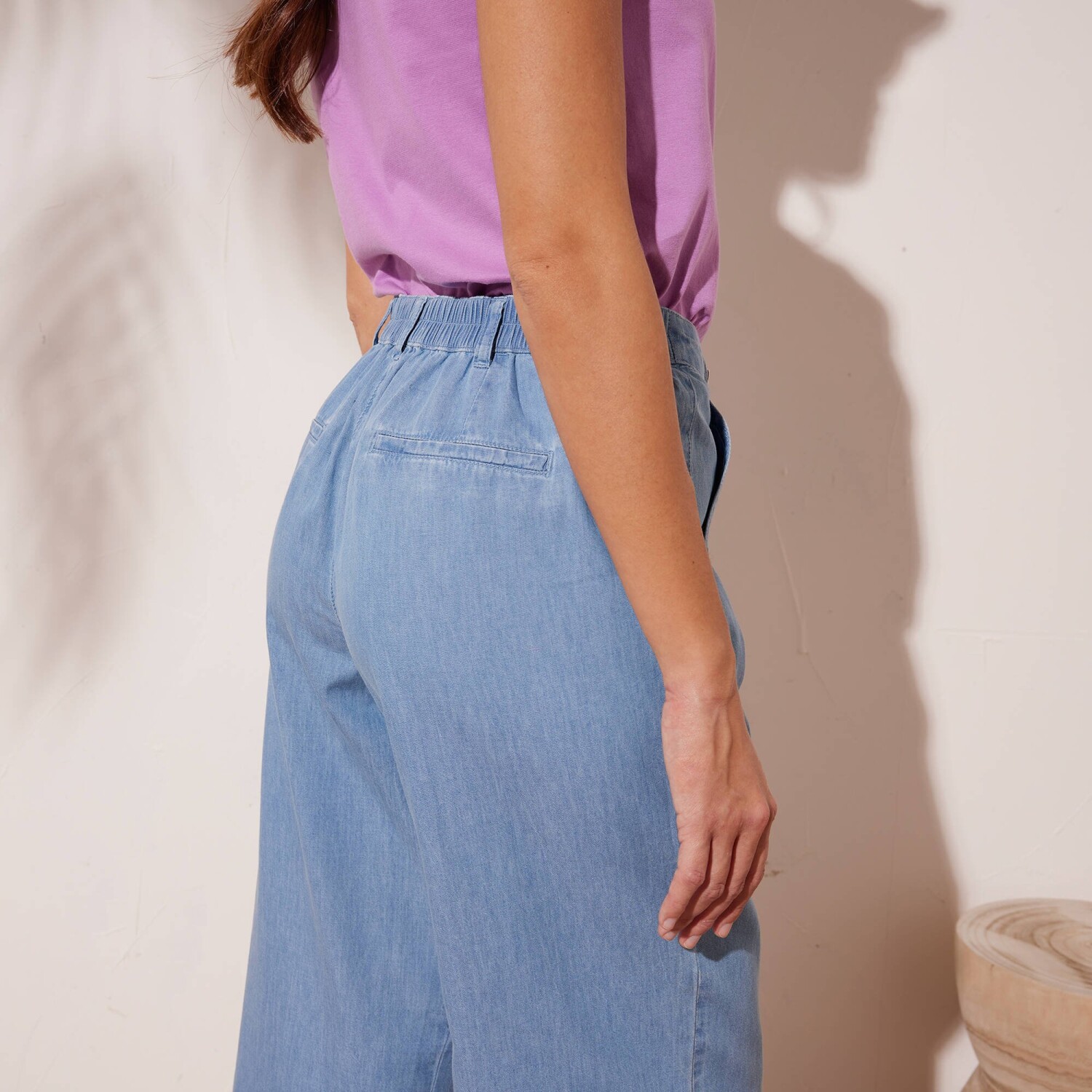 Джинси-стрейч mom натхненні ретро-модою, а їхній крій підходить для будь-якої фігури. Зручний крій mom. Висока талія. Фігурна талія зі шлевками. Застібка на блискавку + 1 ґудзик. 2 прошиті витачки спереду. 2 прорізні кишені. Піднятий задній край та витачки. 2 фальшиві кишені з окантовкою ззаду. Контрастна строчка. Можна підвернути вище щиколоток. Стандарт 100 згідно з Oeko-Tex (n° CQ 1216 / 3 IFTH). Цей знак позначає текстильні вироби, які пройшли лабораторні випробування на широкий спектр шкідливих речовин, і виріб є безпечним понад чинні стандарти. Можна прати в пральній машині.