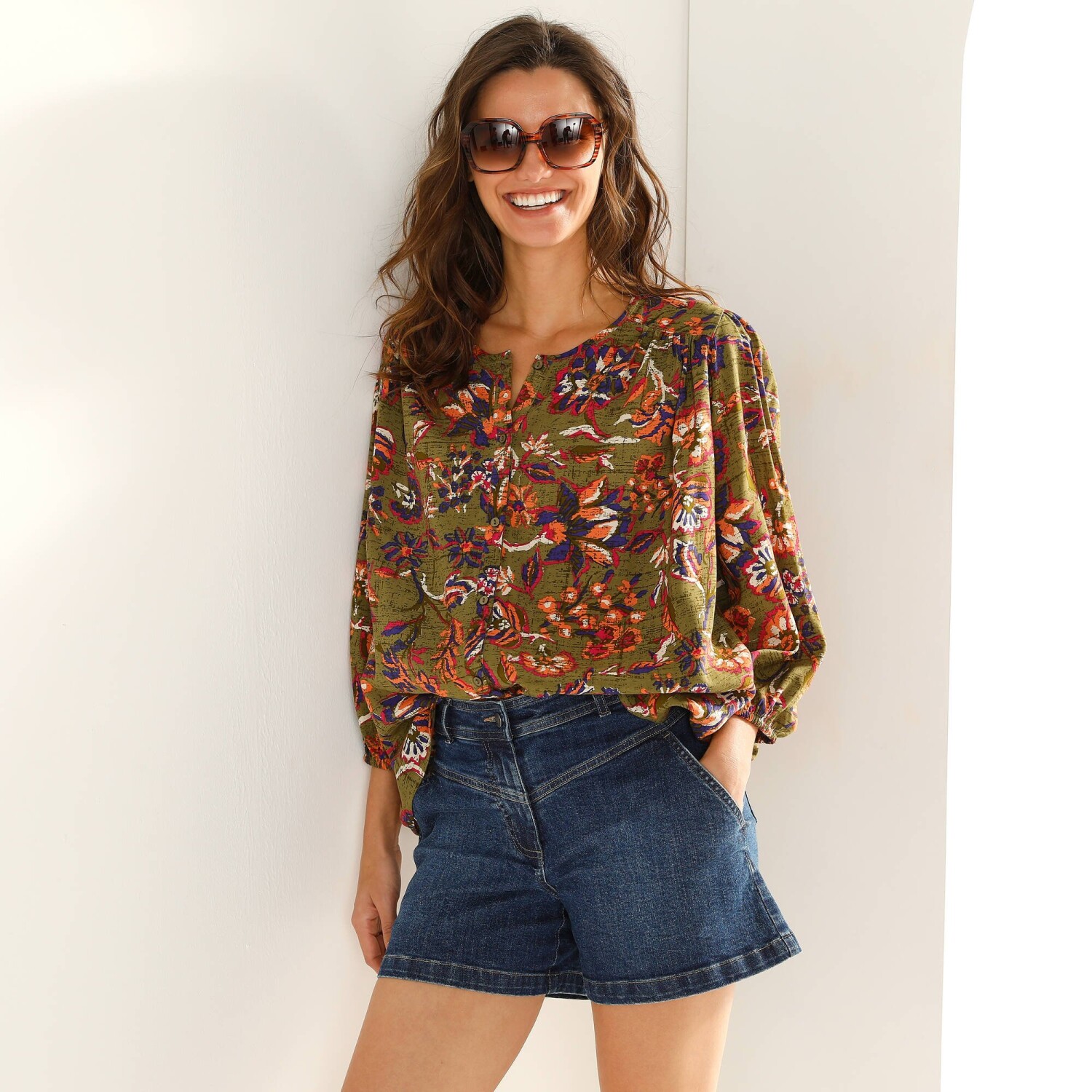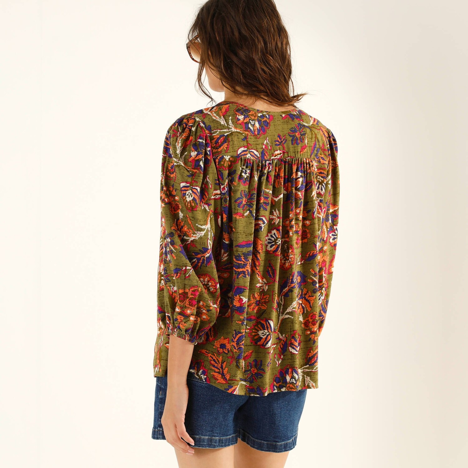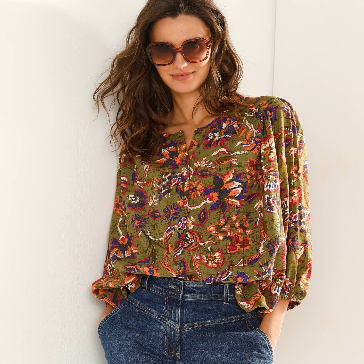 Романтична мода пропонує вам однотонну блузку з макраме-оздобленням. Виготовлена з еластичного м'якого матеріалу. Планка на ґудзиках спереду. Комір-стійка зі зібраним рюшем. V-подібна вставка та обробка макраме. Нагрудні витачки. Довгі рукави. Манжети на ґудзиках з макраме. Злегка закруглений поділ. Стандарт 100 згідно з Oeko-Tex (n° CQ 1216 / 3 IFTH). Цей знак вказує на текстильні вироби, які пройшли лабораторні випробування на широкий спектр шкідливих речовин, і виріб є безпечним понад чинні стандарти. Можна прати в пральній машині.