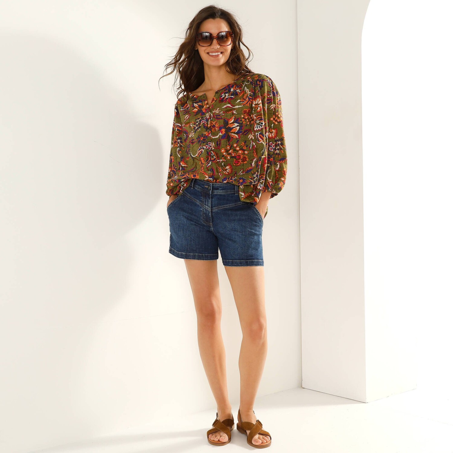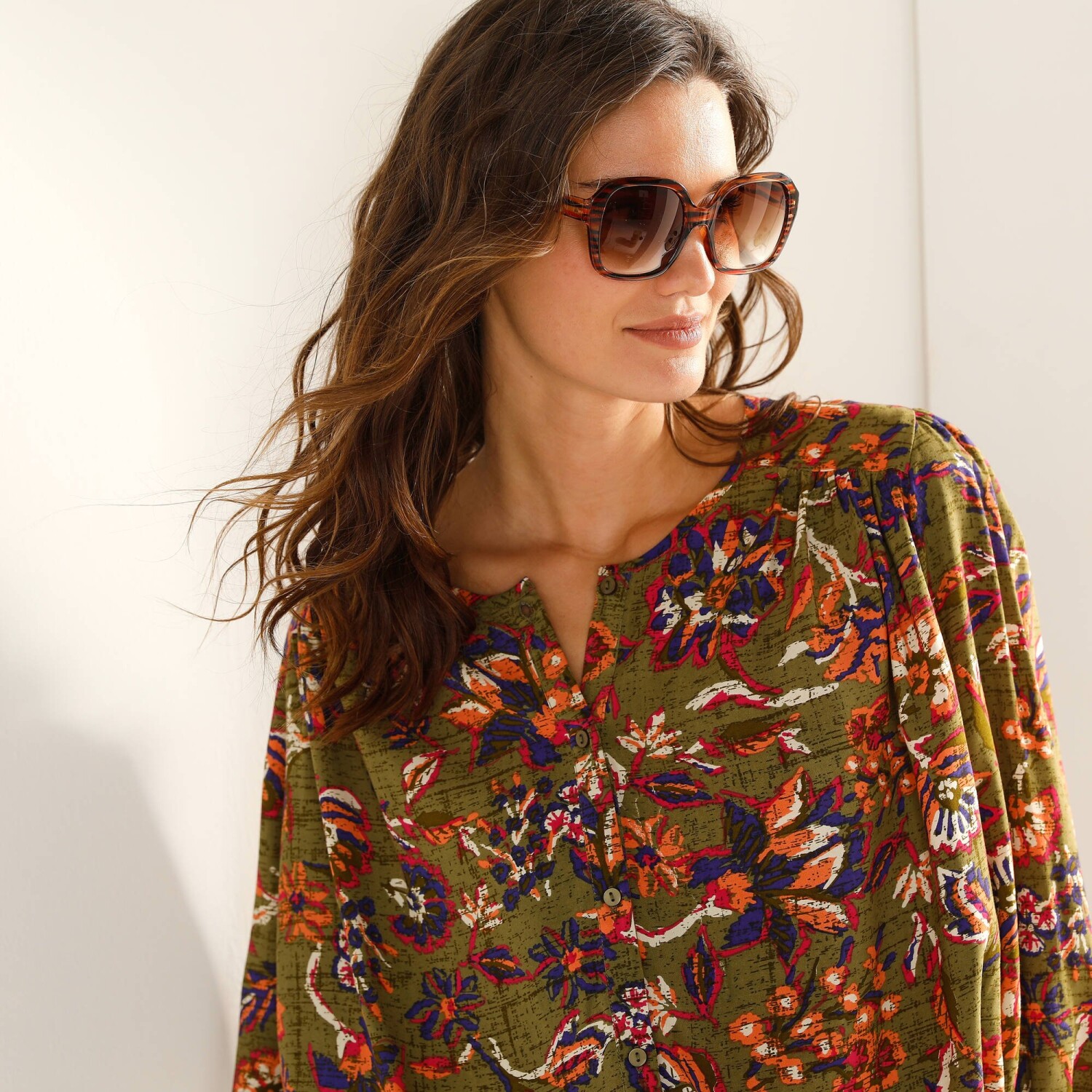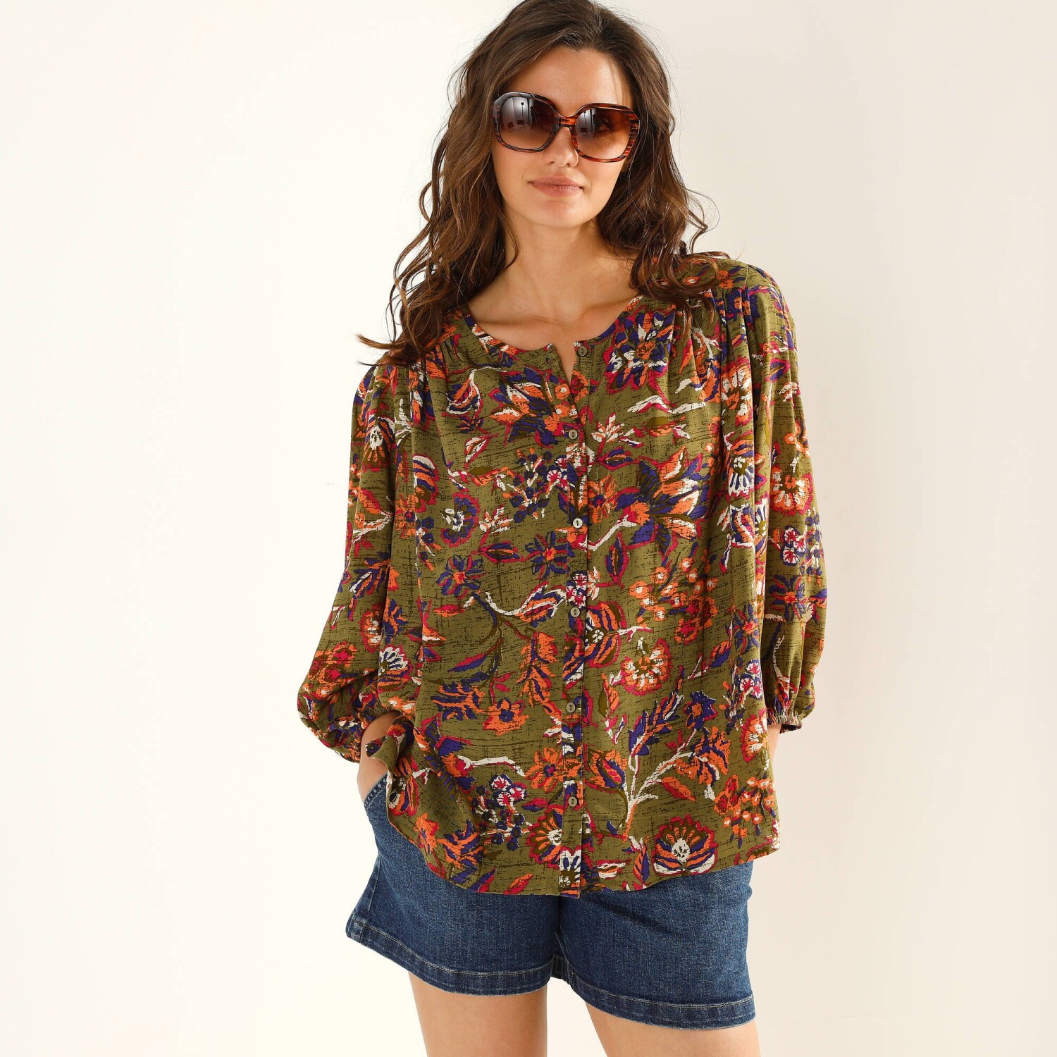 Романтична мода пропонує вам однотонну блузку з макраме-оздобленням. Виготовлена з еластичного м'якого матеріалу. Планка на ґудзиках спереду. Комір-стійка зі зібраним рюшем. V-подібна вставка та обробка макраме. Нагрудні витачки. Довгі рукави. Манжети на ґудзиках з макраме. Злегка закруглений поділ. Стандарт 100 згідно з Oeko-Tex (n° CQ 1216 / 3 IFTH). Цей знак вказує на текстильні вироби, які пройшли лабораторні випробування на широкий спектр шкідливих речовин, і виріб є безпечним понад чинні стандарти. Можна прати в пральній машині.