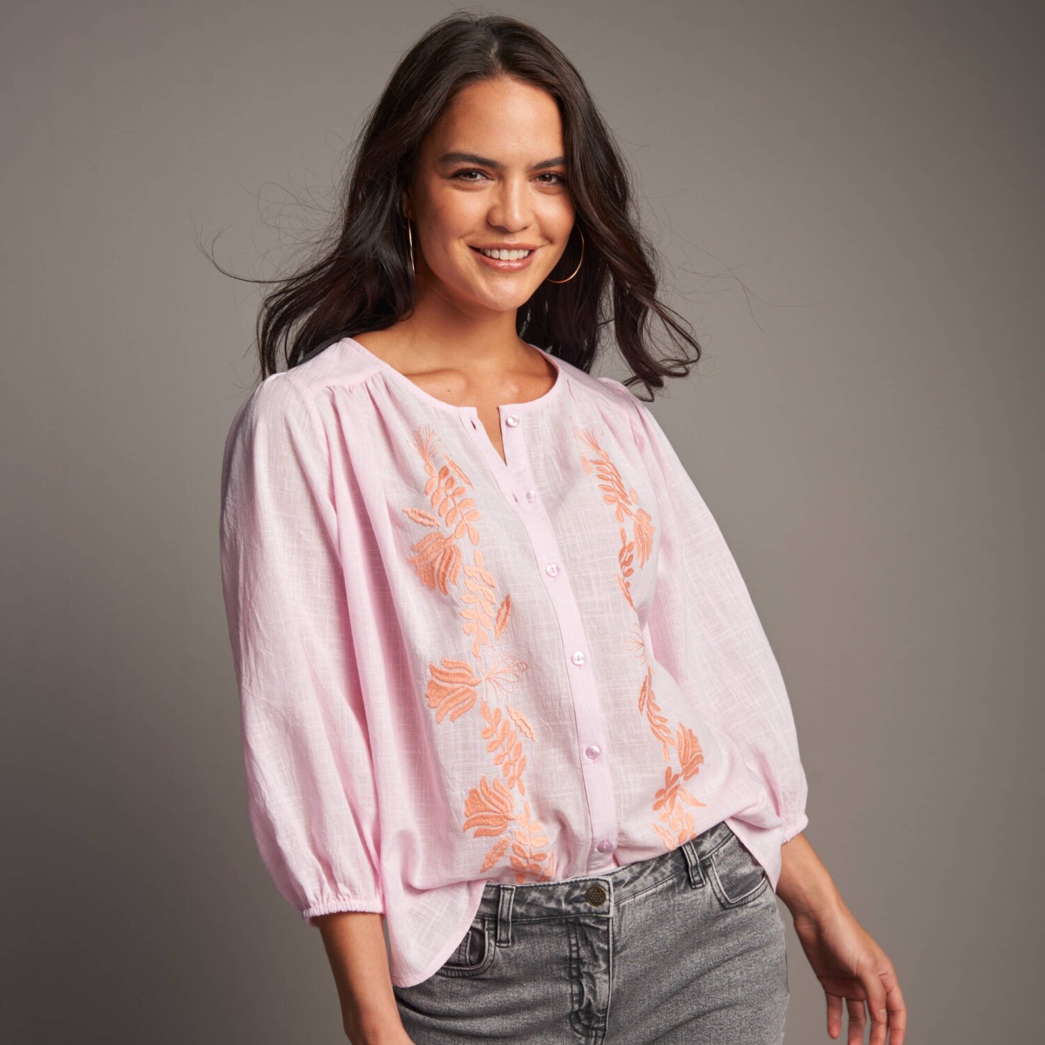 Елегантна блуза-сорочка з м'якого, струмливого трикотажу з квітковим принтом та однотонною вставкою. Злегка приталена, з декоративними ґудзиками на горловині - чудово підкреслює фігуру!