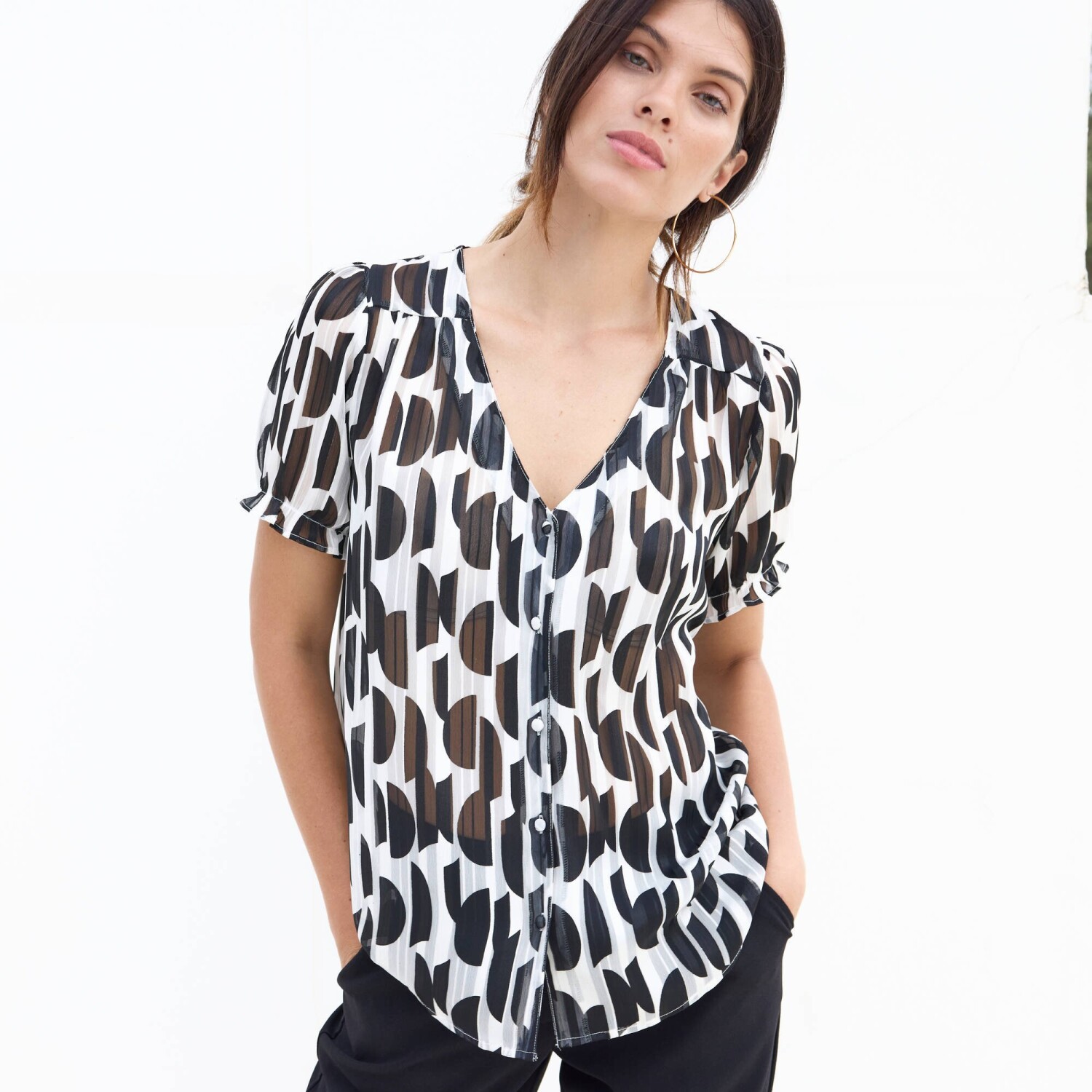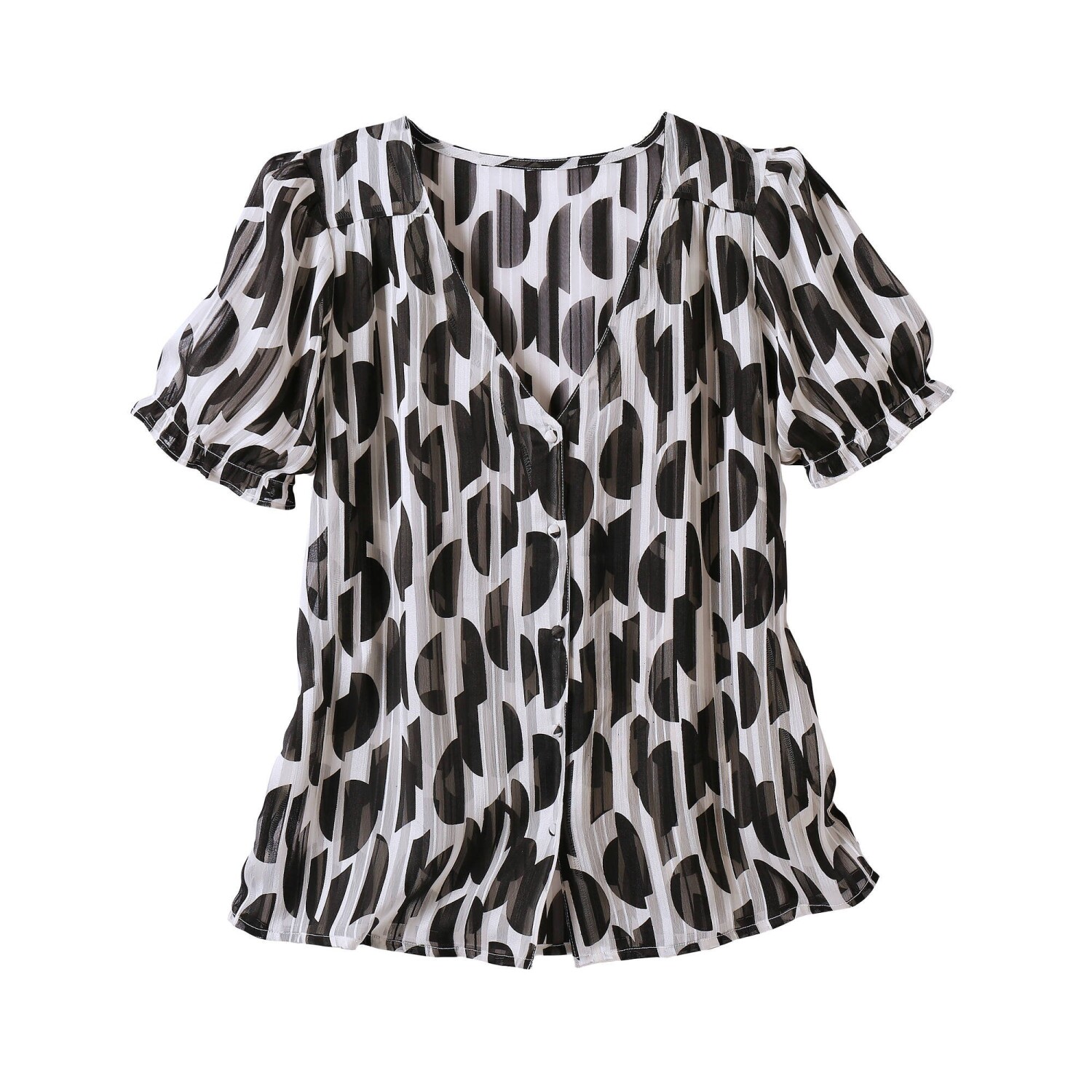 Наш головний акцент - блуза з двоколірним принтом. Округлий V-подібний виріз горловини. Передня планка на ґудзиках. Передній плечовий виріз з рюшами. Короткий рукав блузи на резинці. Поділ прямий. Можна прати у пральній машині.