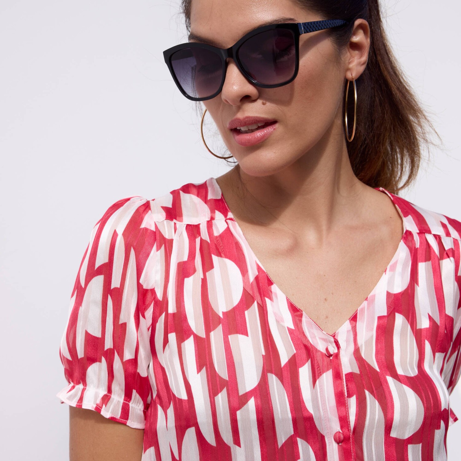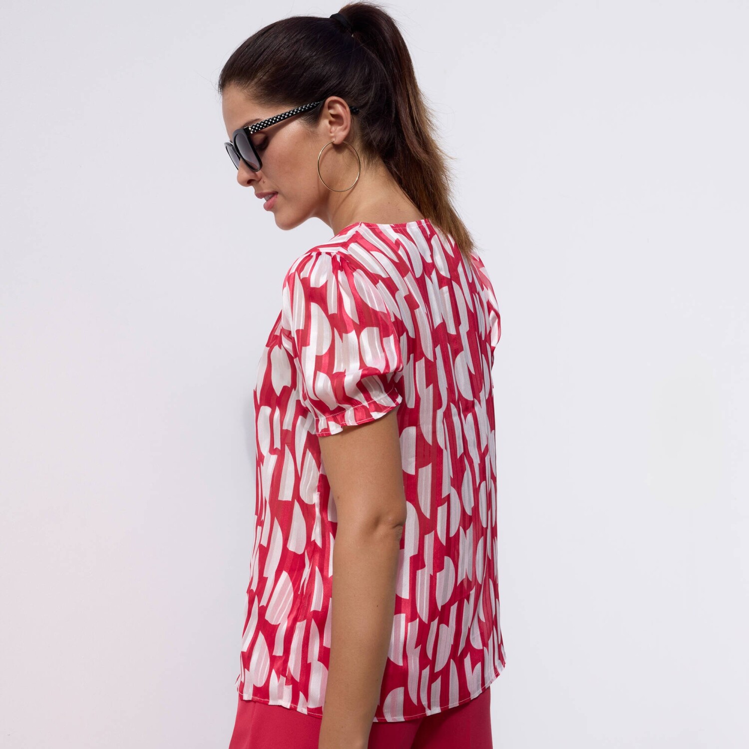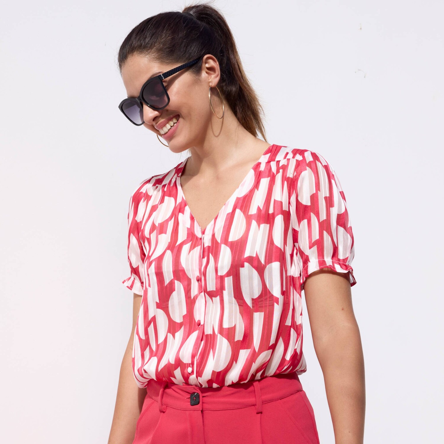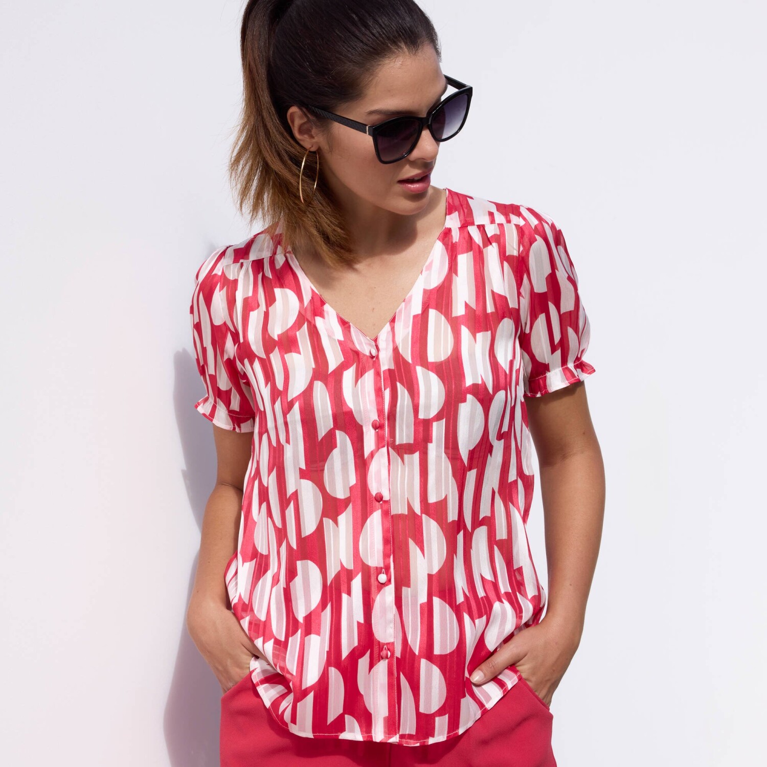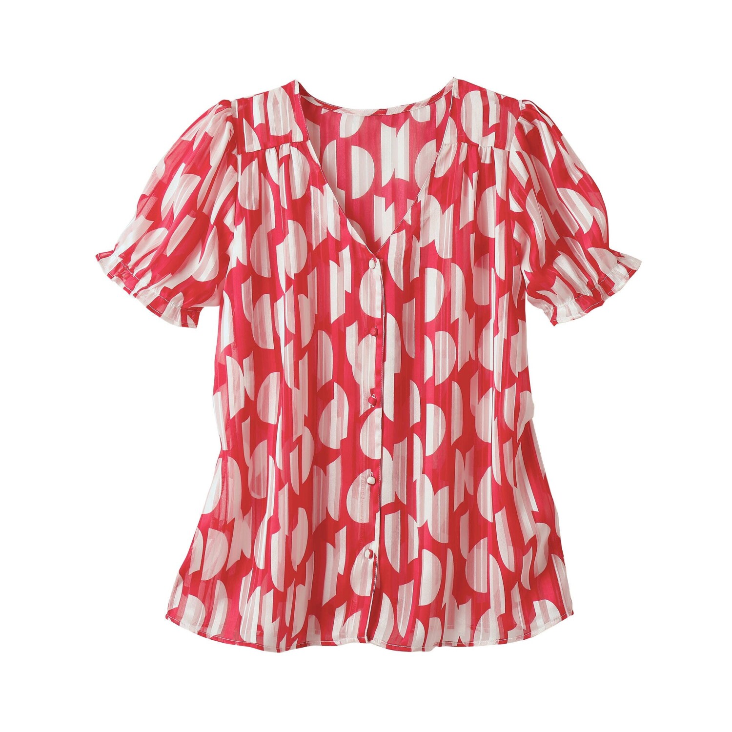 Стрейчева блуза з принтом подбає про жіночний образ. Повітряна та м'яка. Круглий виріз горловини з рюшами. Нагрудна кишеня (зліва). Застібка спереду на ґудзики. Короткий рукав, спущені плечі. Етно принт. Прямий поділ. Можна прати у пральній машині.