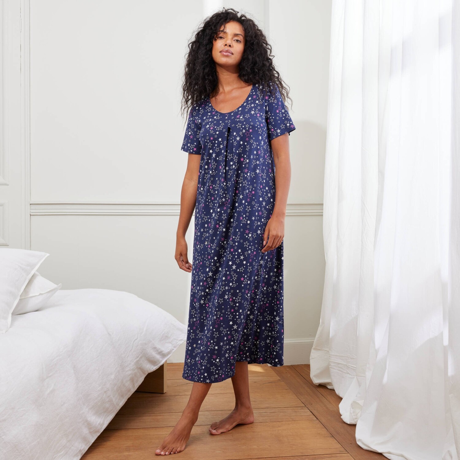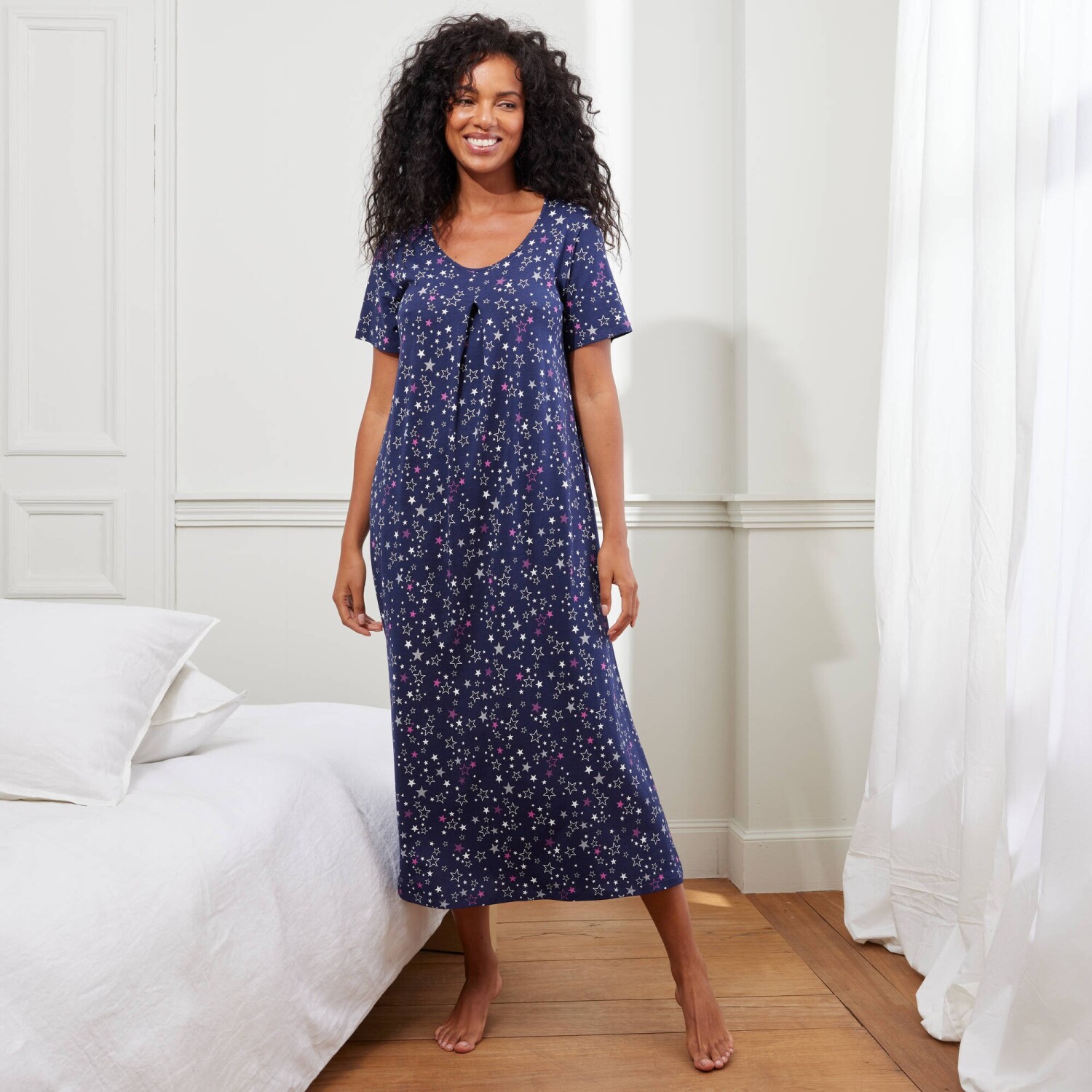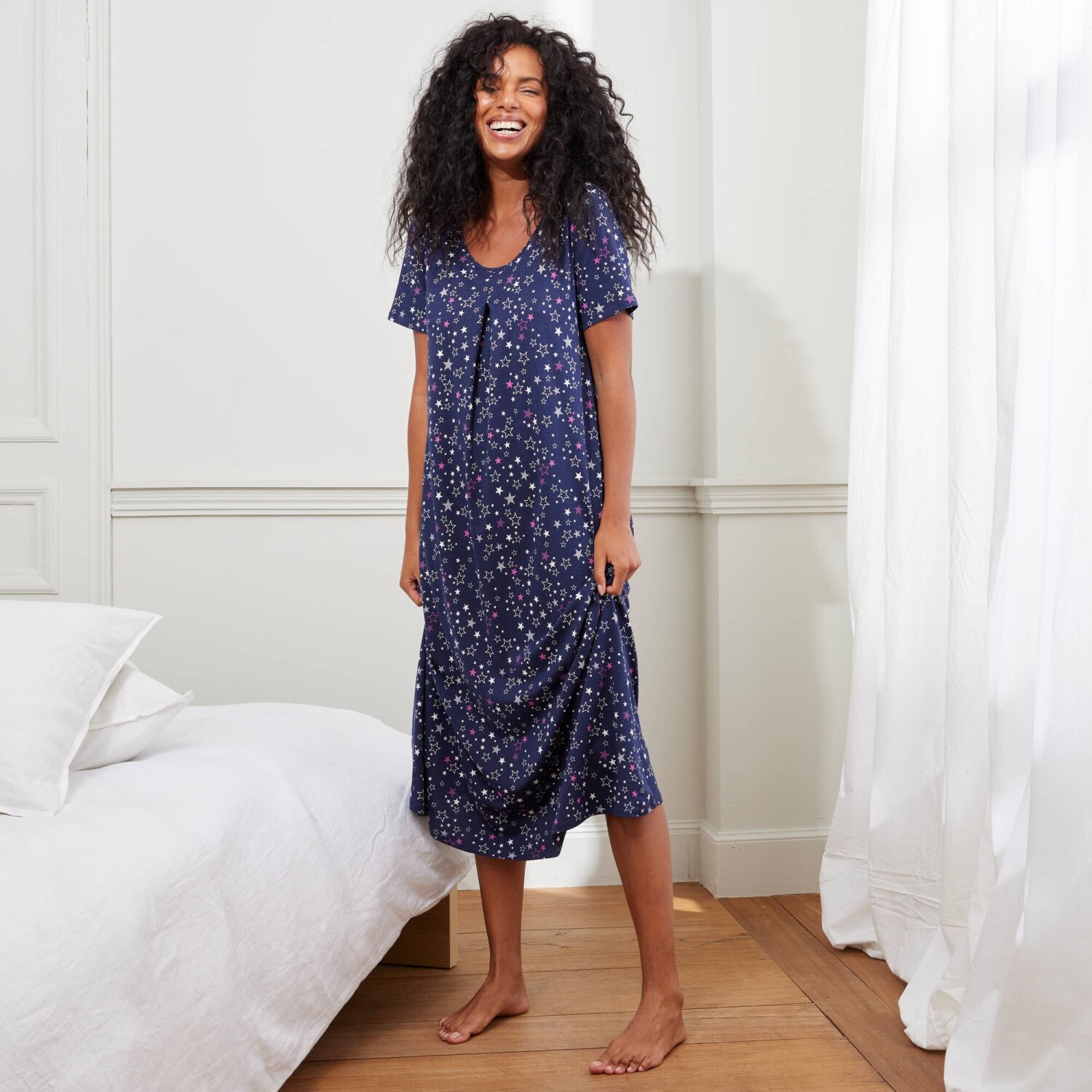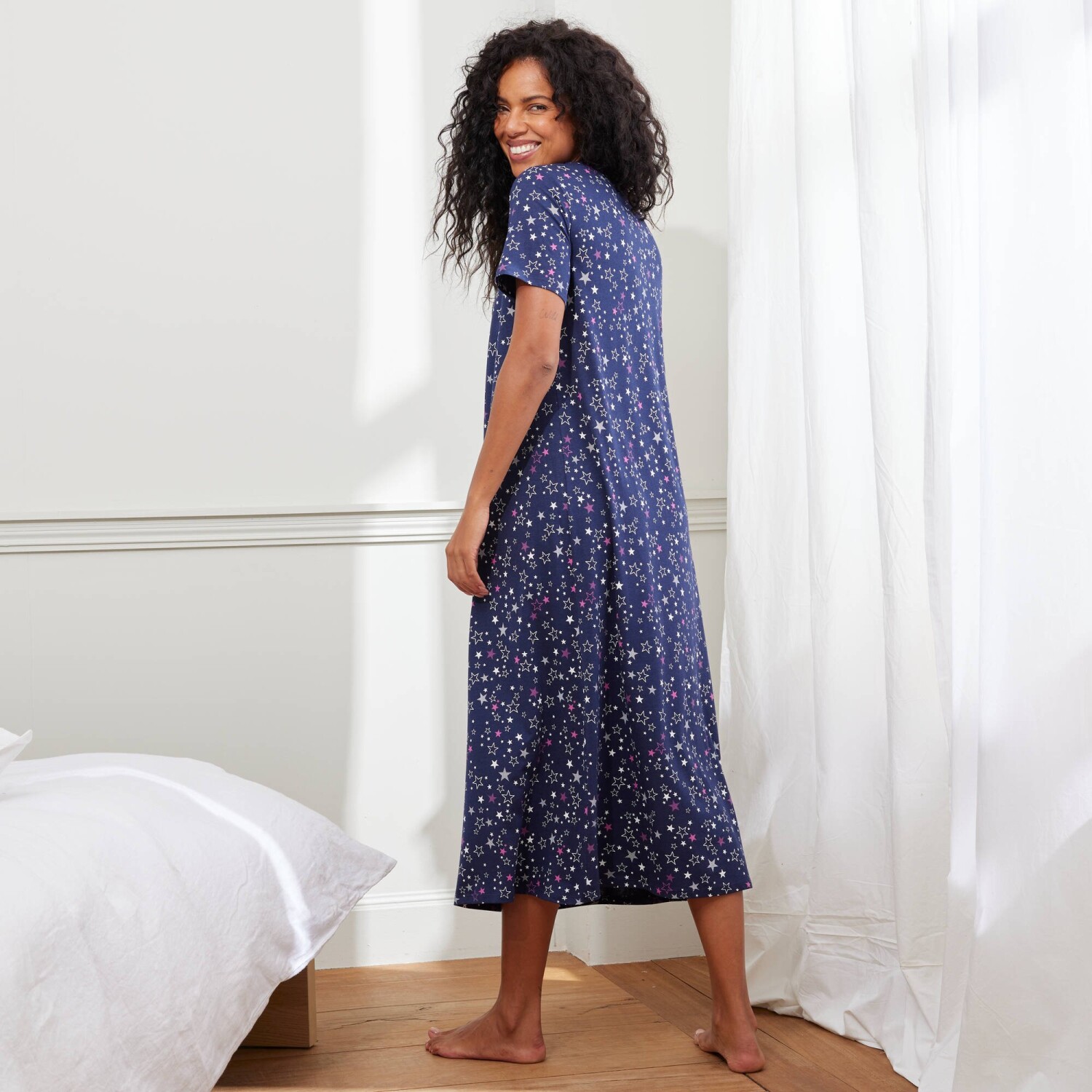 Важко встояти перед довгою нічною сорочкою з веселим принтом. Круглий виріз горловини. Короткі рукави. Прямий поділ з розрізами. Стандарт 100 згідно з Oeko-Tex (n° CQ 1216 / 3 IFTH). Цей знак позначає текстильні вироби, які пройшли лабораторні випробування на широкий спектр шкідливих речовин, і виріб є безпечним понад чинні стандарти. Можна прати в пральній машині.