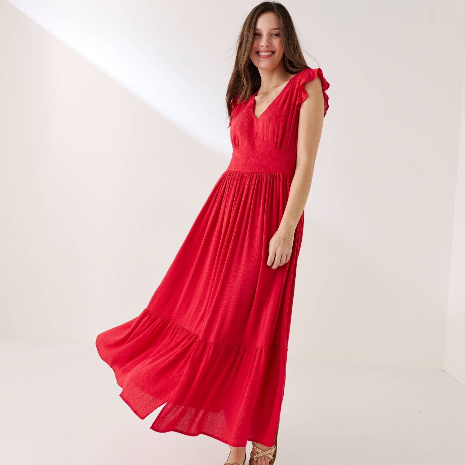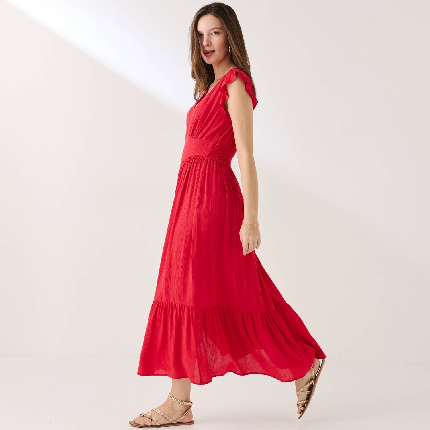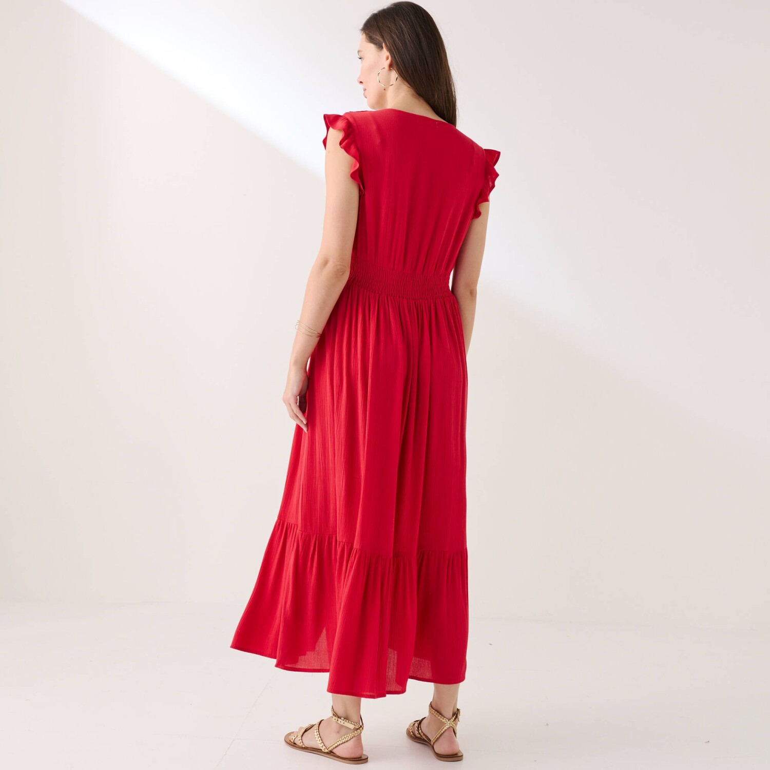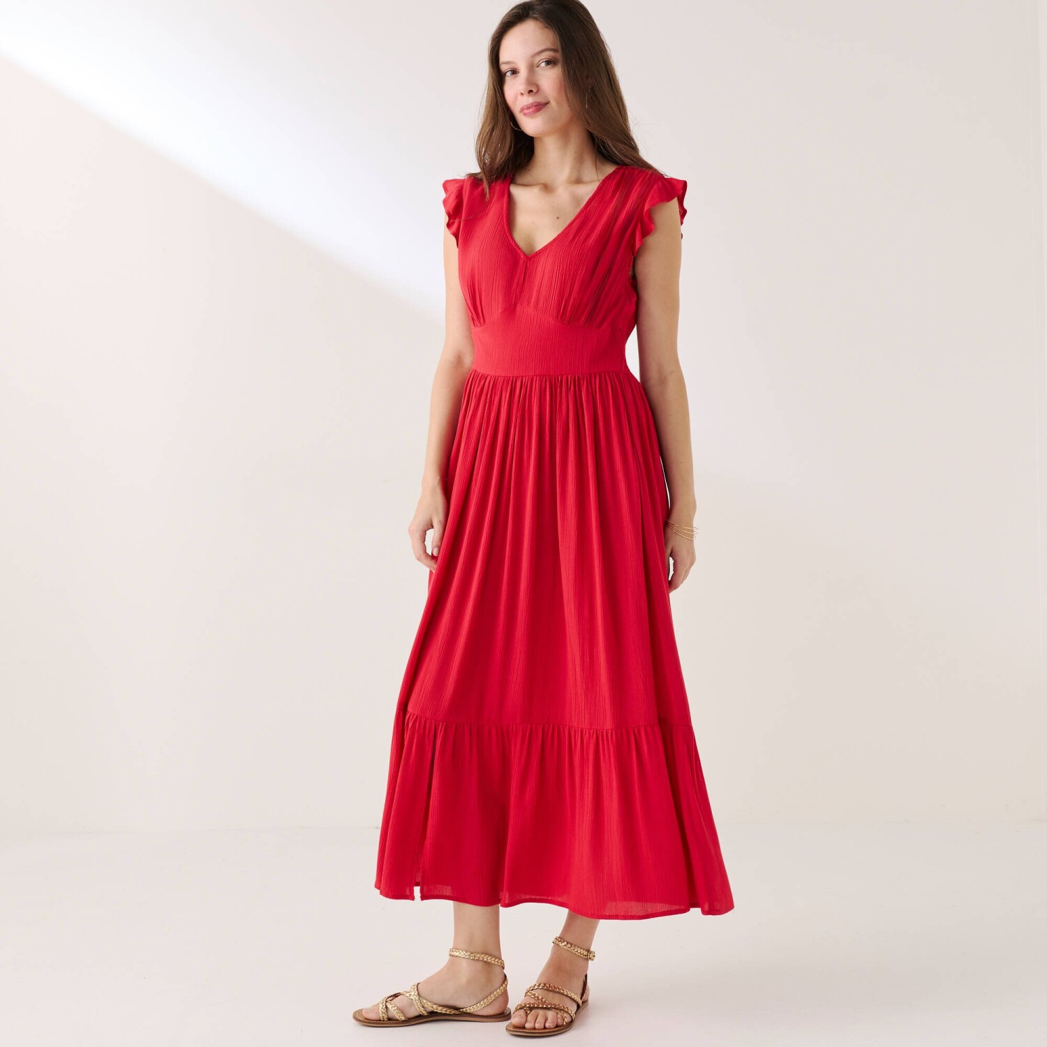 Гарна довга сукня з V-подібним вирізом та принтом додасть вам образу бохо. Виготовлена з повітряної, тонкої в'язки. V-подібний виріз спереду. Короткі рукави-метелики. Збірка на плечах. Закруглений виріз під грудьми спереду + центральна складка. Кулиска ззаду. Еластичний виріз ззаду. Ширший крій. Цей виріб виготовлено з віскози Lenzing™ EcoVero™. Екологічна віскоза – це матеріал, виготовлений з целюлози з лісів сталого управління. Процес виробництва вимагає менше води та енергії. Можна прати в пральній машині.