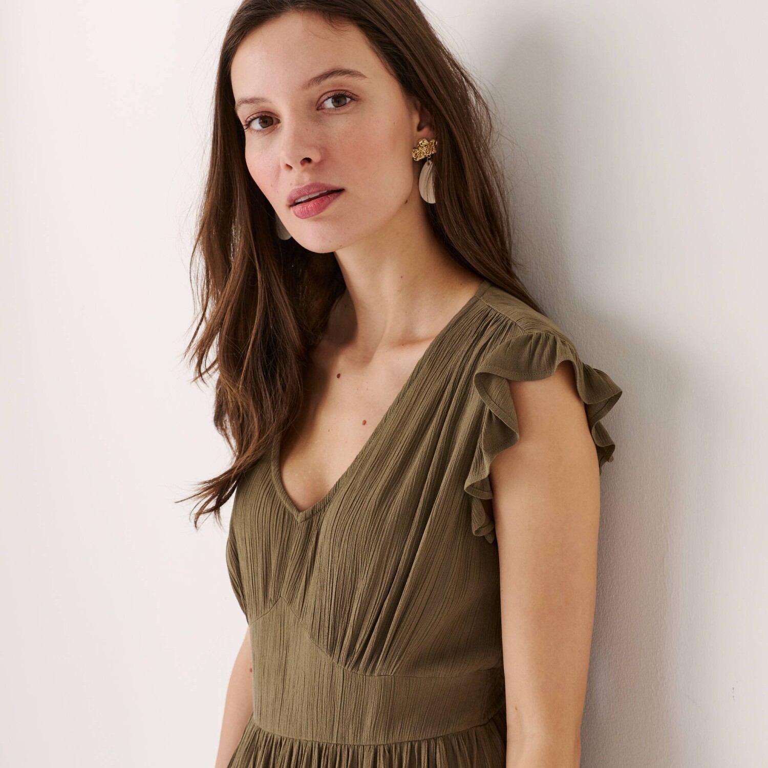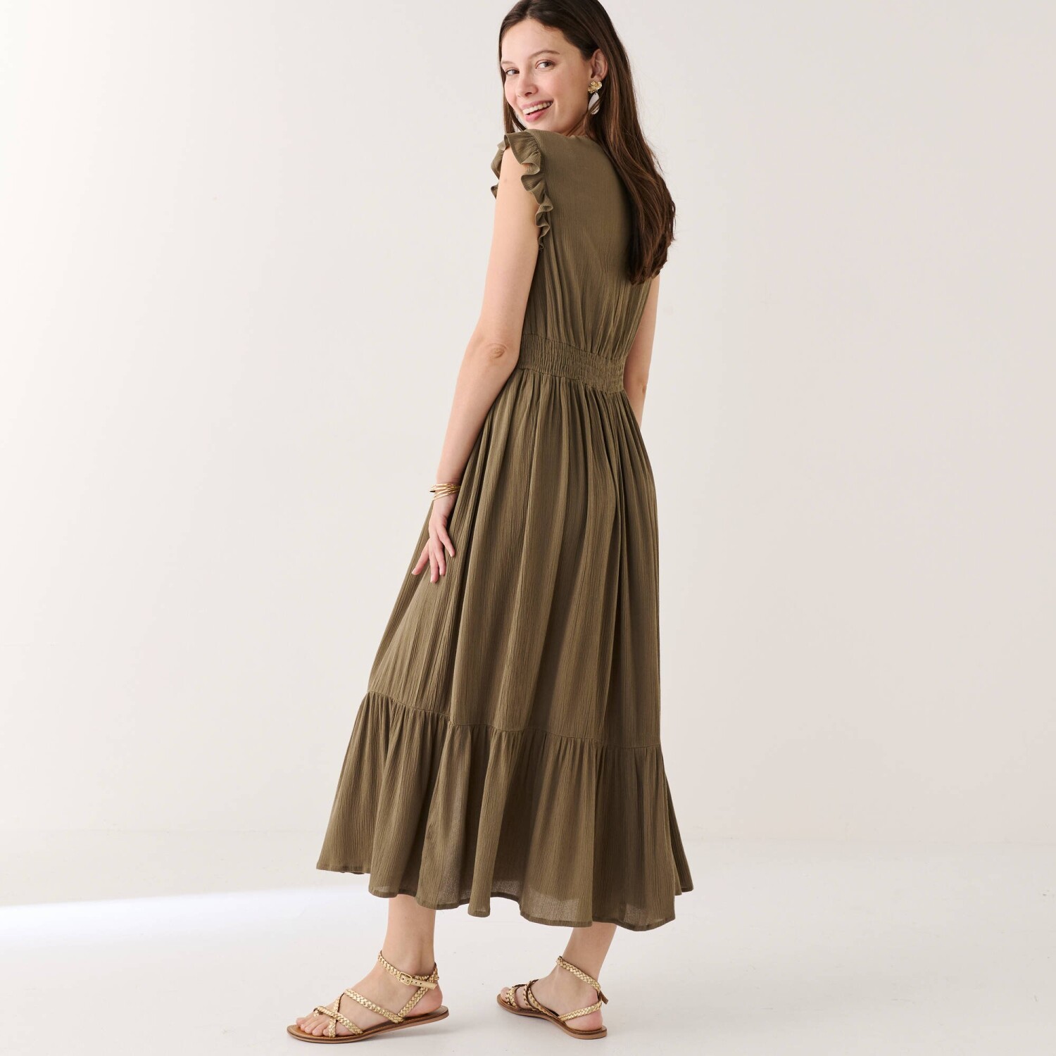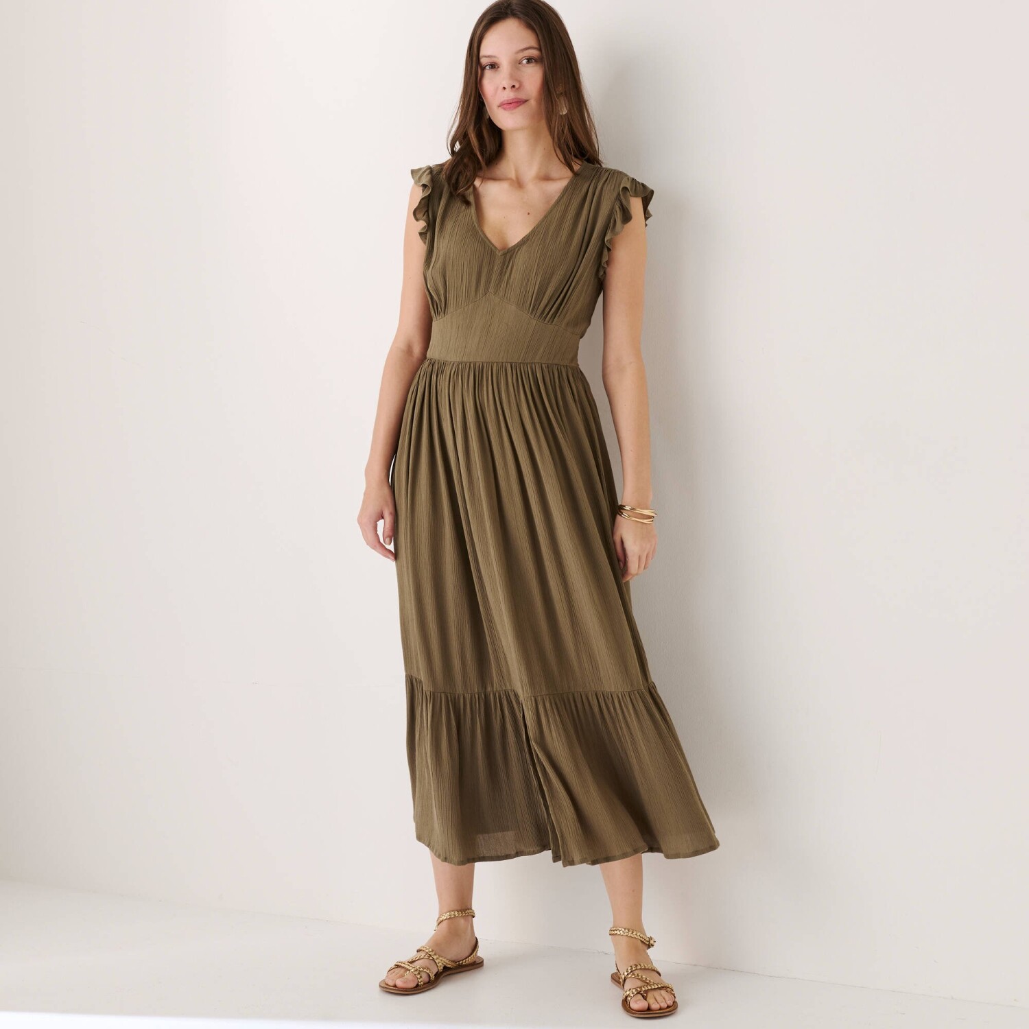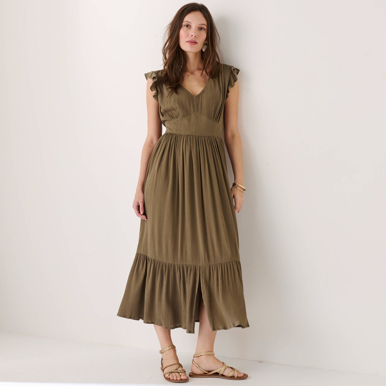 Смугаста сукня міді з поясом та V-подібним вирізом