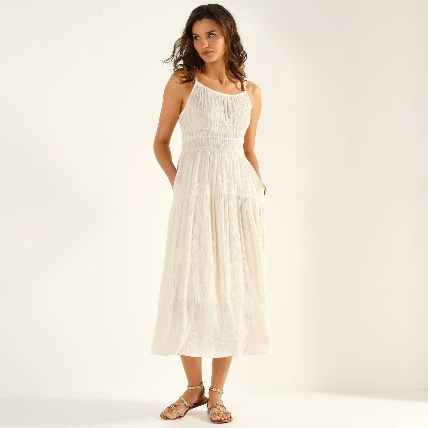 Сукня-сорочка без рукавів підкреслить вашу жіночність. Без рукавів. Ґудзики з ефектом рогу. V-подібний виріз сорочки. Спущені плечі. 2 фальшиві нагрудні кишені з клапаном. Вирізи спереду та ззаду та застібка на пряжку. Вирізи ззаду. Можна прати в пральній машині.