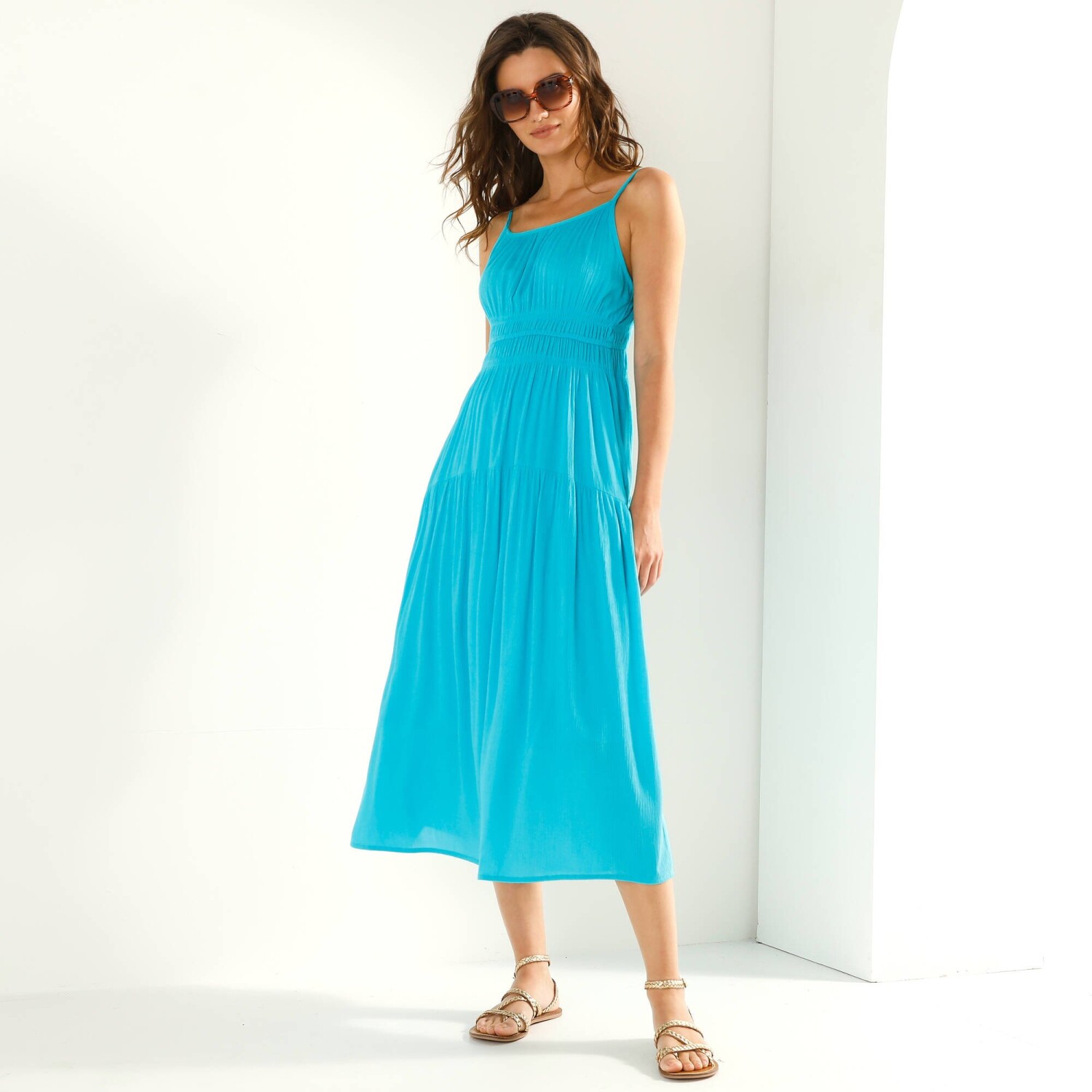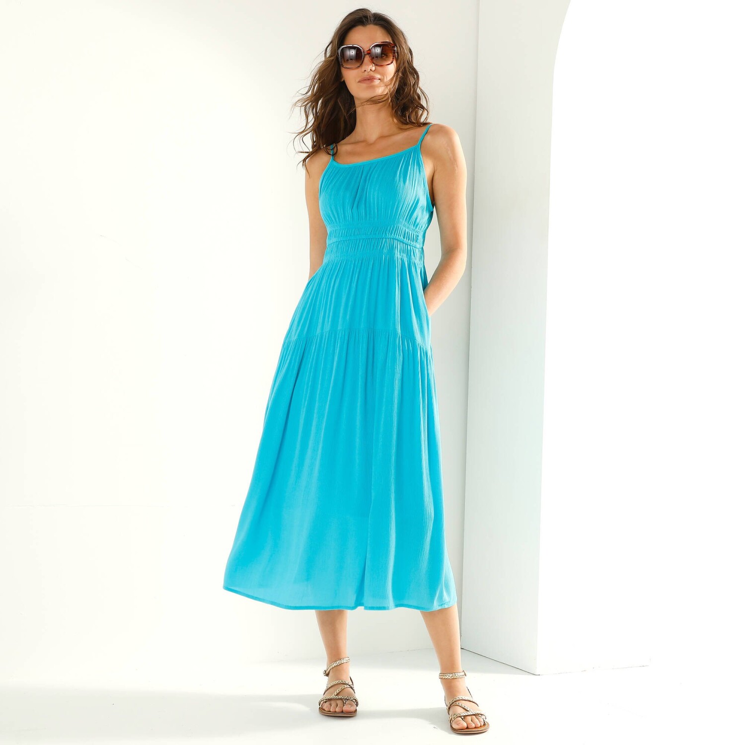 Довга однотона сукня на вузьких бретельках, що підкреслюють жіночну фігуру. Розкльошений крій. Круглий виріз горловини з рюшами. Вузькі регульовані бретельки. Еластичний пояс. 2 кишені в бокових швах. Широкий закруглений рюш та рюші по низу. Прямий поділ. Цей виріб виготовлено з віскози Lenzing™ EcoVero™. Екологічна віскоза – це матеріал, виготовлений з целюлози з лісів сталого управління. Процес виробництва потребує менше води та енергії. Можна прати в пральній машині.