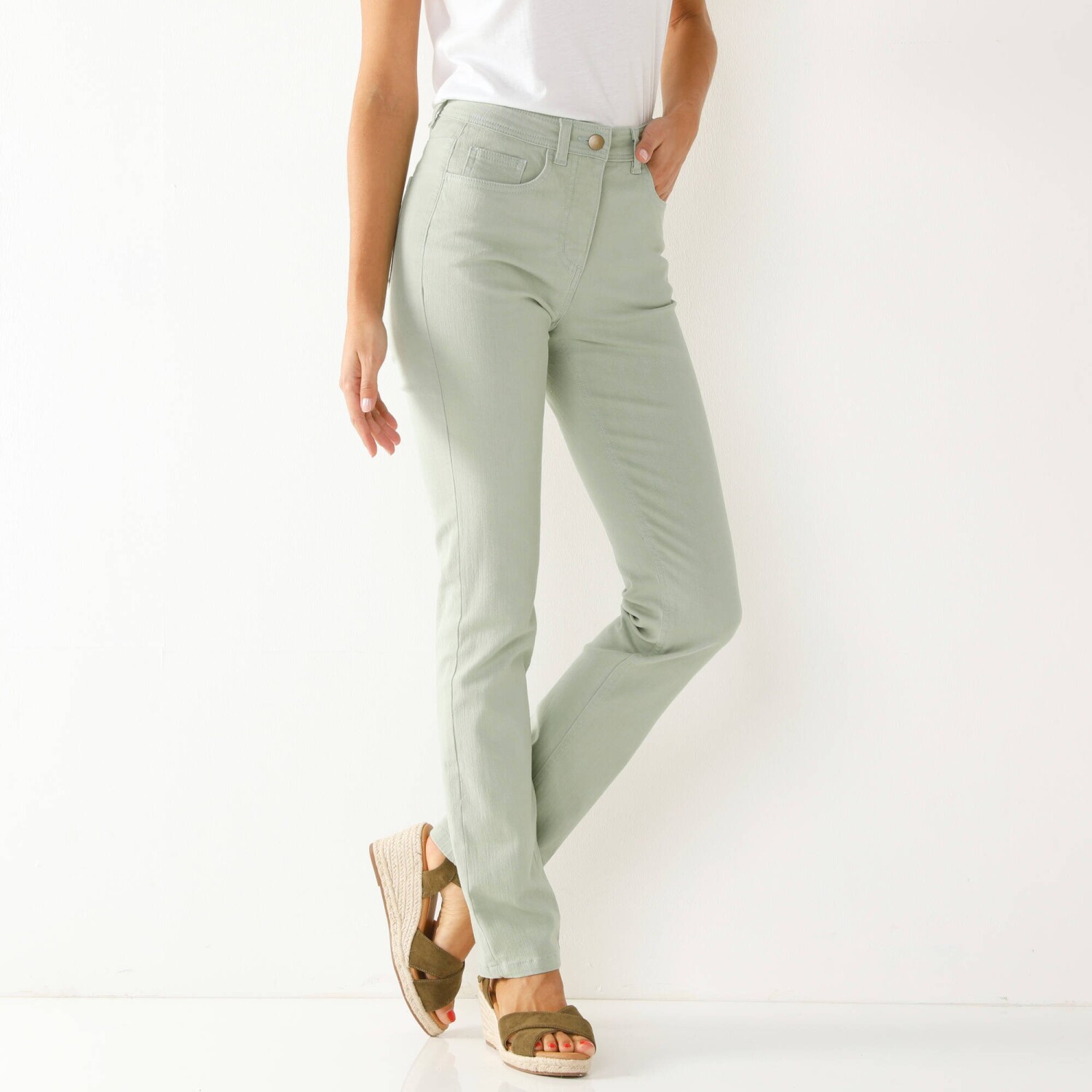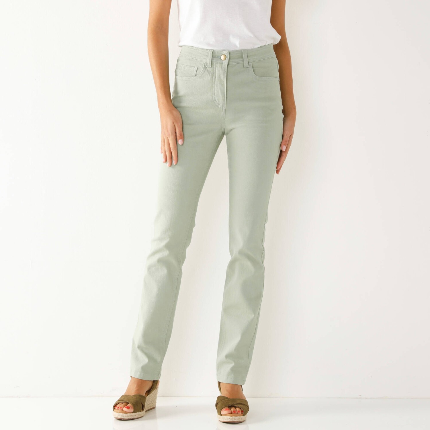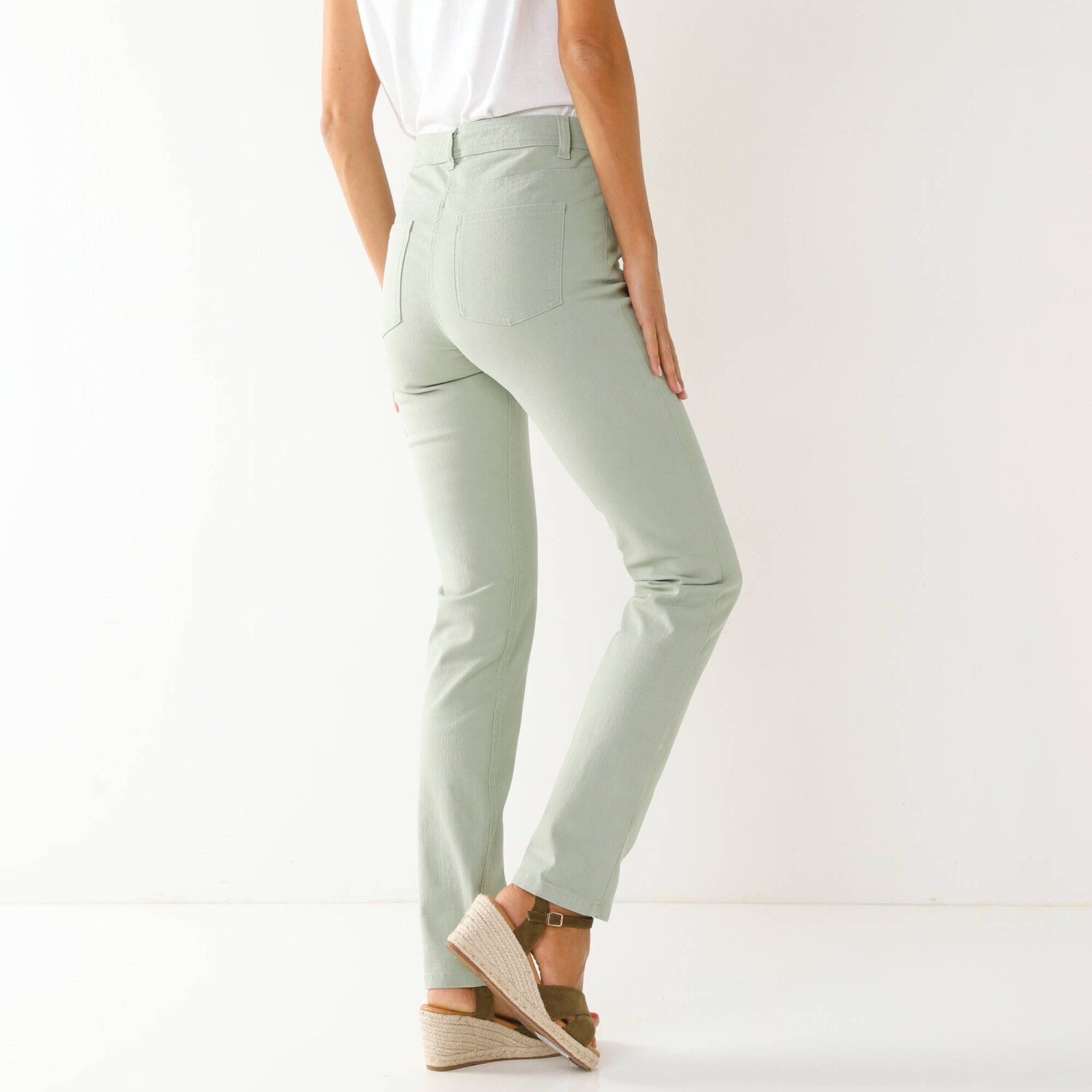 Ви ніколи не помилитеся з брюками прямого крою. Стандартна висота талії. Прямий крій підходить для будь-якої фігури. Петлі для пояса на талії, з регульованою гумкою з боків спереду і ззаду. Внутрішнє регулювання за допомогою еластичної резинки та ґудзика. Посилення талії спереду для ефекту плаского живота. Застібка на блискавку та металевий ґудзик. 2 кишені та кишеня спереду. Піднята задня частина. 2 вшиті кишені ззаду. Сертифікат OEKO-TEX Made In Green. Окрім перевірки декількох сотень хімічних речовин, які сприяють високій безпеці, цей знак гарантує уважне ставлення до принципів виробництва та контрольовану соціальну практику. Можна прати в пральній машині.