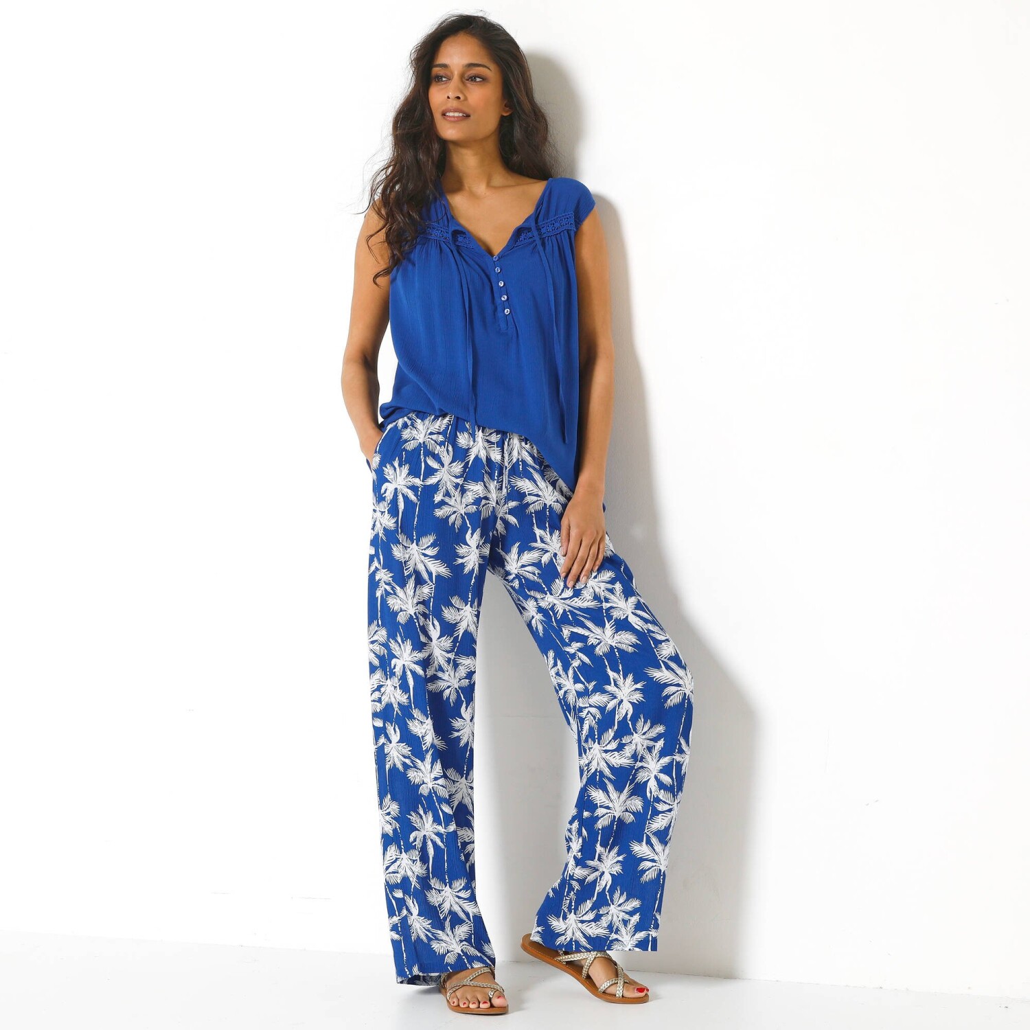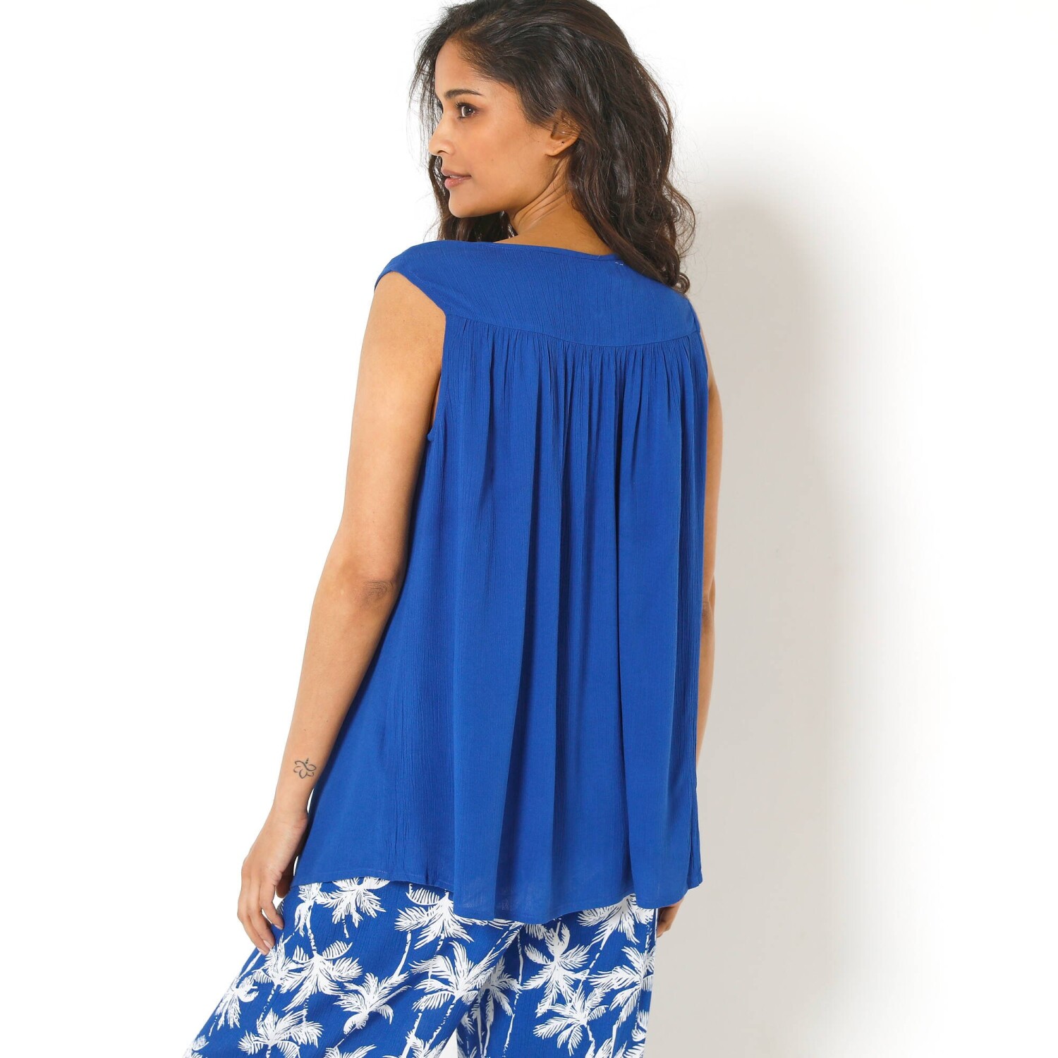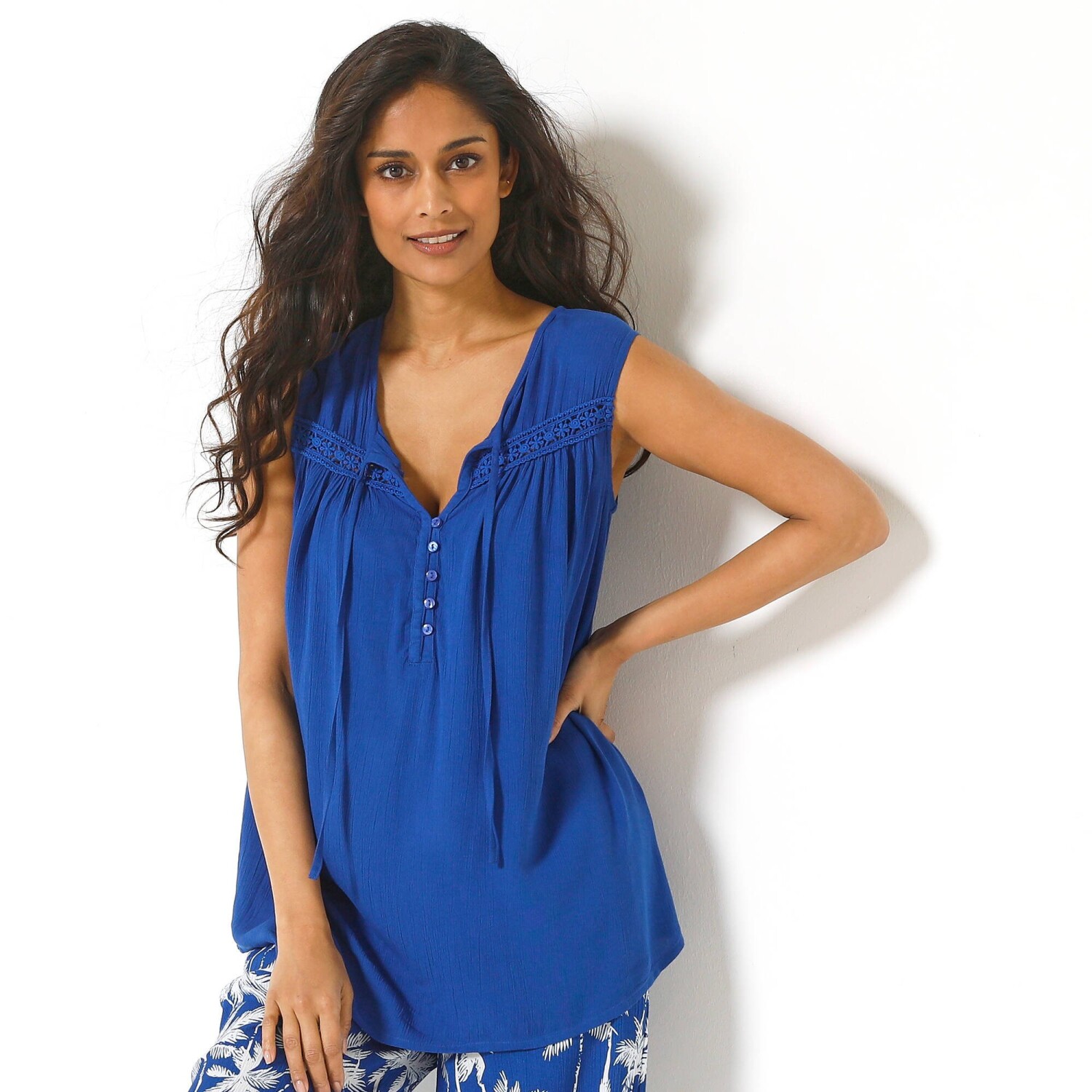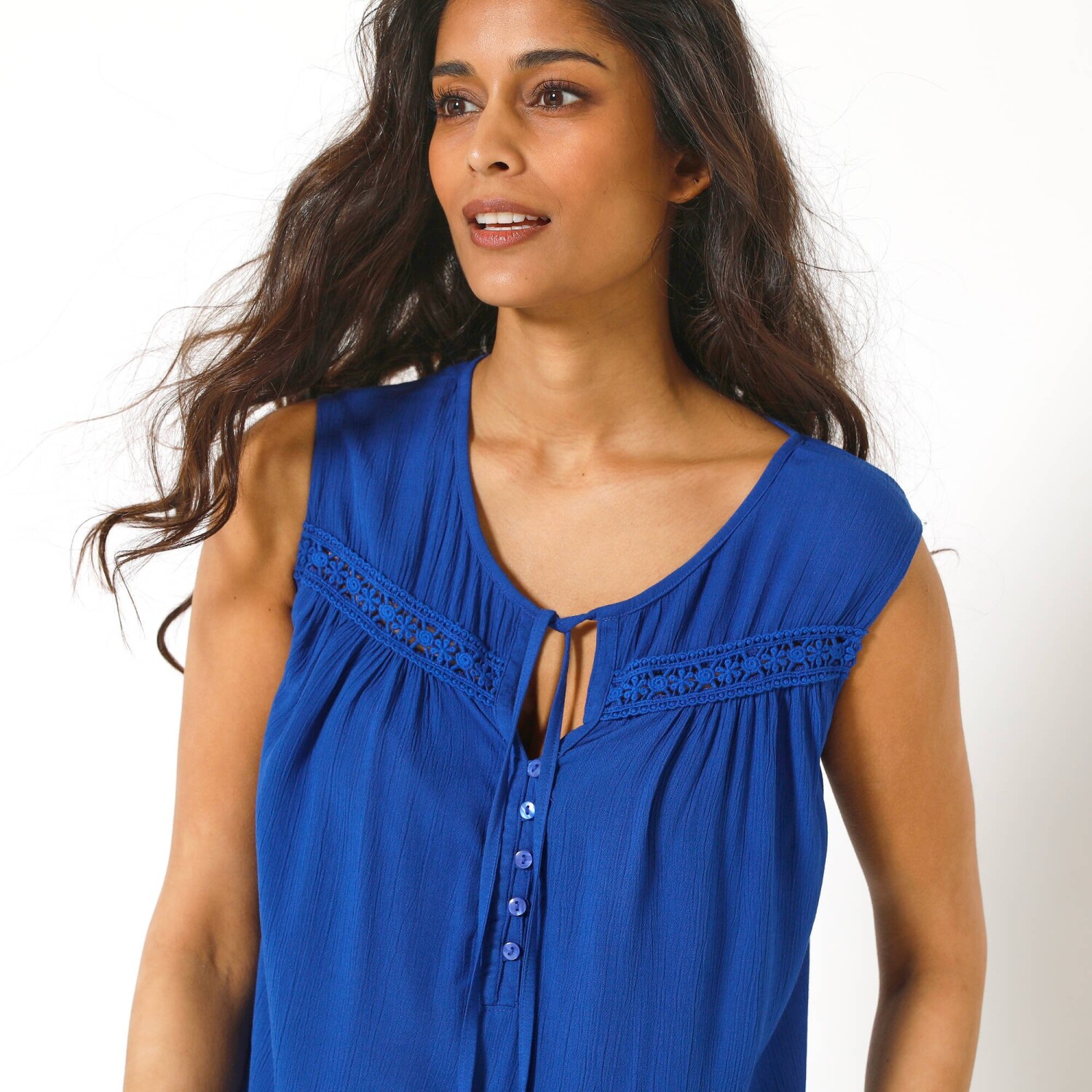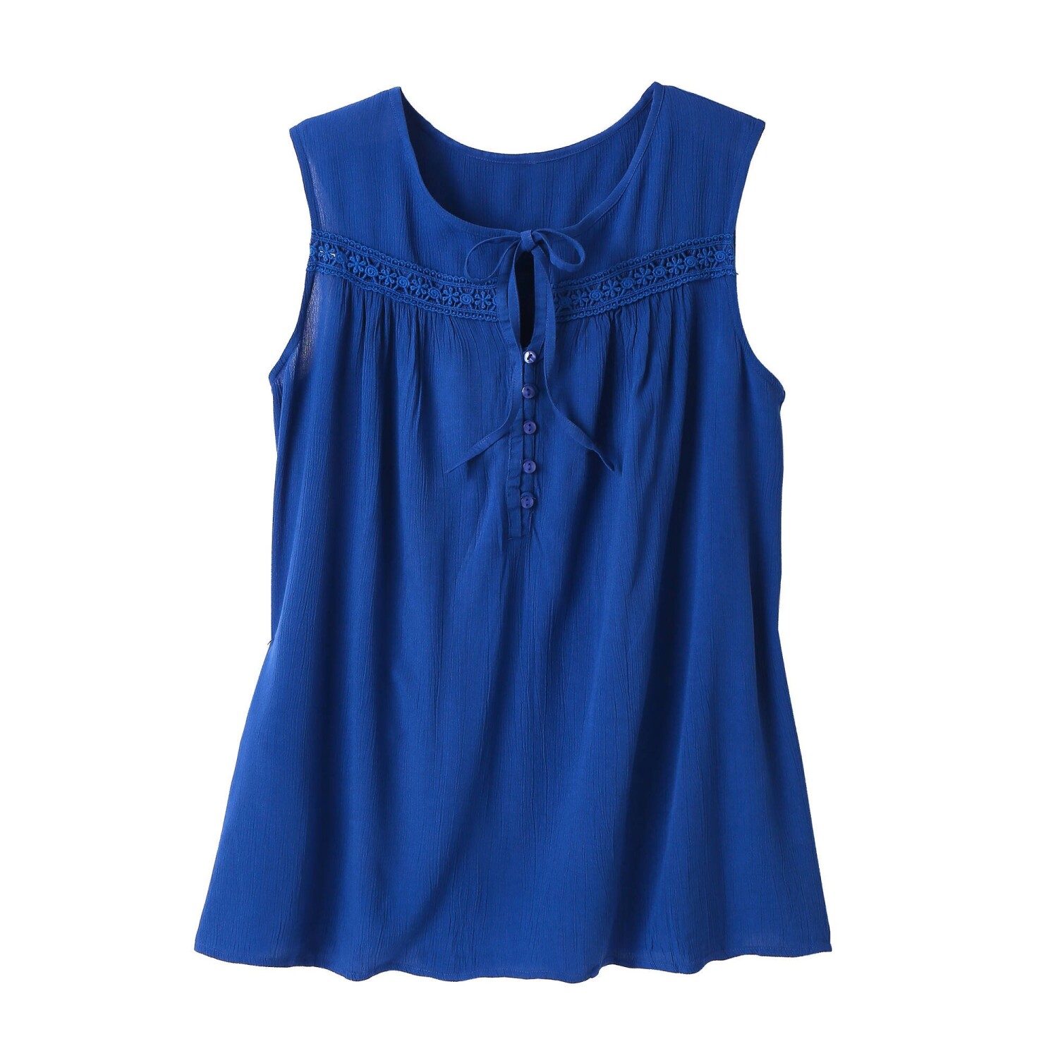 Креповий топ знає, як бути жіночним! Без рукавів, зі стильною планкою на ґудзиках та вишуканим вирізом горловини – спробуйте самі. Круглий виріз горловини з V-подібним вирізом на ґудзиках. Вставка з макраме з квітковим ажурним візерунком тон у тон та складками спереду. Виріз та складки ззаду. Широкий крій, прямий поділ. Можна прати в пральній машині.