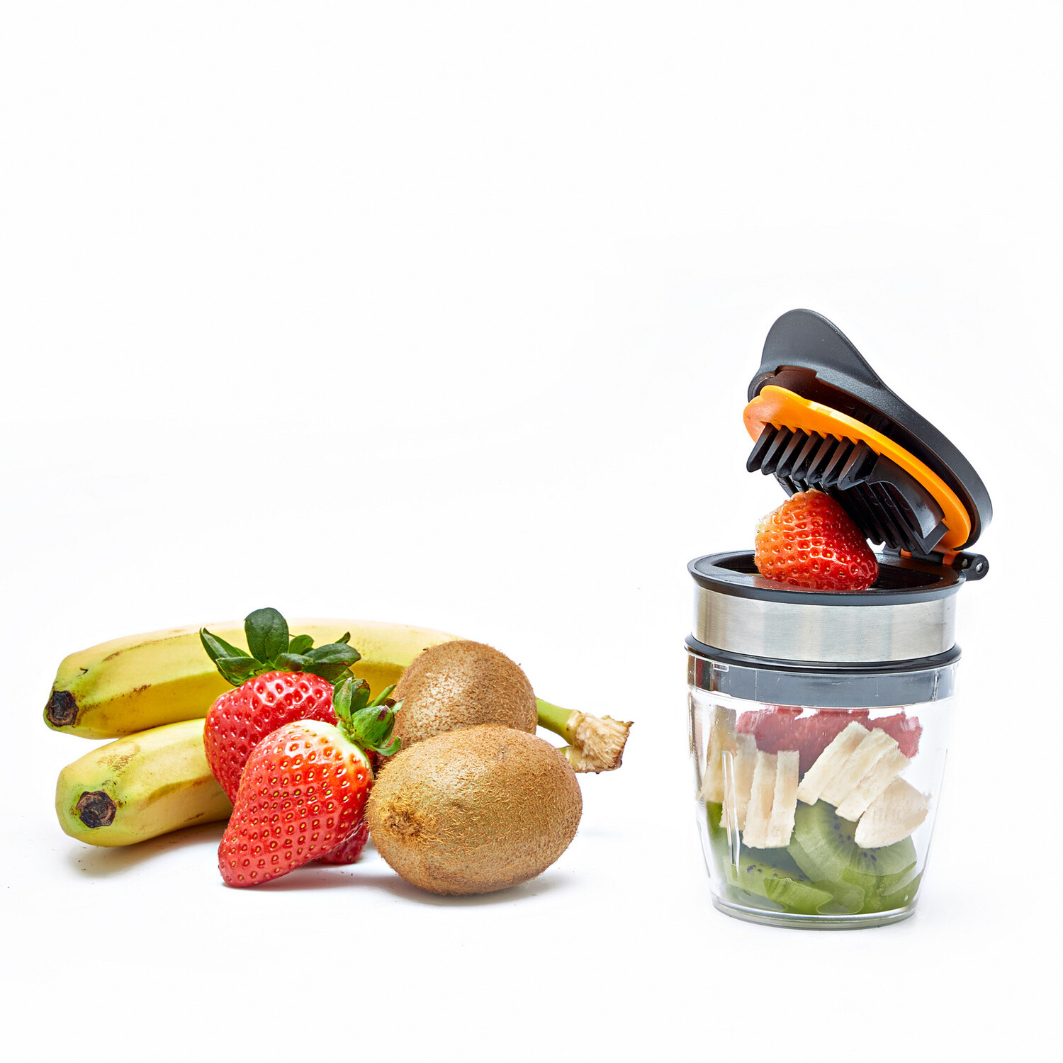 Вставте, натисніть, готово! Практична різачка для фруктів швидко, безпечно та рівномірно нарізає фрукти та овочі. Шматочки потрапляють у контейнер для збору. Також підходить для сухофруктів та горіхів. Рівномірно нарізані шматочки. Чисто та швидко. Нержавіюча сталь. Компактний розмір.