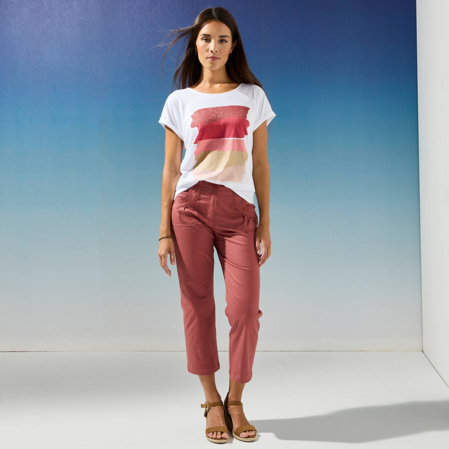 Виготовлена з невагомого трикотажу, комфортного в носінні. Барвистий принт. Круглий виріз горловини. Короткий рукав з ажурного мережива з хвилястою вставкою. Спереду мереживна вставка. Прямий поділ. Можна прати у пральній машині.