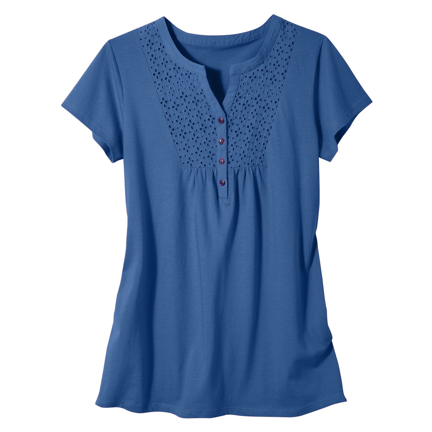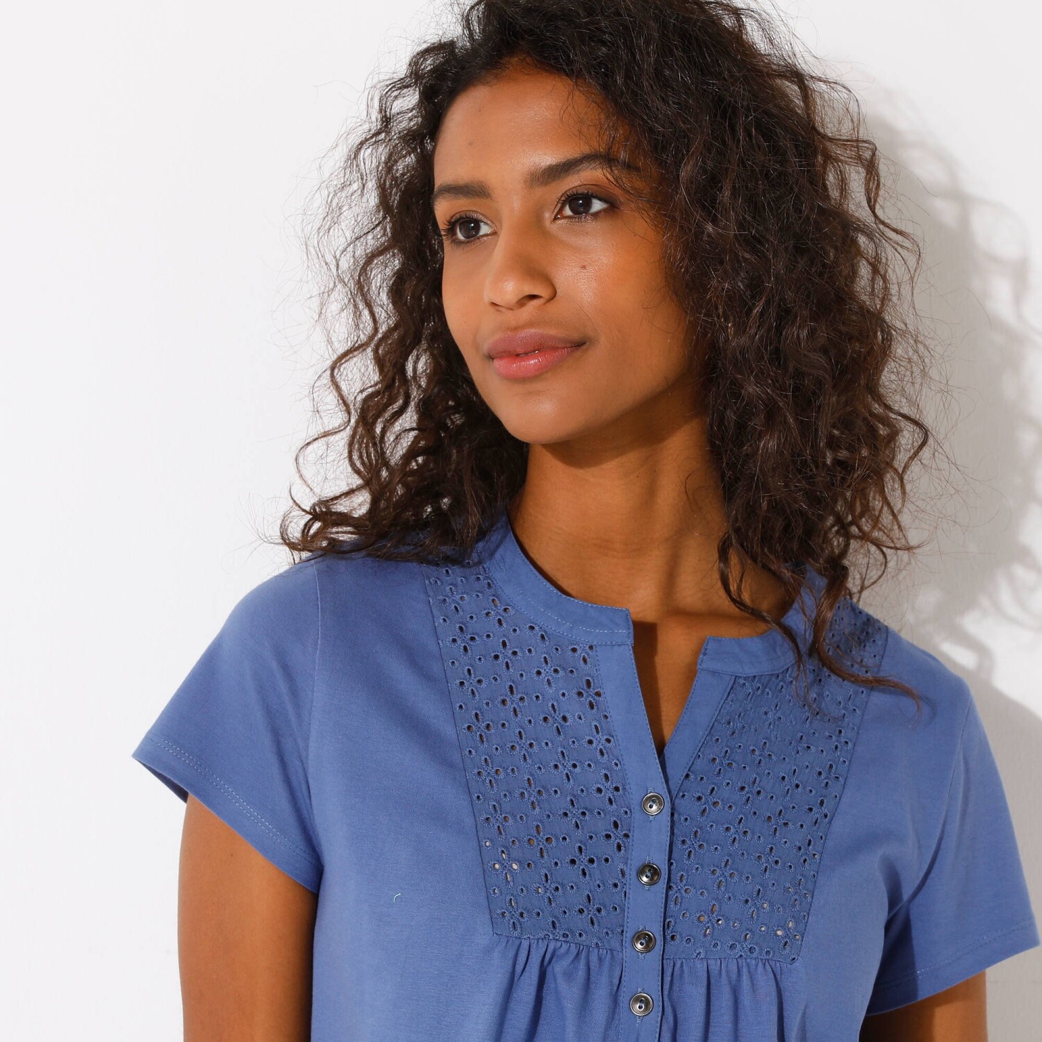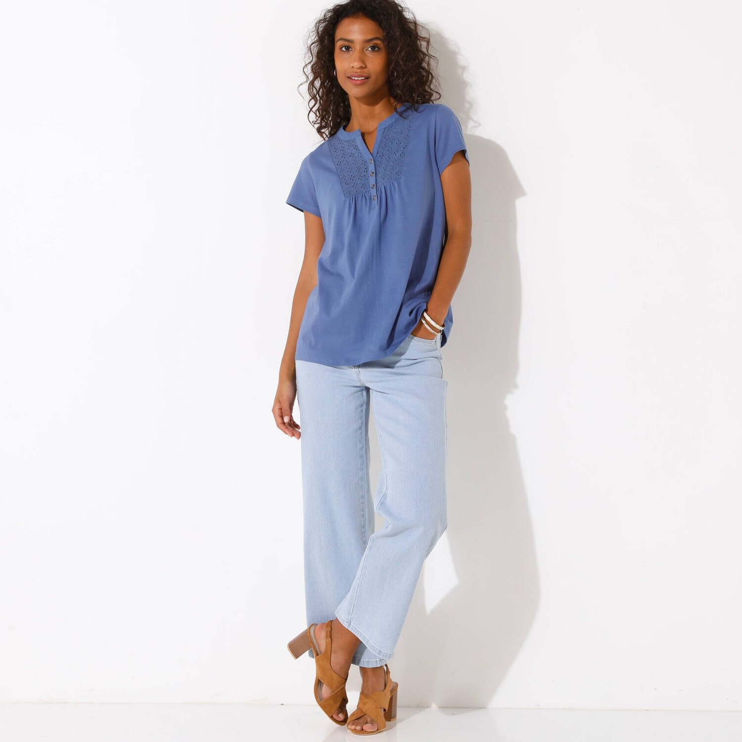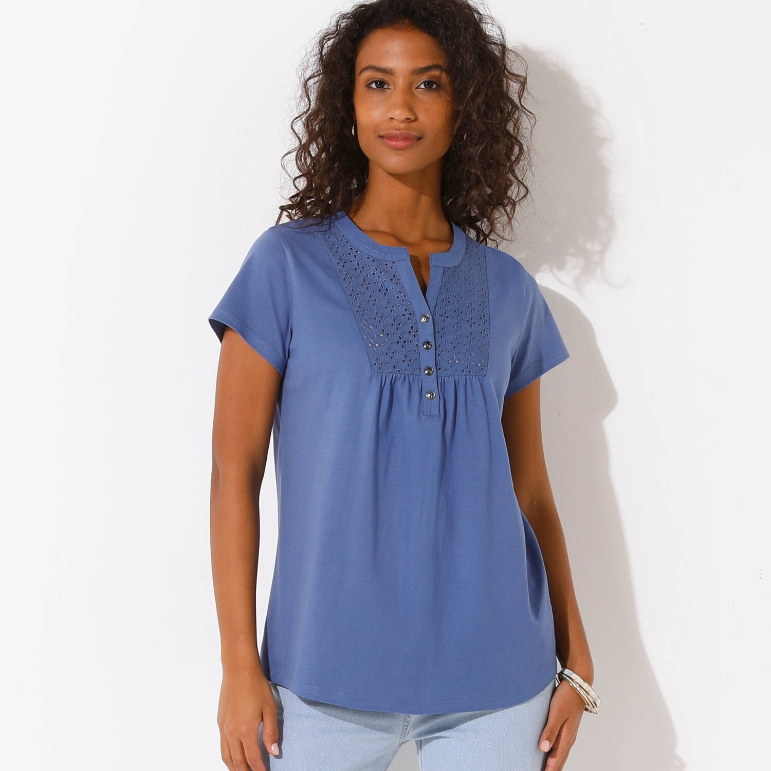 Квітковий принт прикрашає цю популярну футболку з туніським вирізом. Круглий виріз горловини з проймами та застібкою на ґудзики. Складки на плечах. Короткий рукав, спущені плечі. Тонкий повітряний трикотаж. Прямий поділ. Стильний квітковий принт. Стандарт Oeko-Tex 100 (n° CQ 1216 / 3 IFTH). Цей знак ідентифікує текстильні вироби, які були піддані лабораторним випробуванням на широкий спектр шкідливих речовин, і продукт є безпечним понад діючі стандарти. Можна прати у пральній машині.