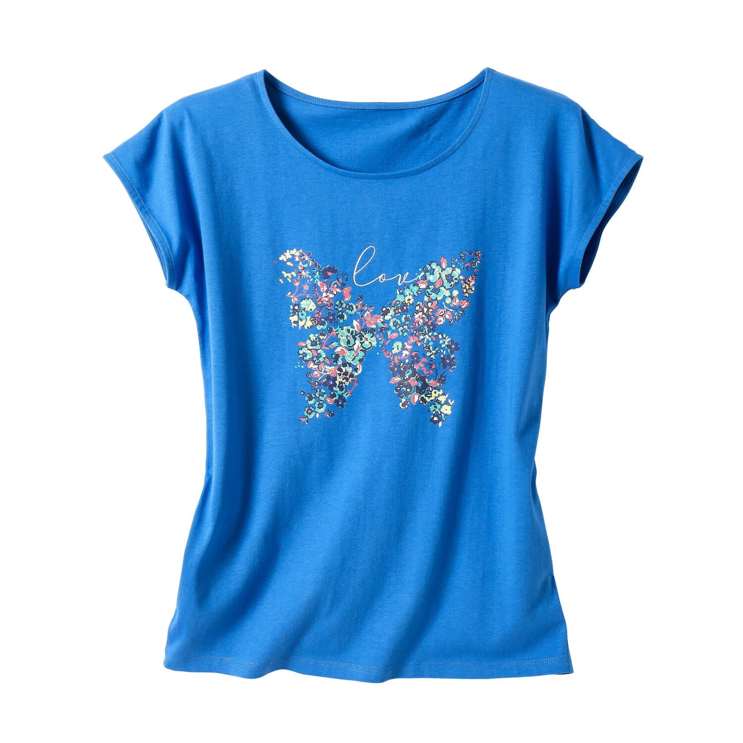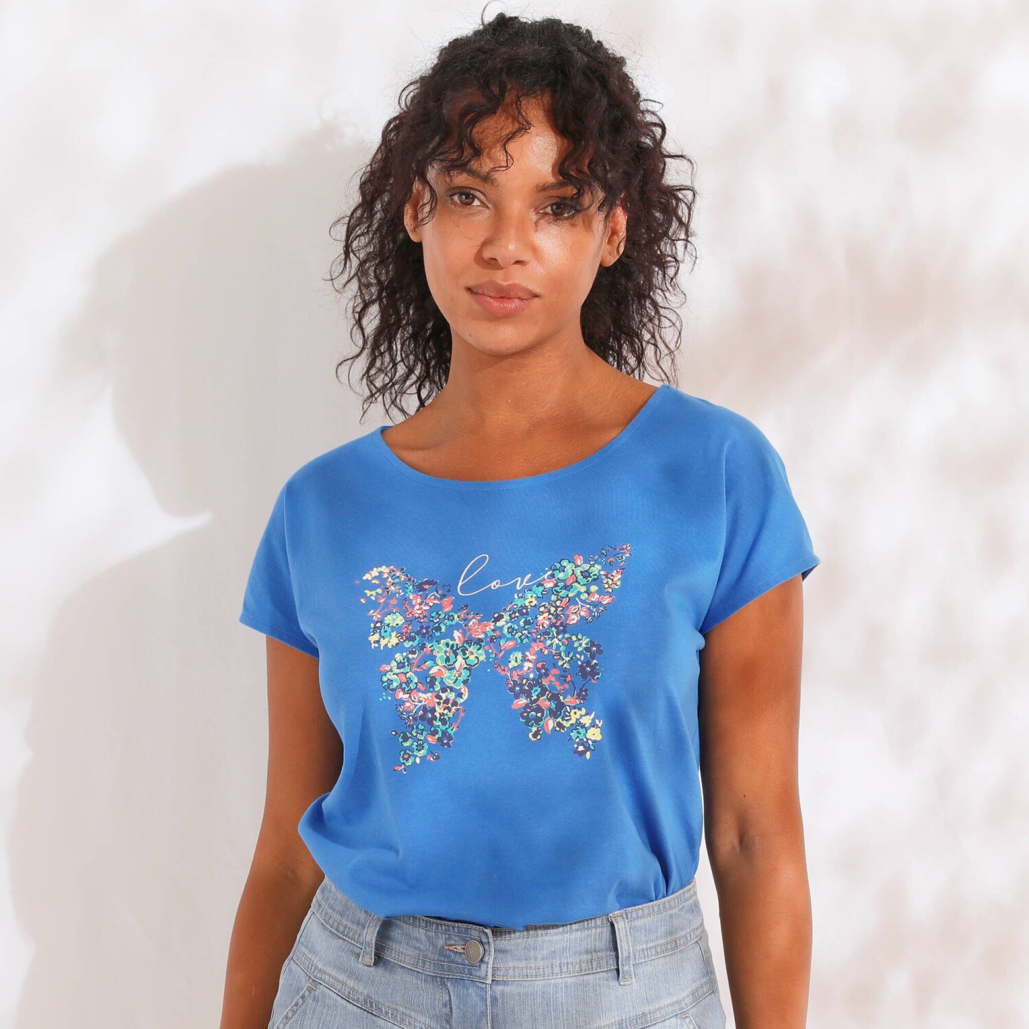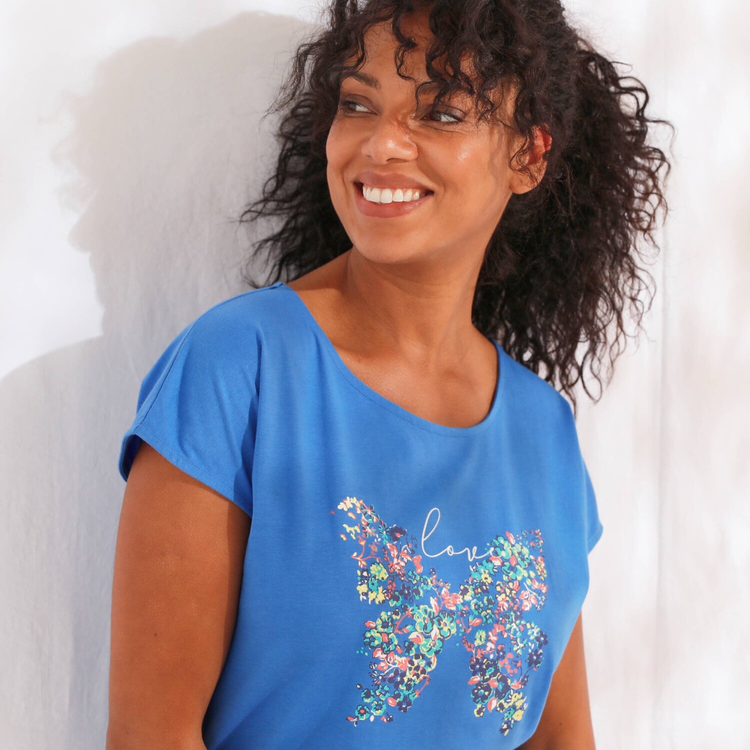 Футболка з принтом метелика посередині створює стильний образ. Круглий виріз горловини. Короткі рукави. Спущені плечі. Широкий, сучасний крій. Принт метелика посередині спереду. Прямий поділ. Стандарт 100 згідно з Oeko-Tex (n° CQ 1216 / 3 IFTH). Цей знак вказує на текстильні вироби, які пройшли лабораторні випробування на широкий спектр шкідливих речовин, і виріб є безпечним понад чинні стандарти. Можна прати в пральній машині.