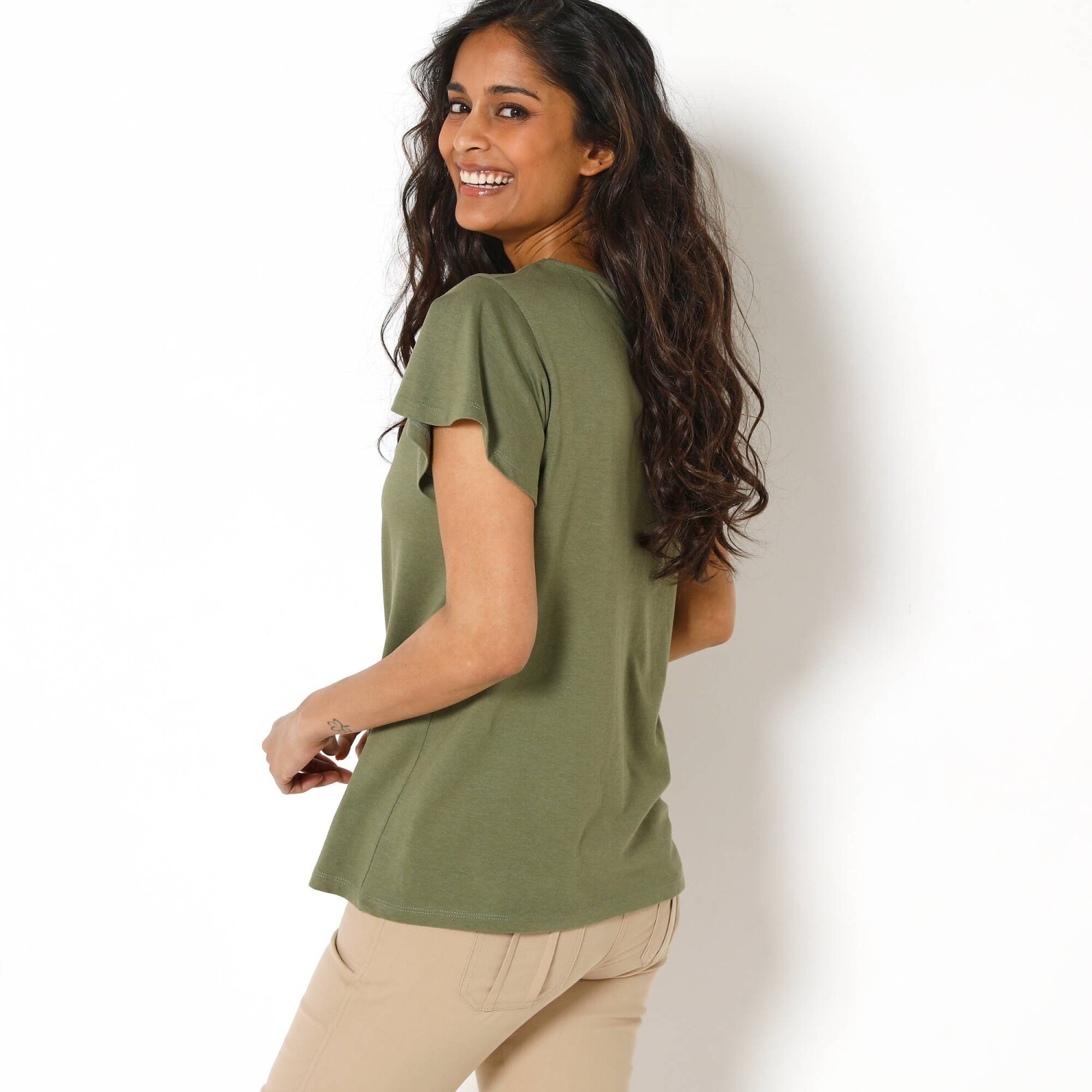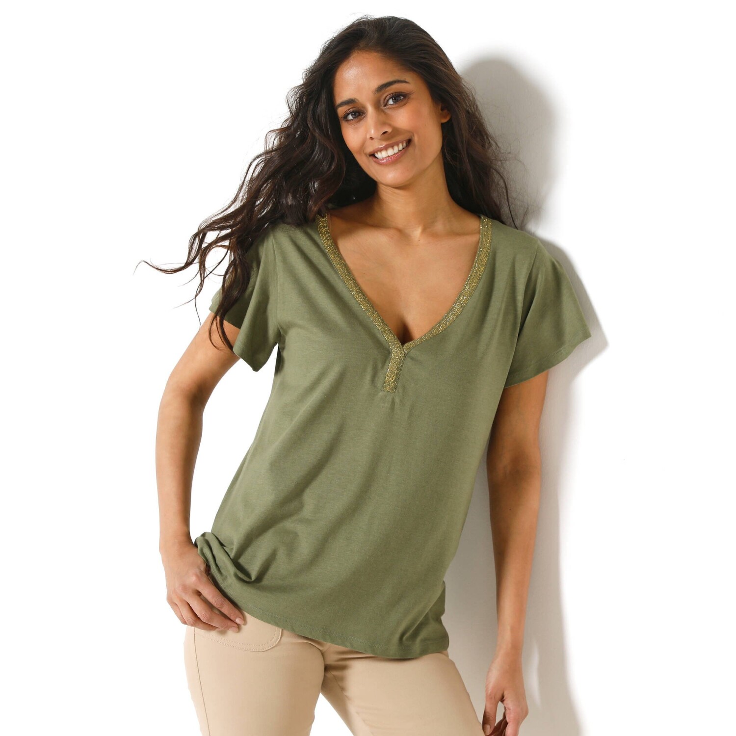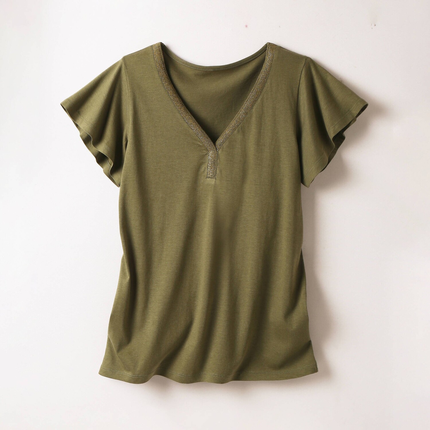Базовим предметом гардеробу є футболка з лляної суміші з V-подібним вирізом. Вільний, зручний крій. М'яка та повітряна в'язка, зручна у використанні. Заокруглений V-подібний виріз. Короткі, широкі рукави. Прямий поділ. Можна прати в пральній машині.