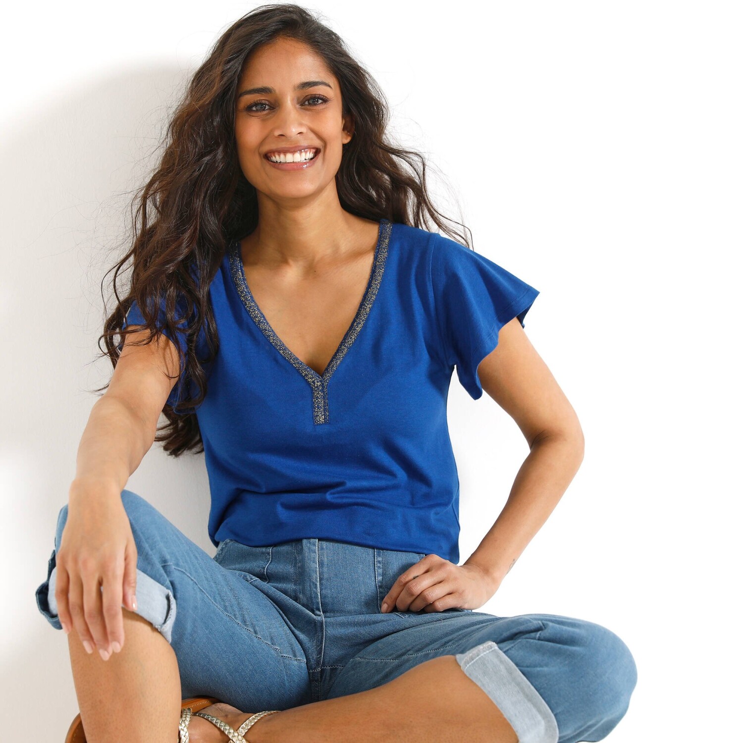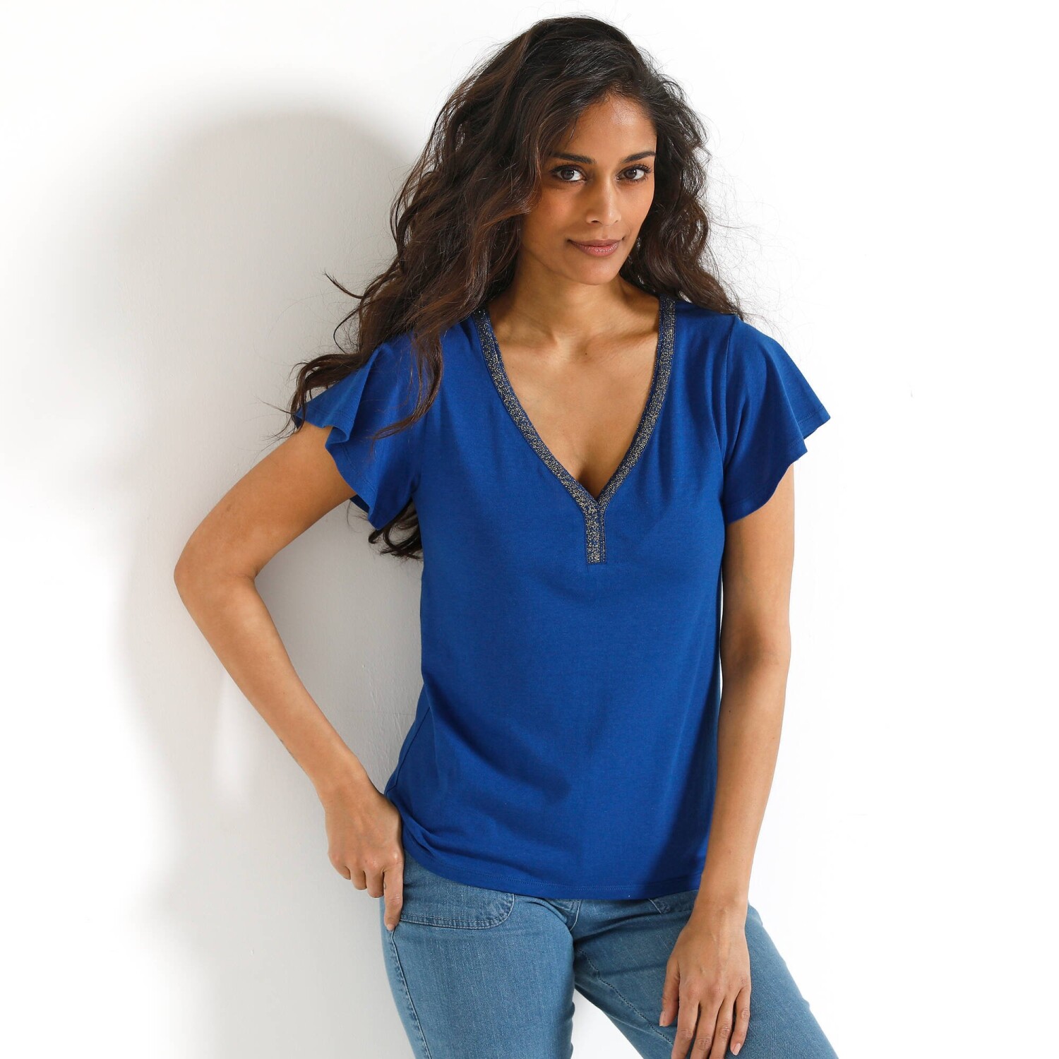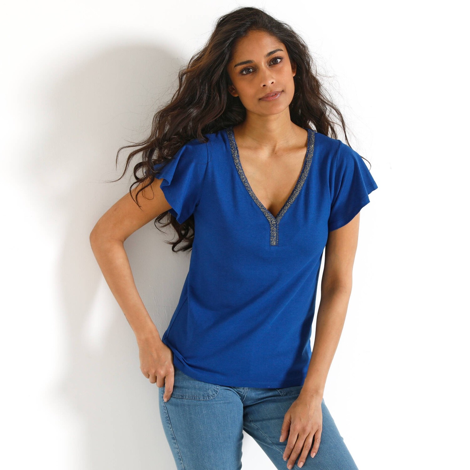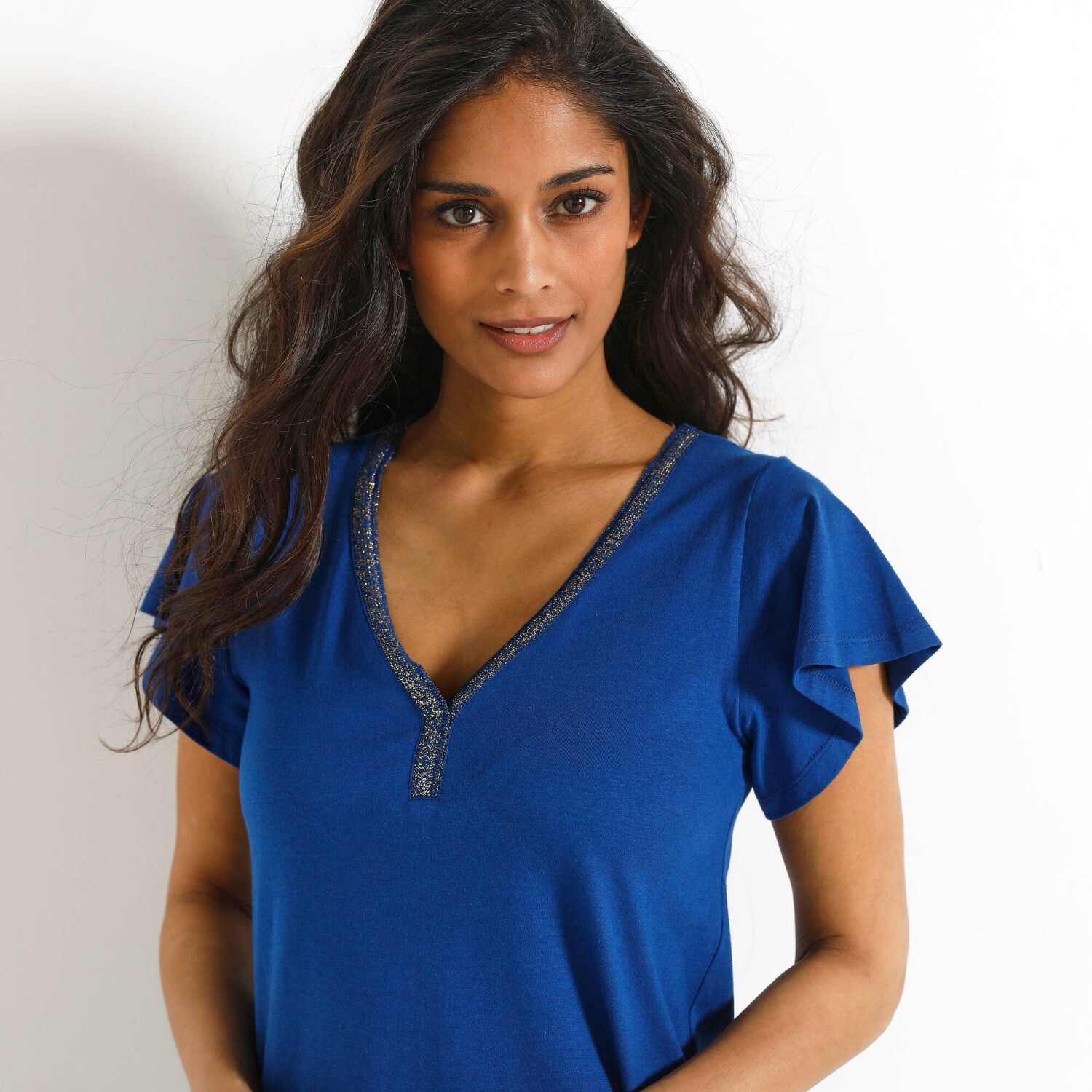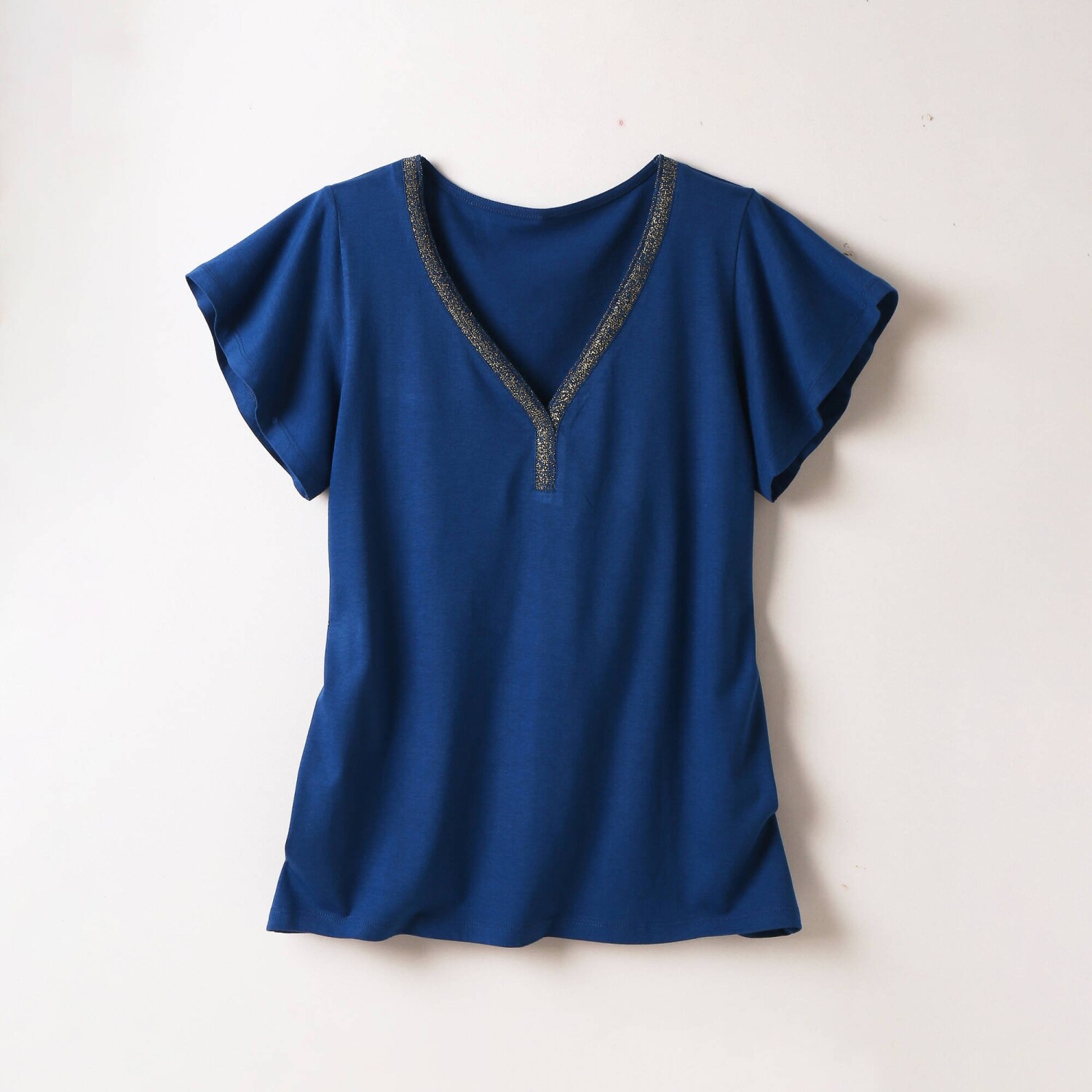 Однотонна футболка вирізняється злегка оборками на рукавах та гарним вирізом горловини з домішкою золотистого волокна. Виготовлена з еластичного легкого матеріалу. V-подібний виріз з оригінальною окантовкою, подовженою до центру переду. Короткі оборки на рукавах. Прямий низ. Можна прати в пральній машині.