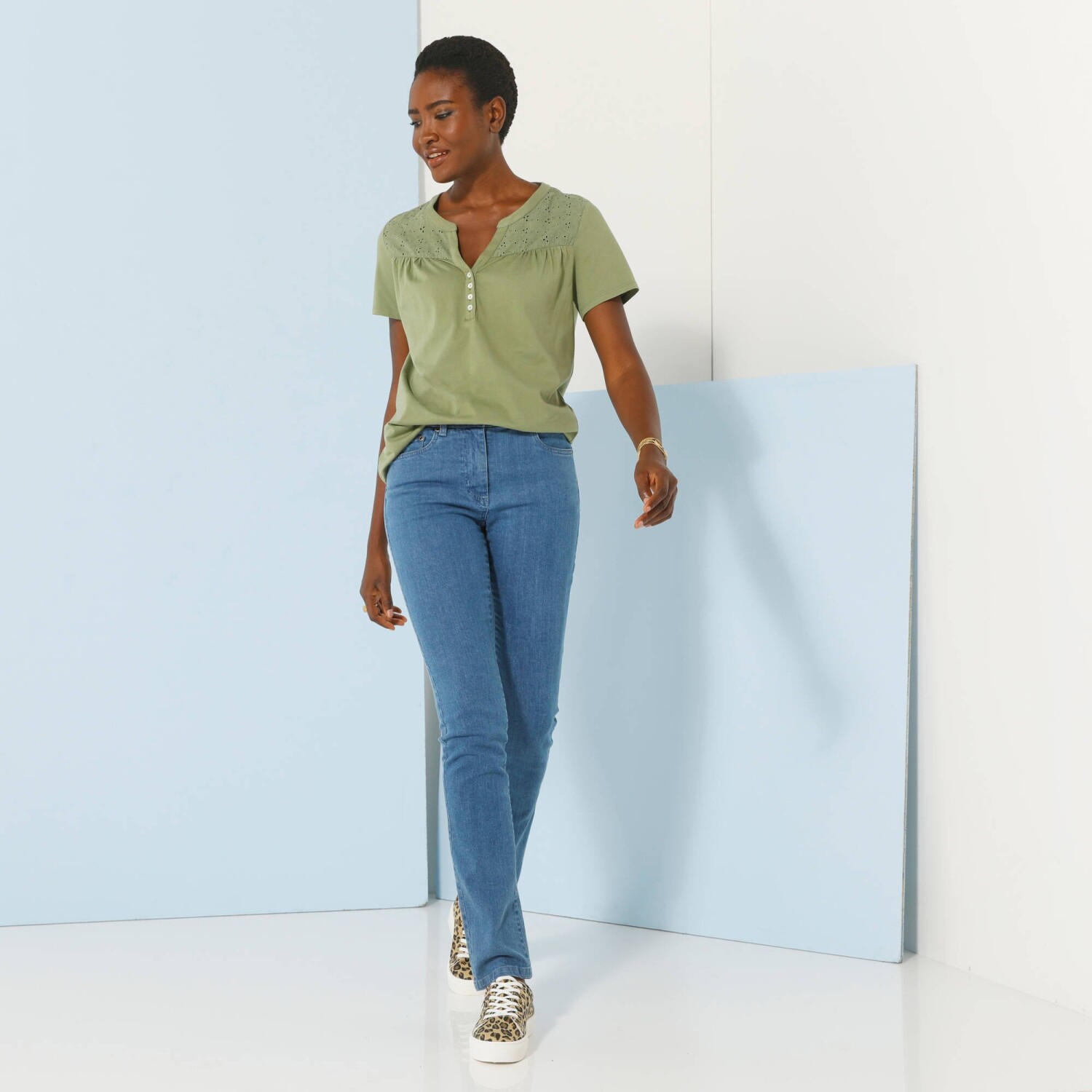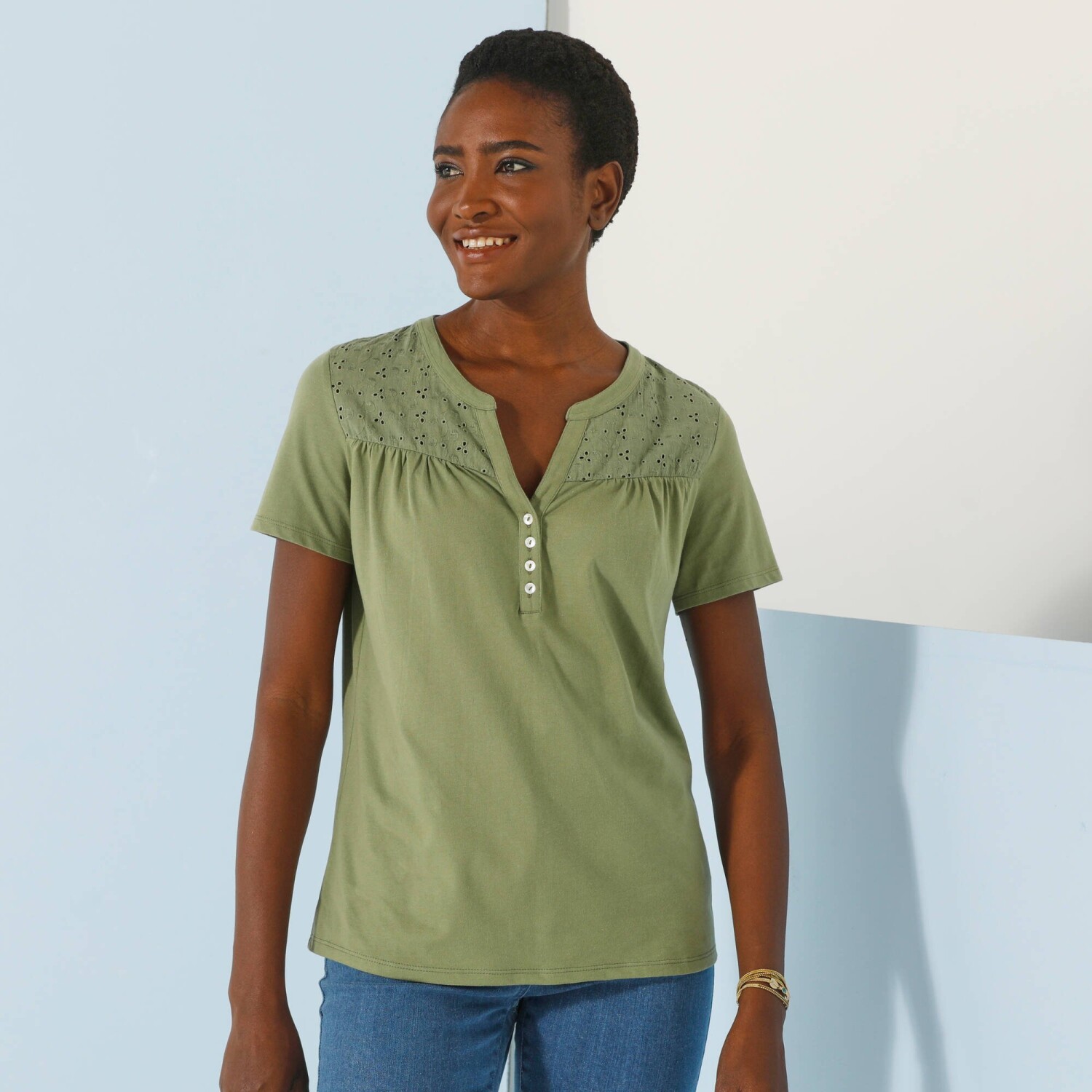 Футболка з вирізом на ґудзиках, короткими рукавами та мадейрою