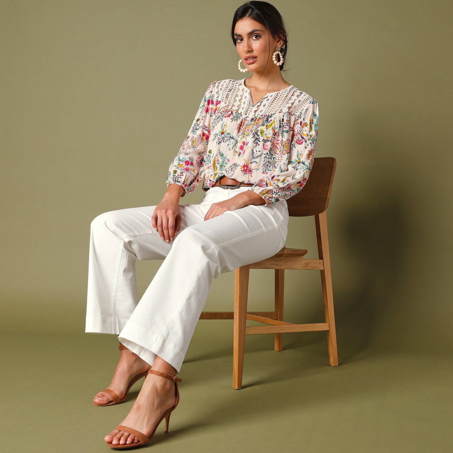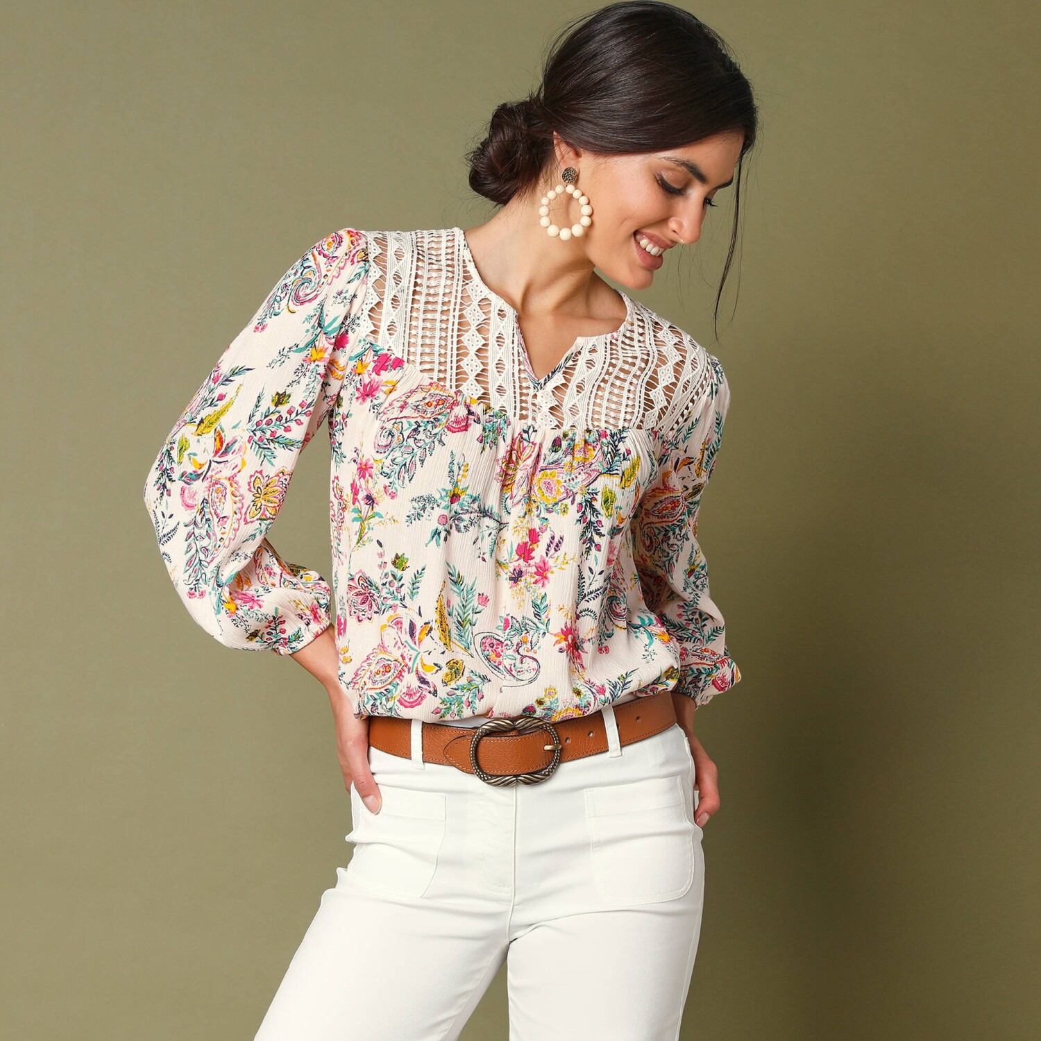 Блузка-сорочка з макраме та принтом виглядає дуже спокусливо. Круглий виріз горловини з вирізом. Ажурна вставка з макраме спереду. Виріз зі складками спереду та ззаду. Рукава на еластичній гумці 3/4. Прямий низ. Можна прати в пральній машині.