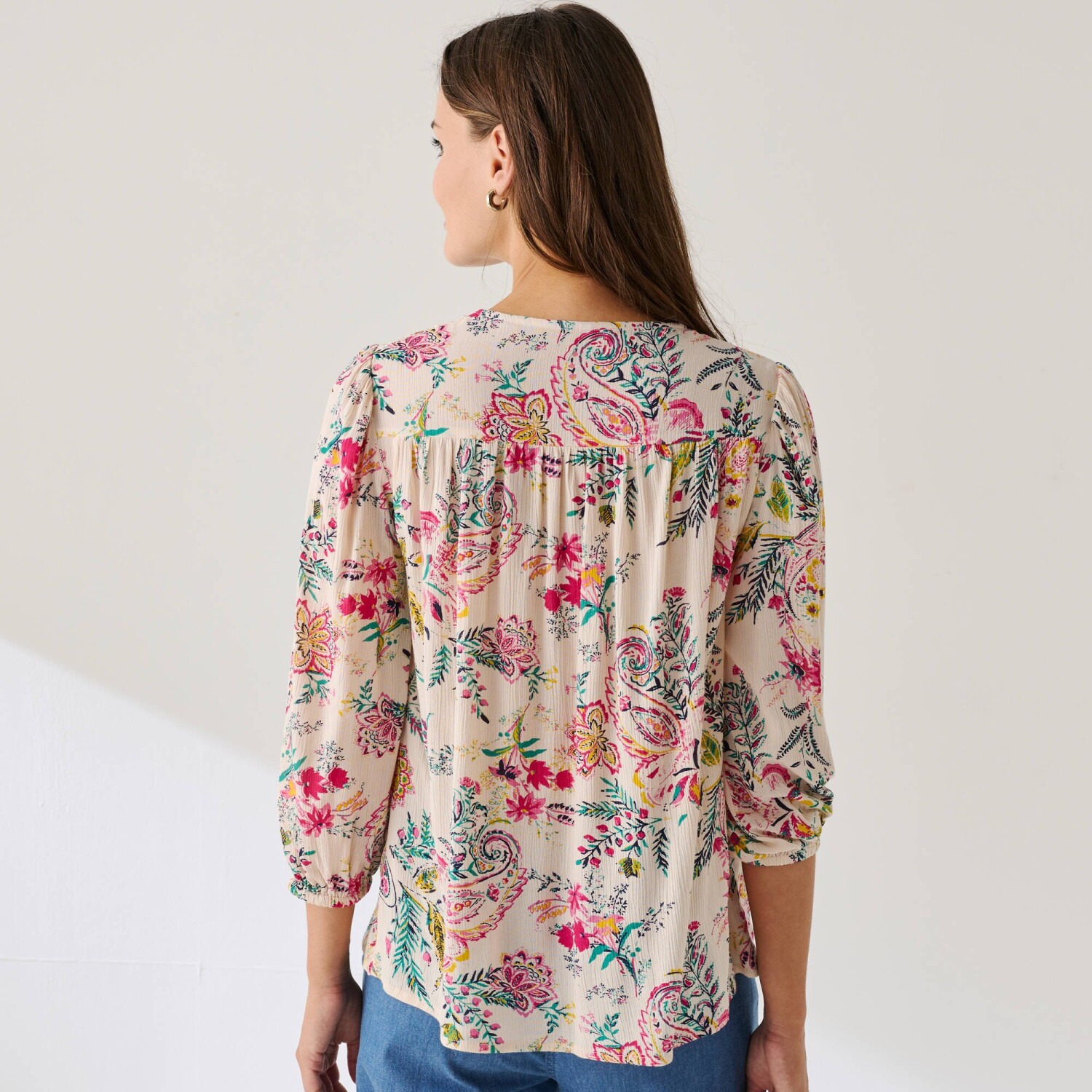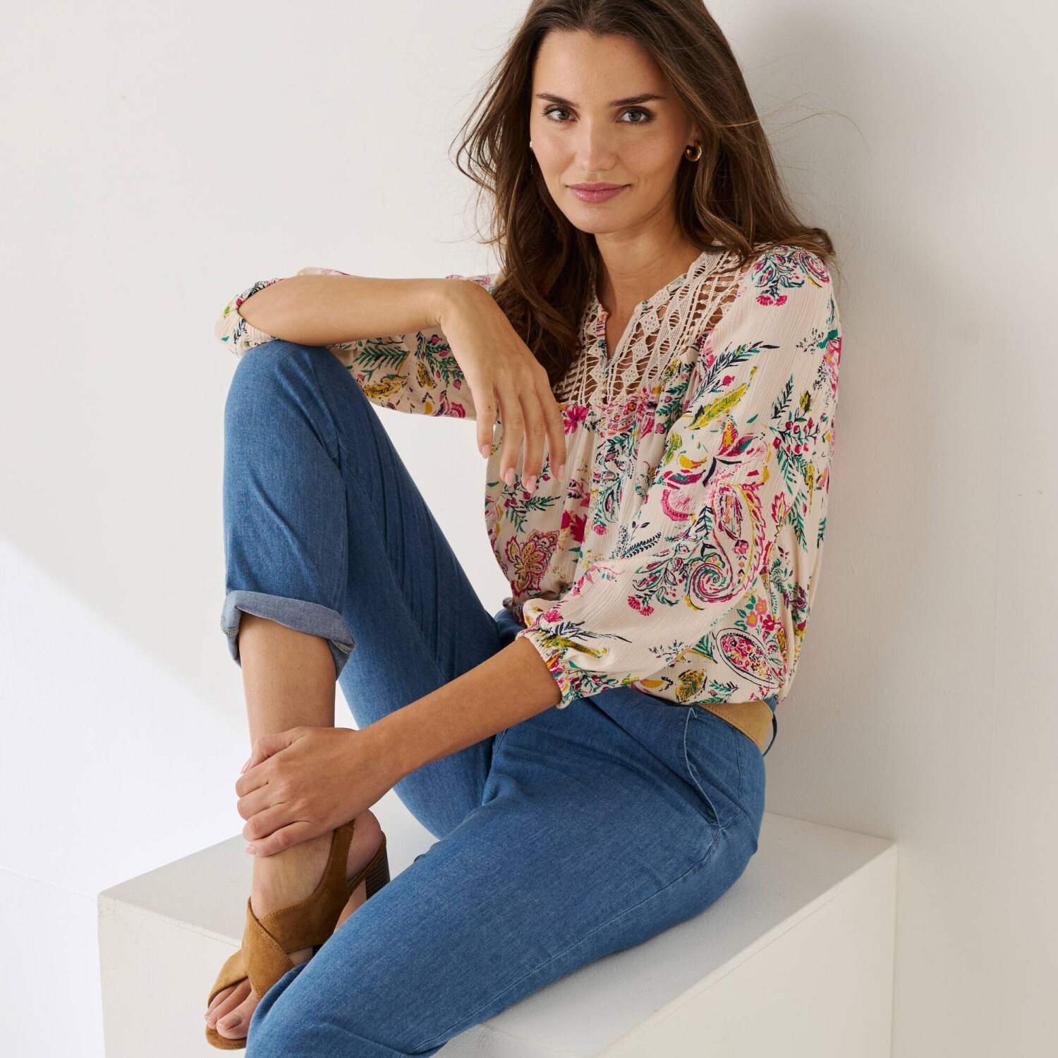 Крепова блузка з макраме та рукавами 3/4, з принтом