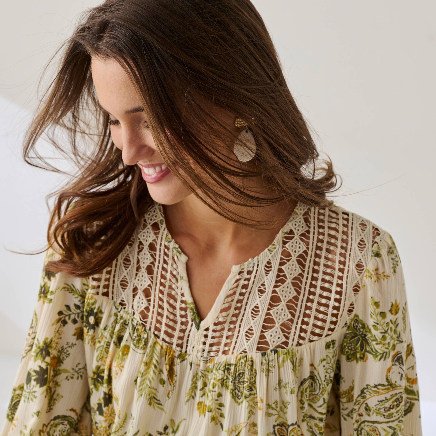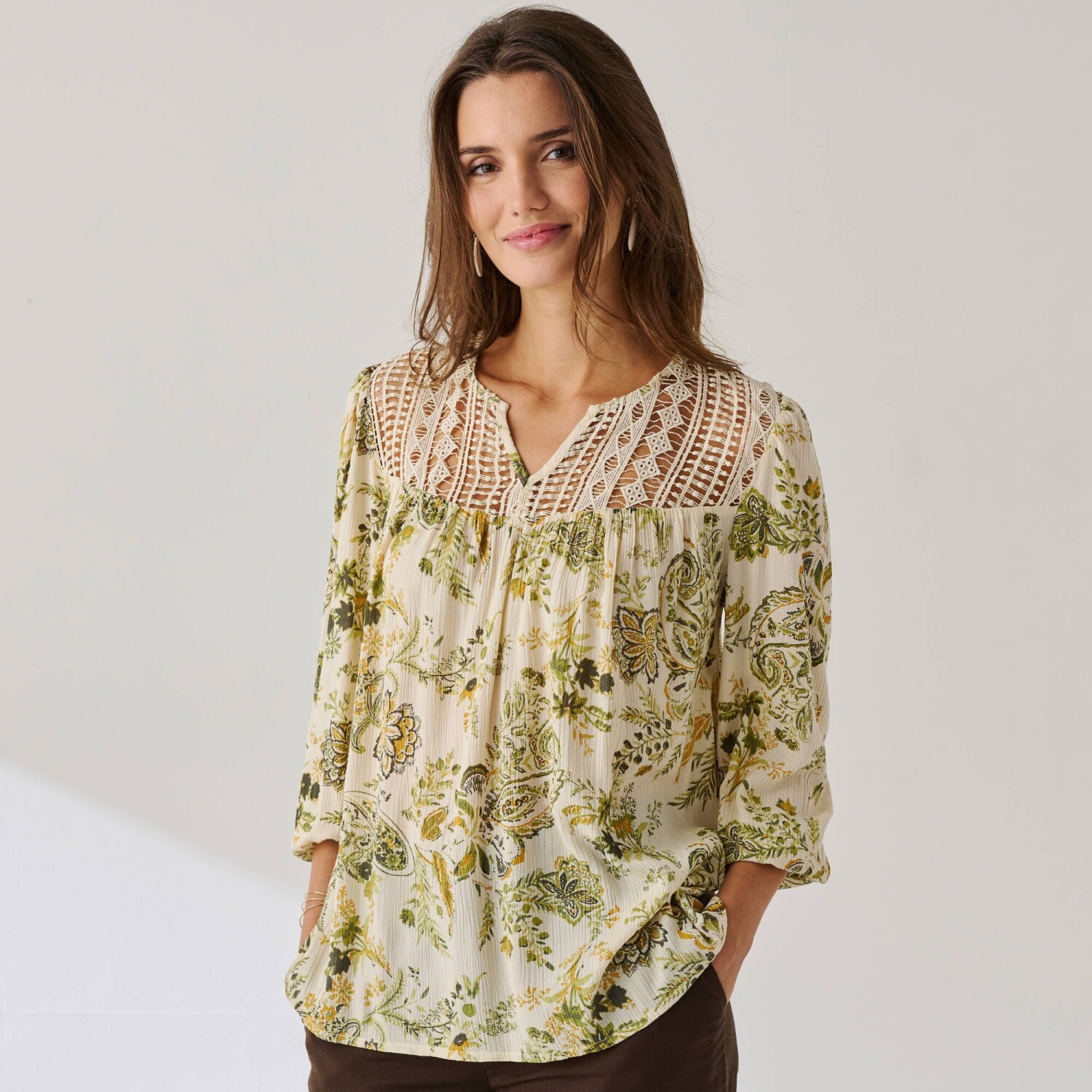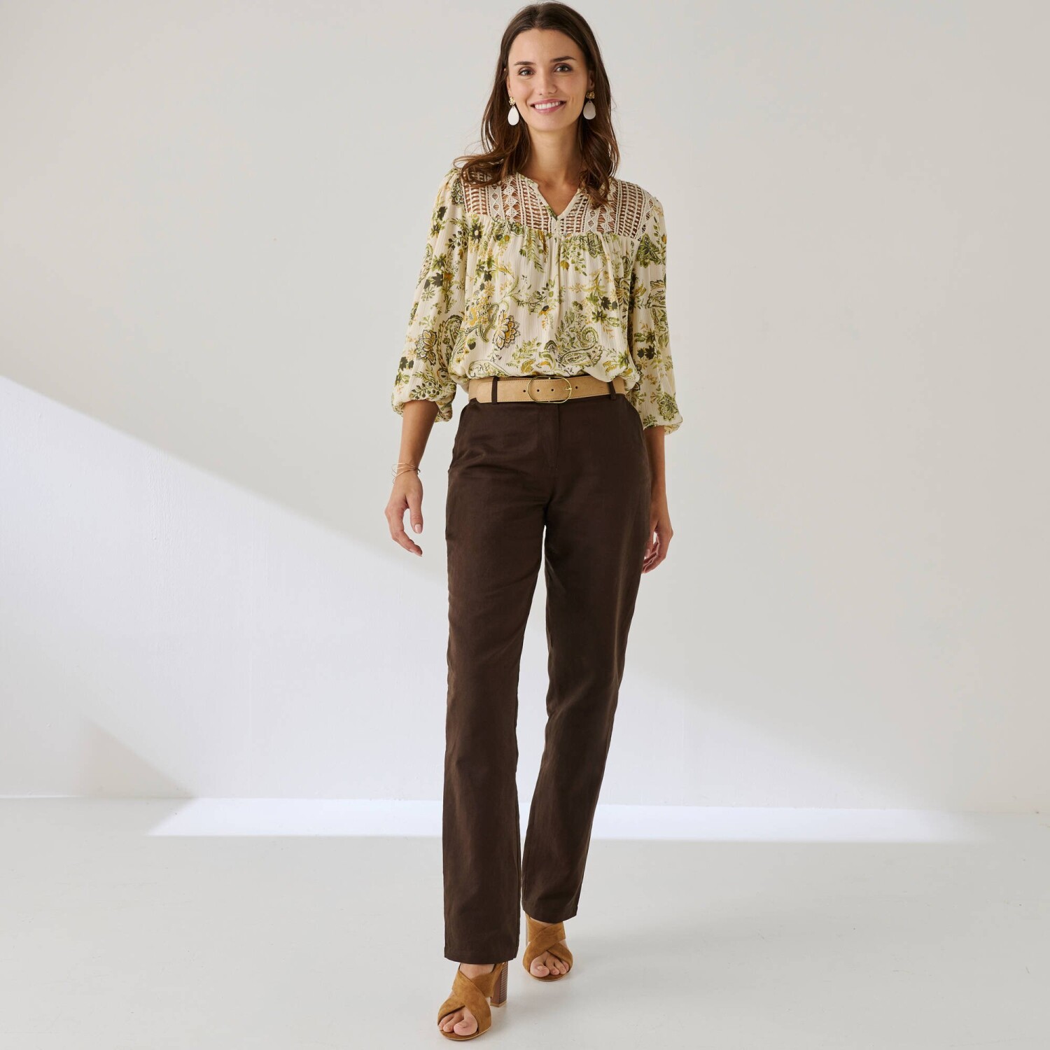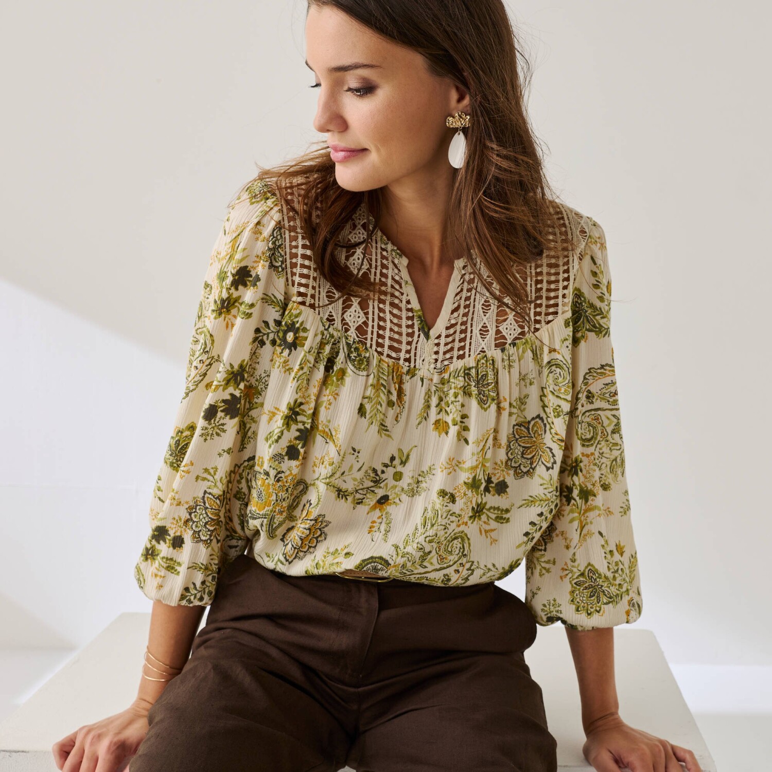 Легкість, делікатність і невимушена елегантність поєднуються в картатій блузі з пофарбованих волокон. Виконана з тонкої, повітряної віскози. Туніський виріз горловини з оборкою. Пофарбовані волокна для стійкості кольору. V-подібний виріз горловини з застібкою на ґудзиках. Ззаду плечовий шов з рюшами. Широкі рукави до ліктів. Манжети-жабки. Прямий поділ. Можна прати у пральній машині.