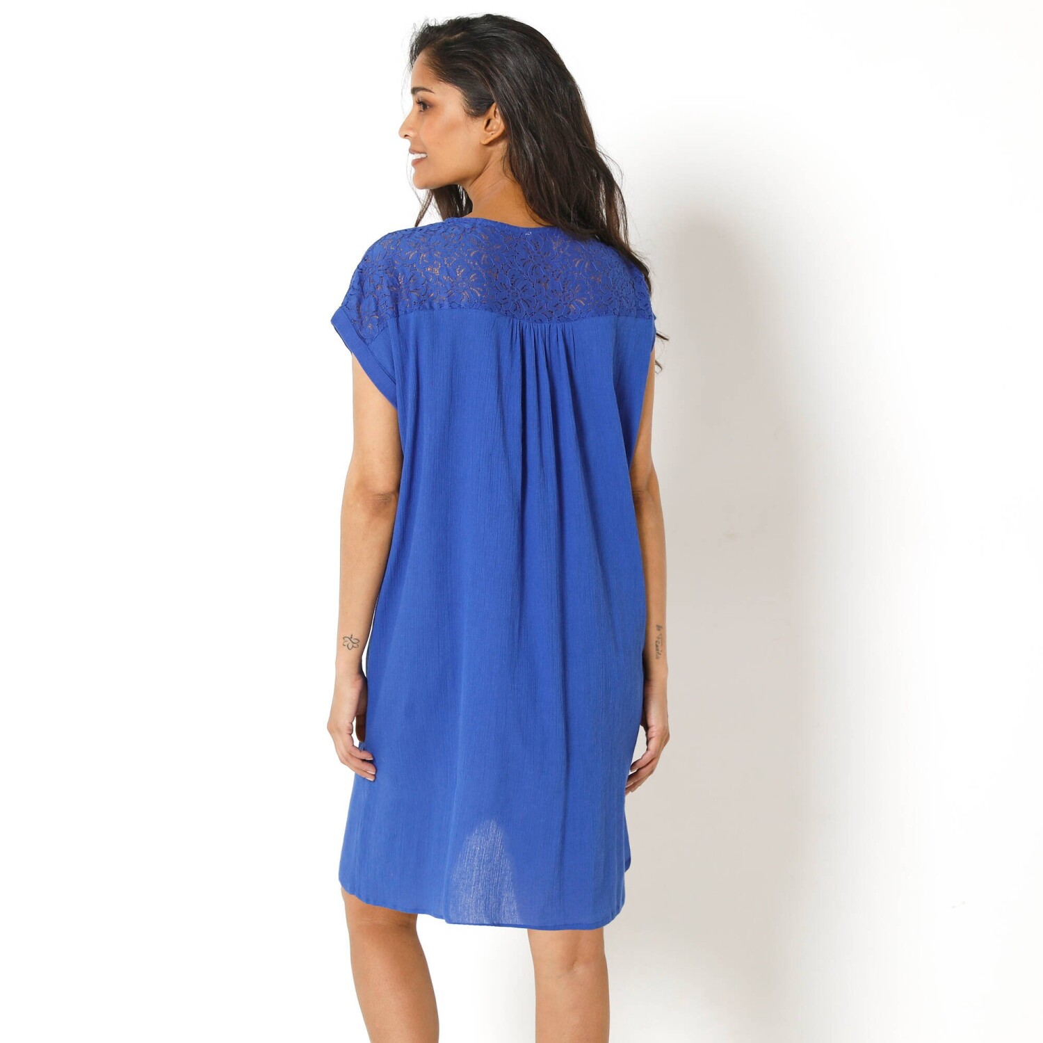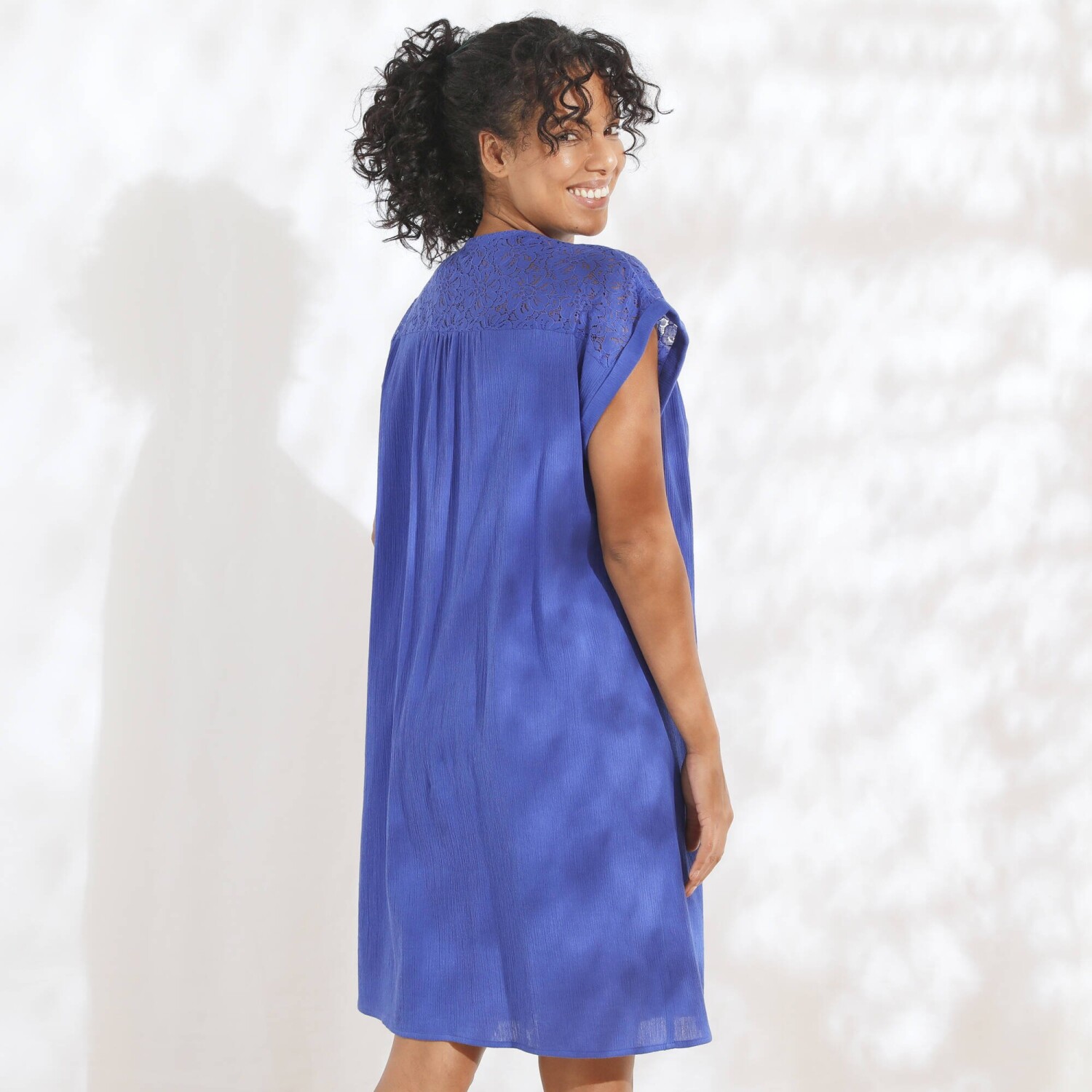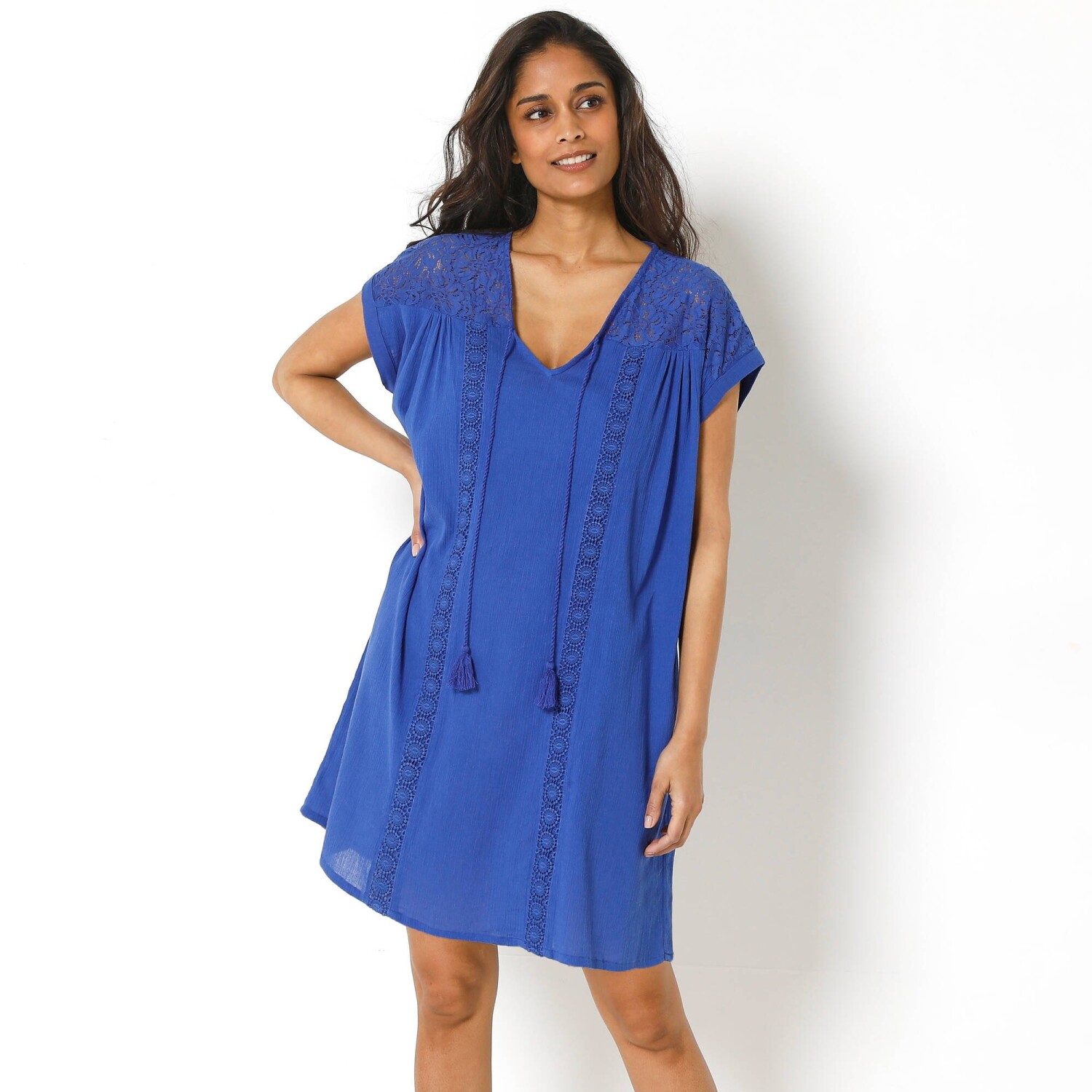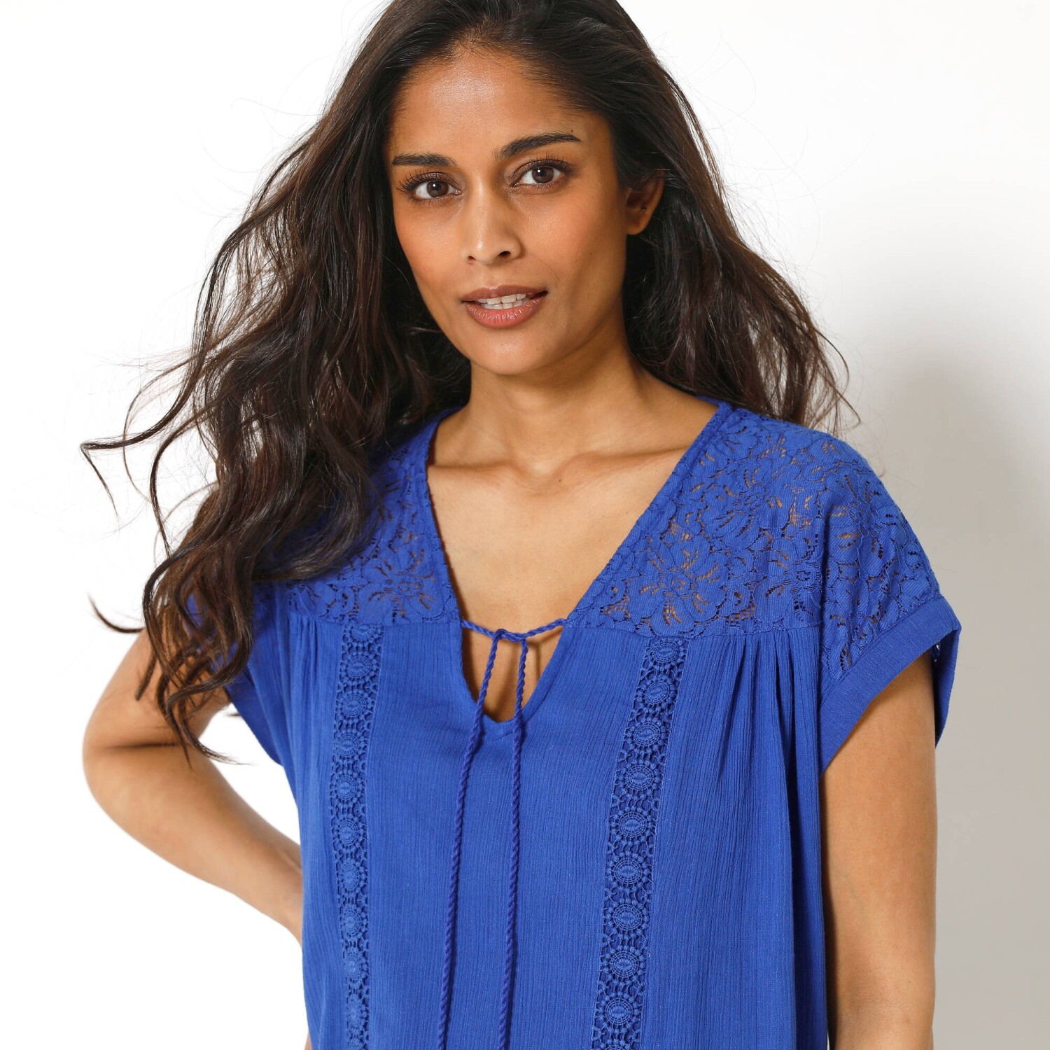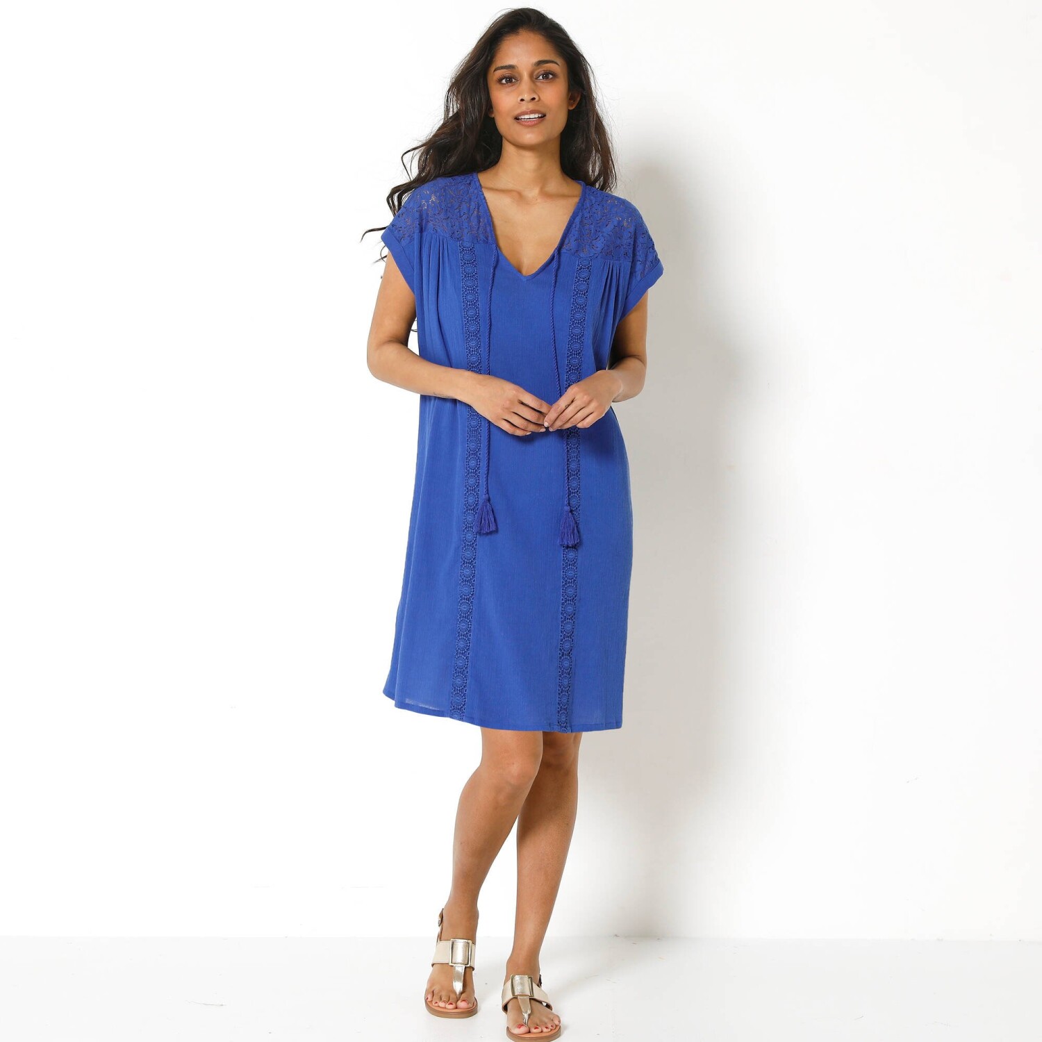 Сукня з рукавами-рюшами з індійським квітковим принтом. Повітряний, легкий креп. Довжина до коліна. V-подібний виріз спереду та ззаду. Короткі рукави-рюші. Збірка внизу вирізу. Розкльошений поділ. Можна прати в пральній машині.