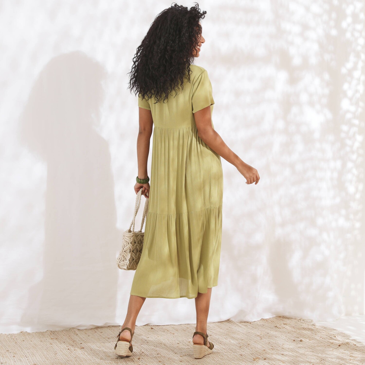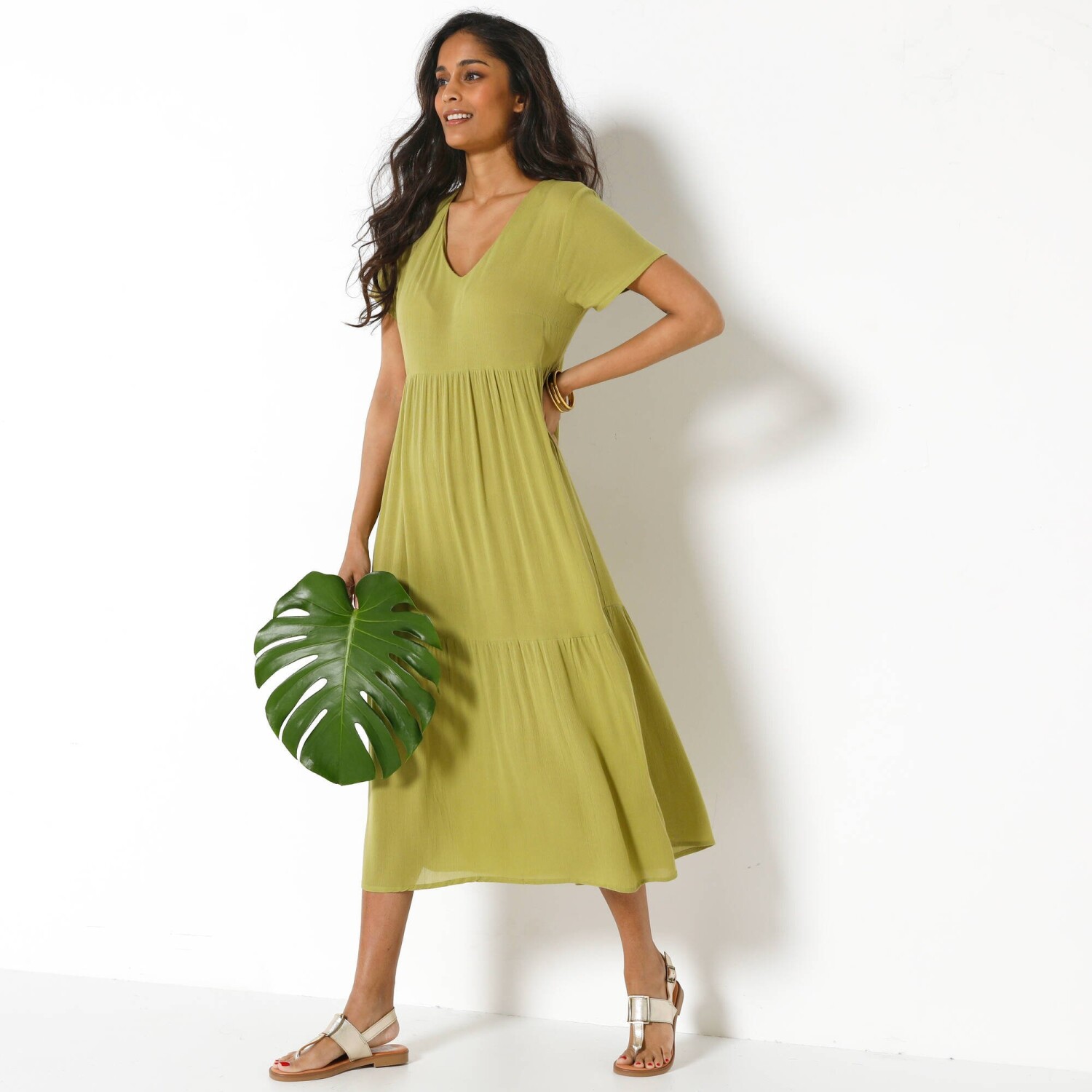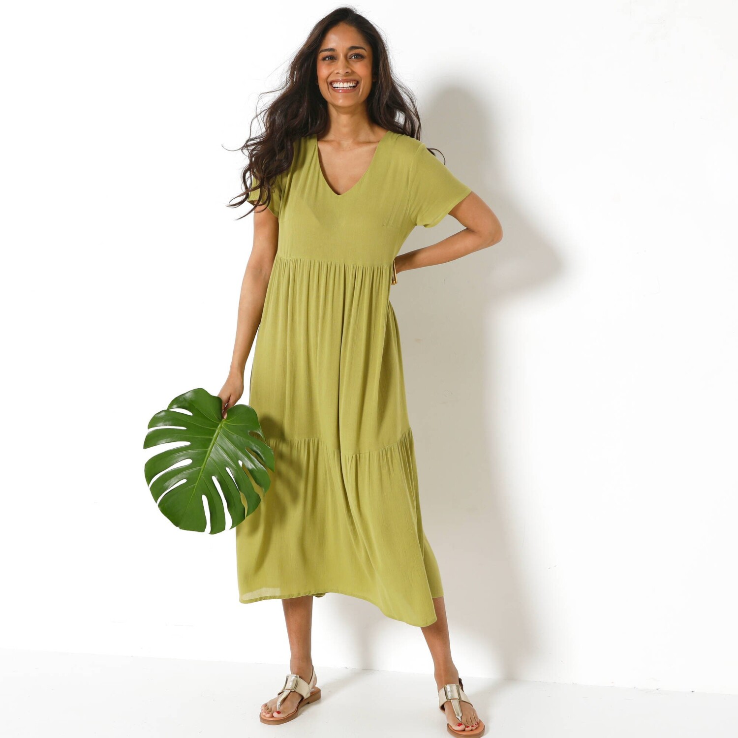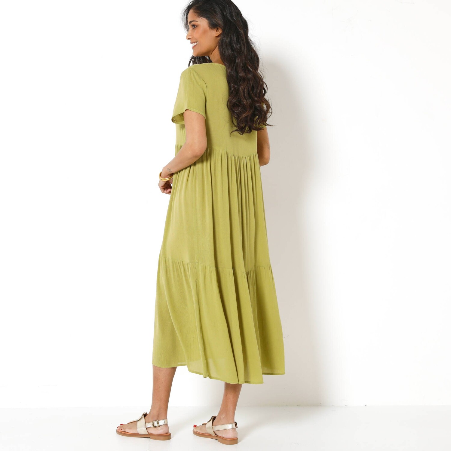 Сукня з принтом, яка вміє привертати увагу! Виготовлена з легкого крепону. Довжина до щиколотки. V-подібний виріз та застібка на ґудзиках. Плоска талія спереду, розшнурування ззаду. Збірки зверху та знизу на вставці на передній талії. Короткі еластичні рукави з міцними шнурками для зав'язування. Збірки на плечах. Бічні розрізи. Розширений низ. Можна прати в пральній машині.