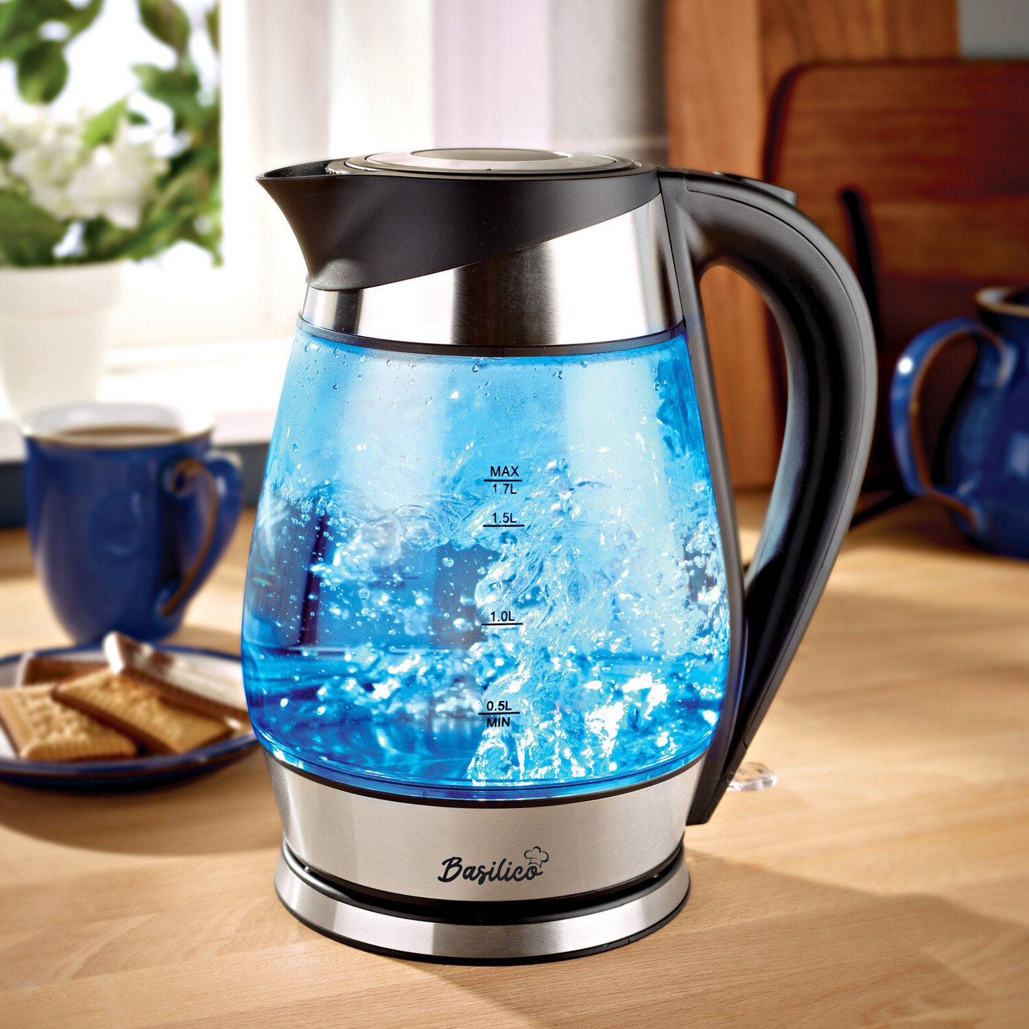 Цей практичний скляний чайник із синім підсвічуванням, незалежно від того, чи готуєте ви чай, каву або супи швидкого приготування, привертає увагу. Чайник об'ємом 1,7 л (приблизно 7-8 чашок) нагріває воду в найкоротші терміни. Завдяки сенсорній кришці та підставці, що обертається на 360° з намотувачем кабелю, чайником можна керувати однією рукою - ідеально підходить для правші та лівші. Фільтр, що миється, запобігає утворенню накипу і завжди забезпечує найкращу якість води. Особливо безпечний завдяки автоматичному вимкненню, захисту від перегріву та закипання/висихання.