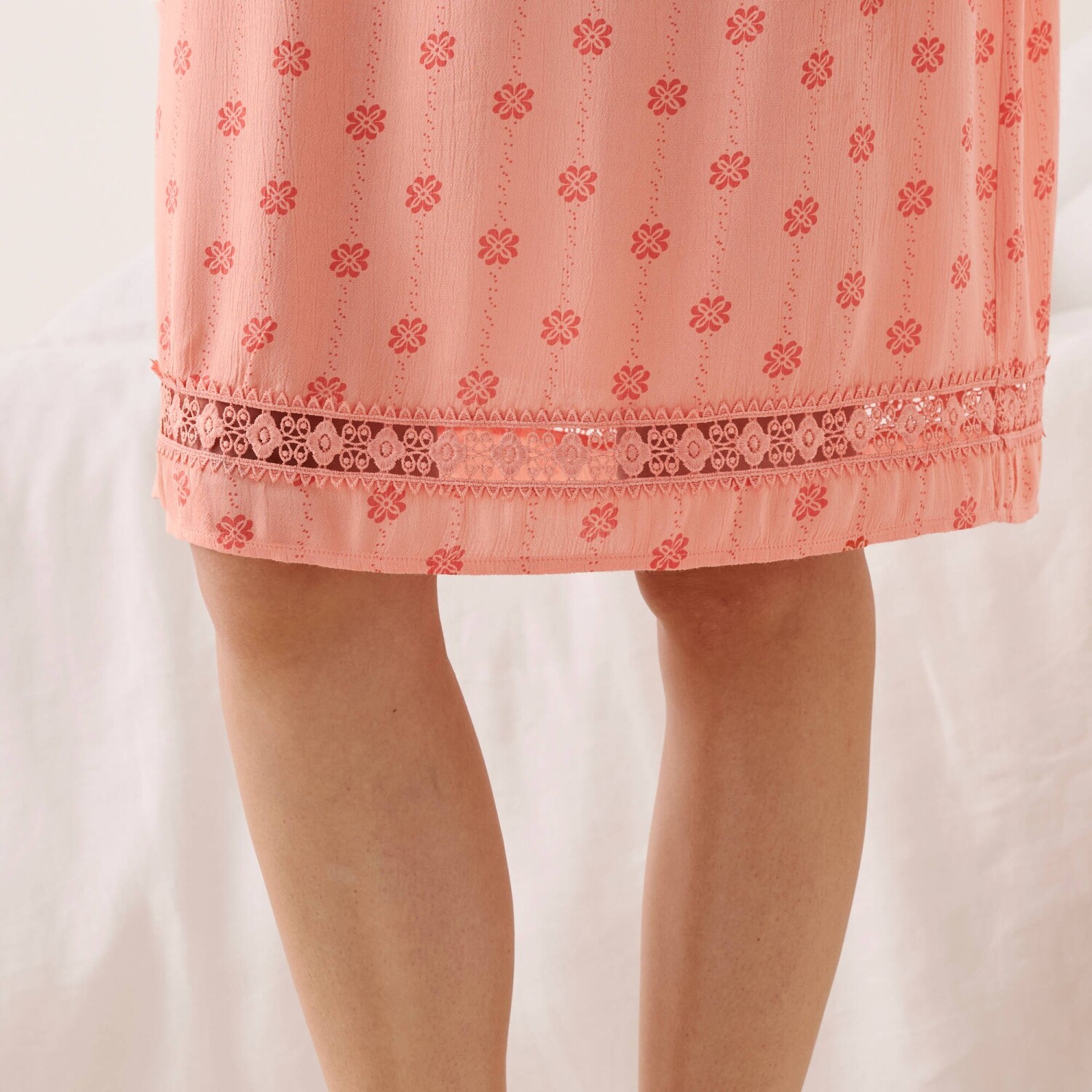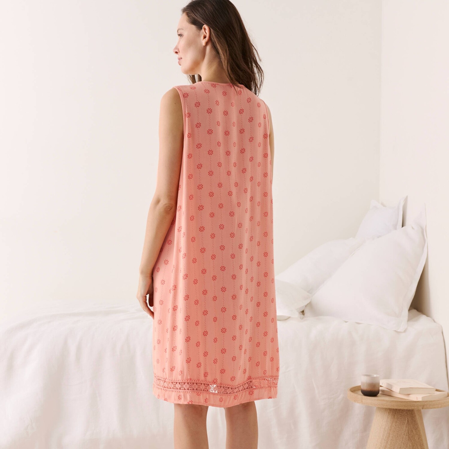 Бавовняна марля – ідеальний матеріал для нічного одягу. Нічна сорочка з квітковим принтом. Широкий крій. Круглий виріз горловини спереду та ззаду. Збірка. Вузькі регульовані бретельки ззаду із золотою петлею. Прямий поділ. Стандарт 100 згідно з Oeko-Tex (n° CQ 1216 / 3 IFTH). Цей знак вказує на текстильні вироби, які пройшли лабораторні випробування на широкий спектр шкідливих речовин, і виріб є безпечним понад чинні стандарти. Можна прати в пральній машині.