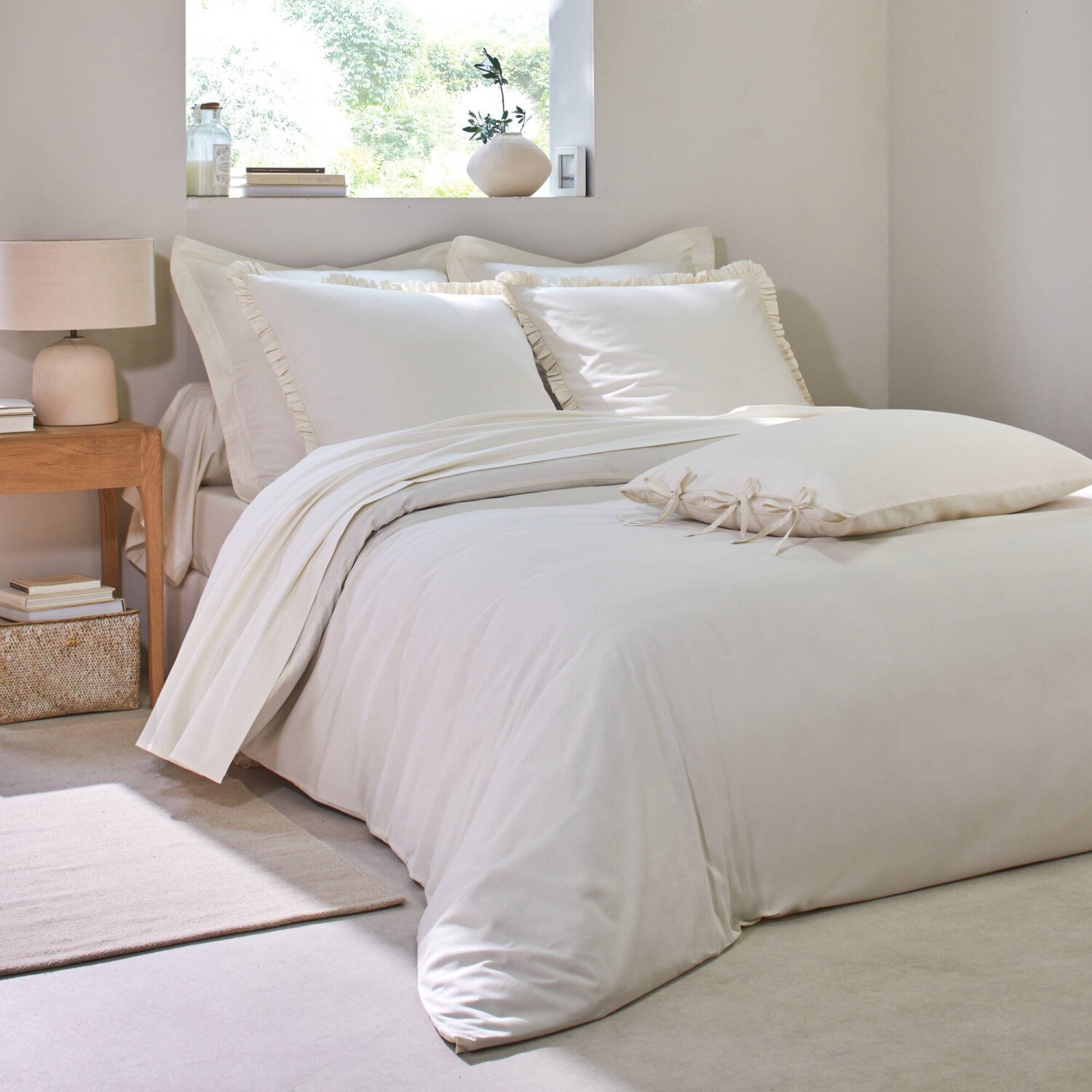Однотонна постільна білизна Colombine елегантна та може бути поєднана з різноманітними принтами. Перкаль – це високоякісна бавовняна тканина, яка є м’якою, але міцною. Наволочка має плоску, квадратну або прямокутну рюшу, прикрашену подвійним в’язанням. Підодіяльник у типовому французькому стилі «пляшка» поміщається під матрац шириною 40 см з клапаном. Простирадло на ремінці має високі, добре прилягаючі кути (32 см). Класична постільна білизна подвійного в’язання. Сертифікація OEKO-TEX «Зроблено в зеленому» стилі. Окрім підтвердження наявності сотень хімічних речовин, що сприяють високій безпеці, ця етикетка гарантує продумані принципи виробництва та контрольовані соціальні практики. Для захисту довкілля ми рекомендуємо прати при температурі 40°C та сушити на відкритому повітрі.