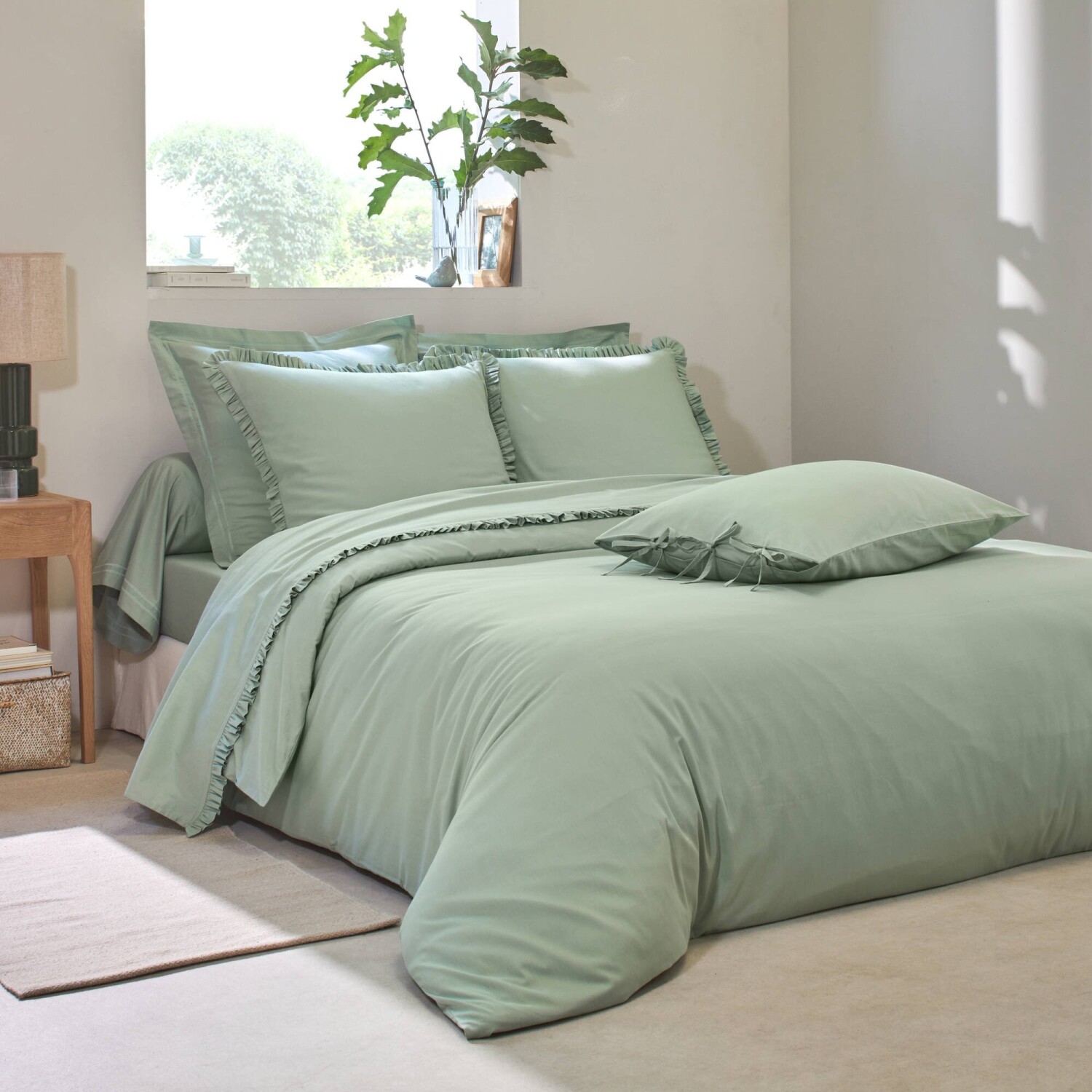Однотонна постільна білизна Colombine елегантна та може бути поєднана з різноманітними принтами. Перкаль – це високоякісна бавовняна тканина, яка є м’якою, але міцною. Наволочка має плоску, квадратну або прямокутну рюшу, прикрашену подвійним в’язанням. Підодіяльник у типовому французькому стилі «пляшка» поміщається під матрац шириною 40 см з клапаном. Простирадло на ремінці має високі, добре прилягаючі кути (32 см). Класична постільна білизна подвійного в’язання. Сертифікація OEKO-TEX «Зроблено в зеленому» стилі. Окрім підтвердження наявності сотень хімічних речовин, що сприяють високій безпеці, ця етикетка гарантує продумані принципи виробництва та контрольовані соціальні практики. Для захисту довкілля ми рекомендуємо прати при температурі 40°C та сушити на відкритому повітрі.