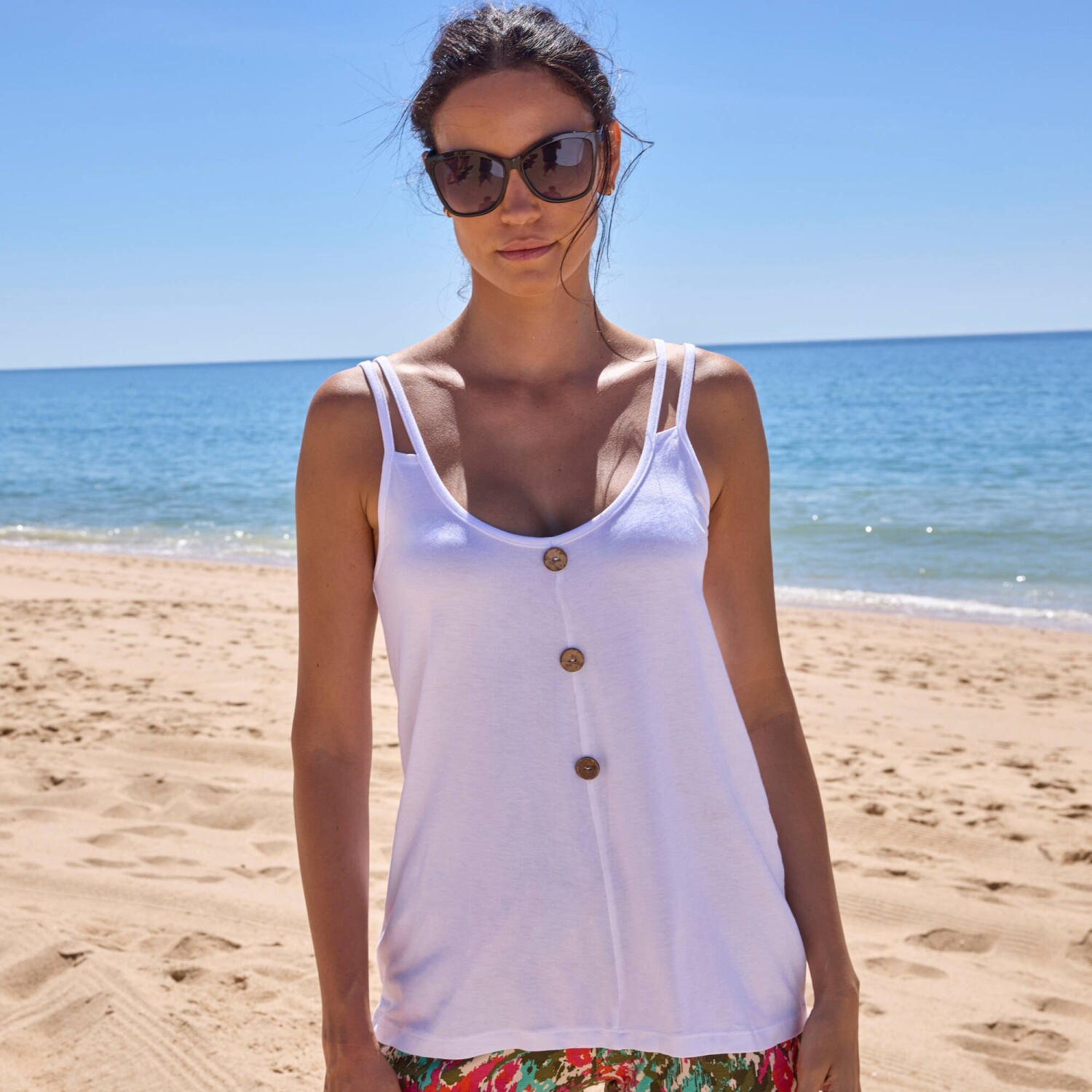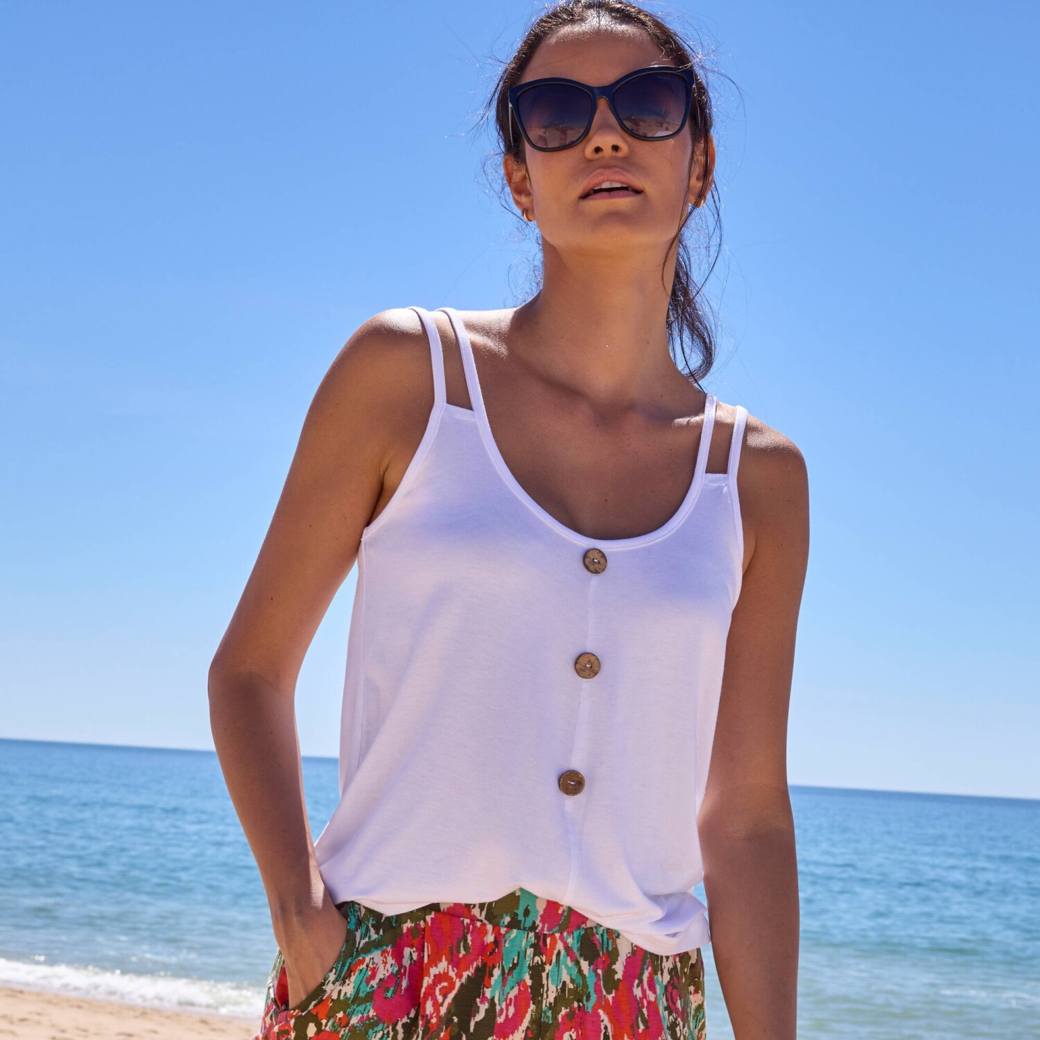 Незамінна річ у жіночому гардеробі - однотонний топ на вузьких бретелях. Злегка приталеного крою. Квадратний виріз горловини. Широкі бретелі. Прямий поділ. Стандарт 100 відповідно до Oeko-Tex (n° CQ 1216 / 3 IFTH). Цей знак ідентифікує текстильні вироби, які були піддані лабораторним випробуванням на широкий спектр шкідливих речовин, і продукт є безпечним понад діючі стандарти. Можна прати в пральній машині.