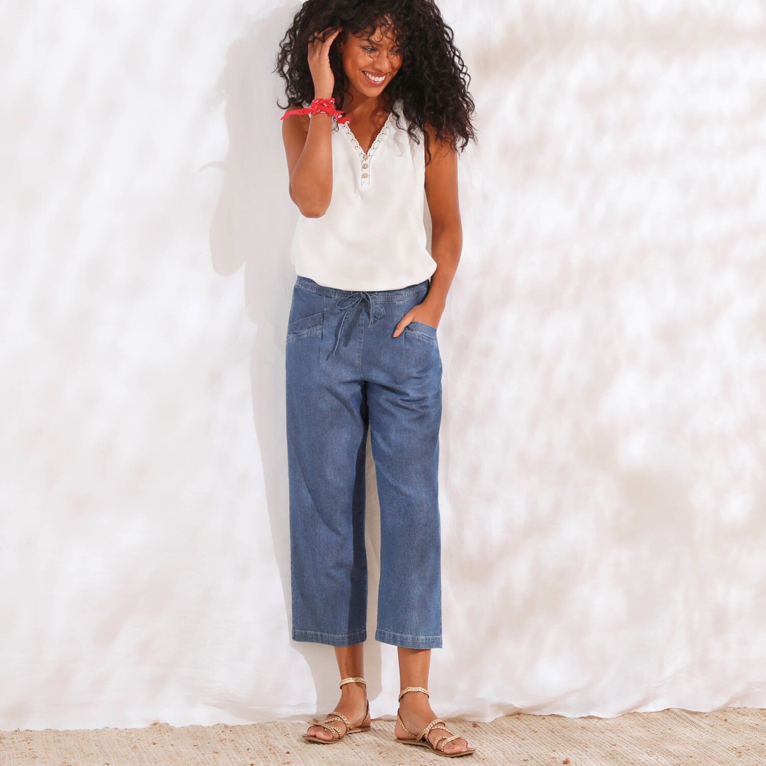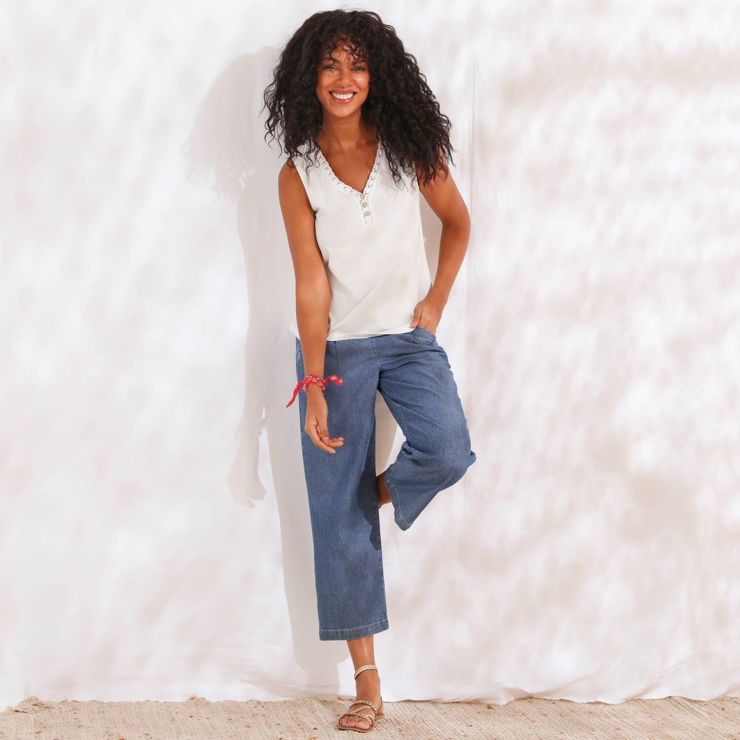 Повітряний мереживний топ ідеально підходить для різноманітних варіантів. Виготовлений з повітряного крепу. V-подібний виріз горловини та пройми, оздоблені квітковим мереживом. Виточки на грудях. Прямий поділ. Blancheporte обрала перероблений поліестер, що сприяє боротьбі з відходами та пропагує більш відповідальне споживання, яке дбає про навколишнє середовище. Можна прати в пральній машині.