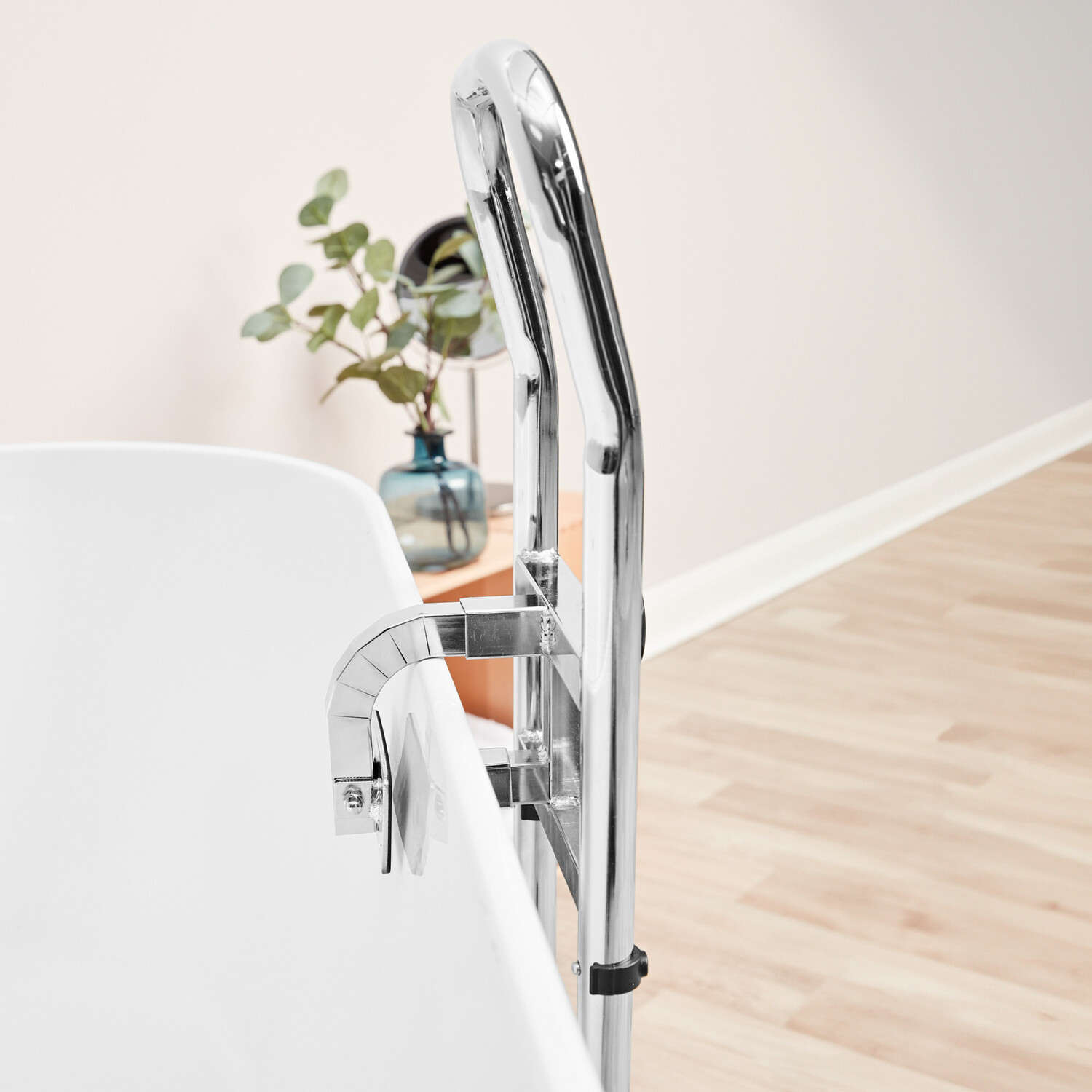 Цей поручень з регульованим по висоті поруччям забезпечує підтримку при вході та виході з ванни. Легко кріпиться за допомогою 3 затискачів і міцної основи. Підходить для всіх ванн.