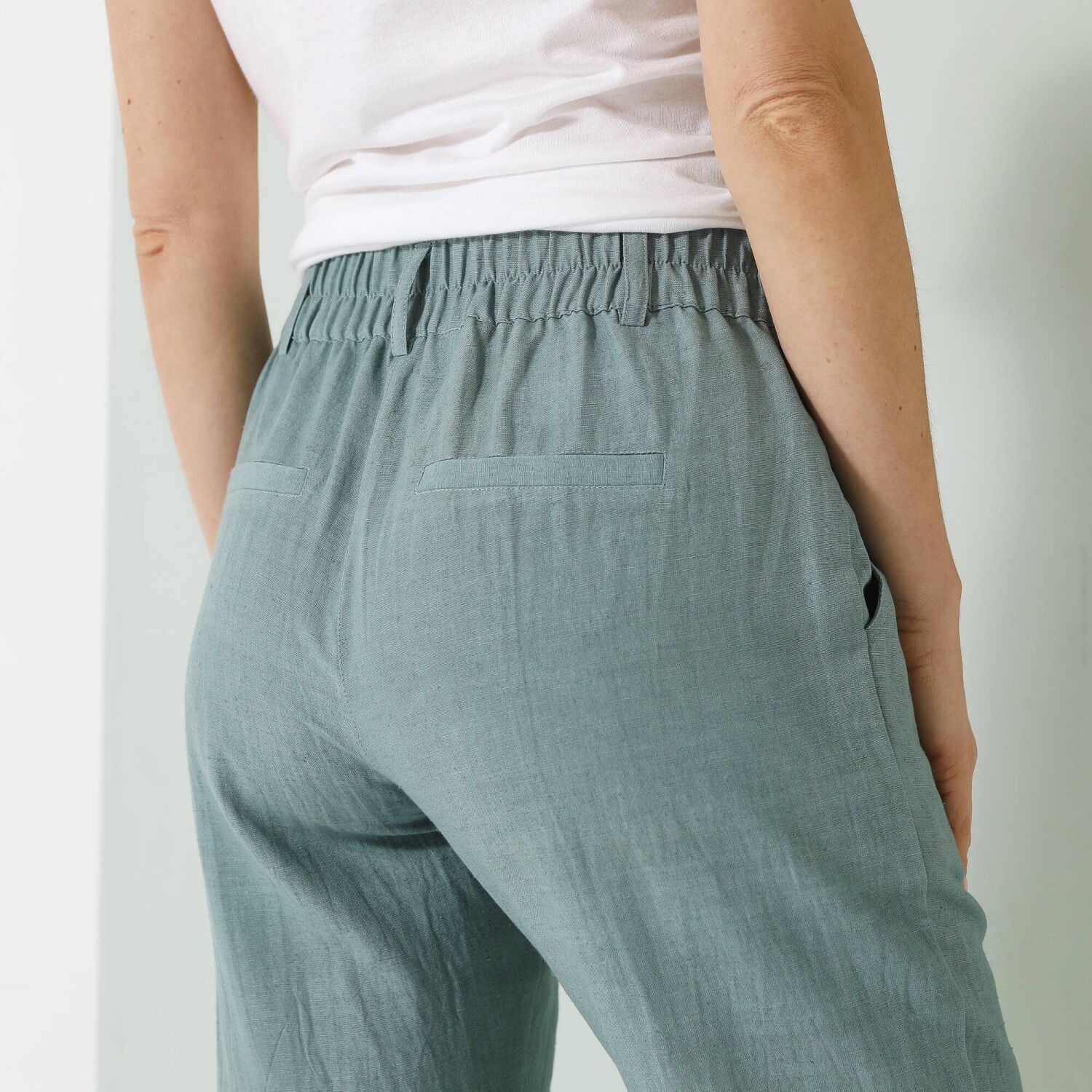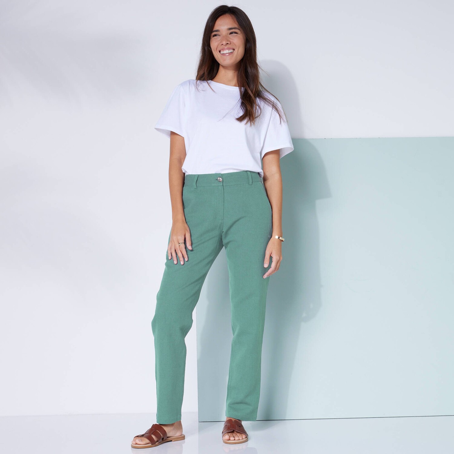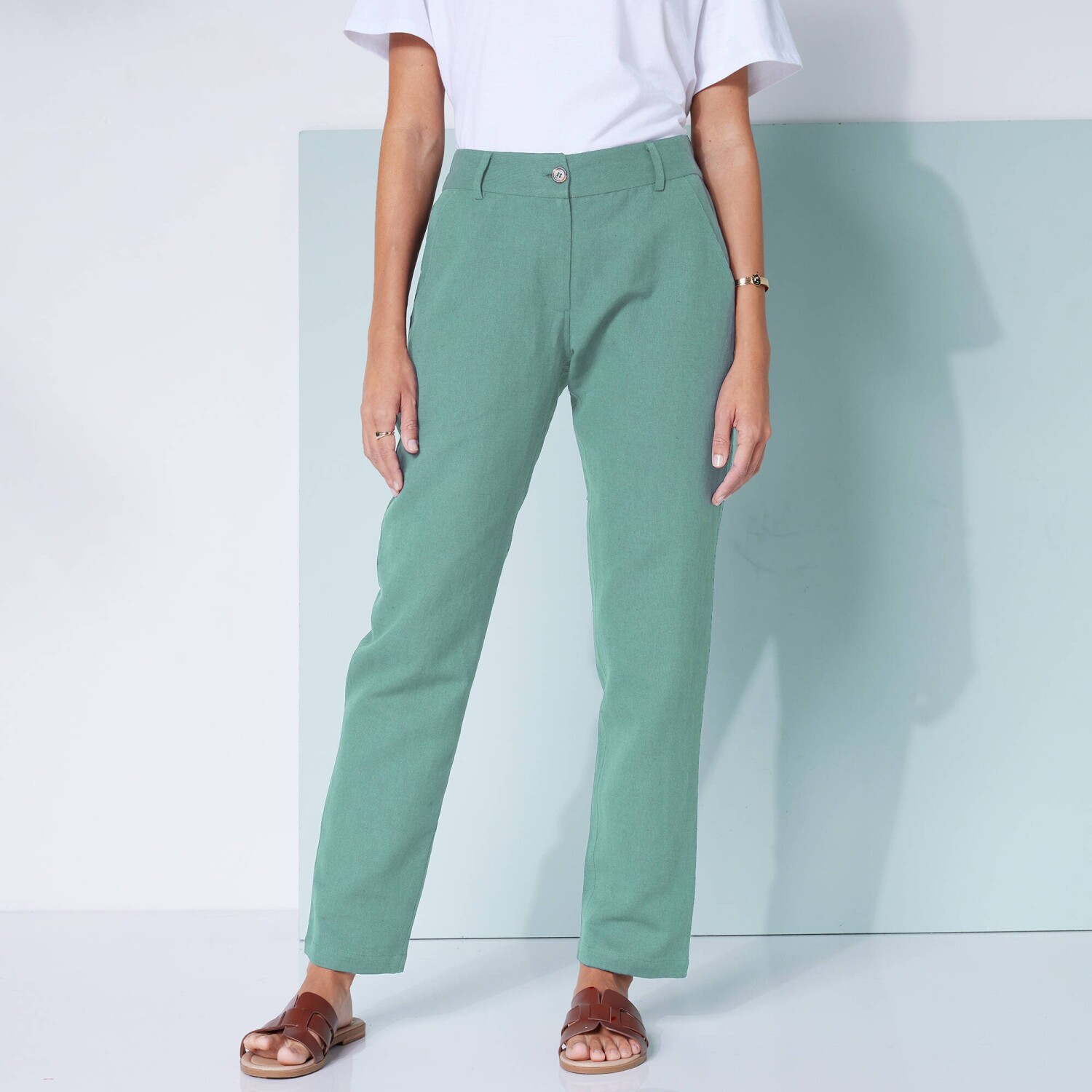 Легкість у догляді та зручність в носінні - головні переваги брюк популярного крою чінос. До того ж, виготовлені зі свіжої бавовняно-лляної суміші. Крій чінос (не тисне на стегна), нормальна висота талії. Фігурний пояс з петлями для ременя, ззаду на резинці. Застібка на блискавку та ґудзики. 2 прорізні кишені. 2 накладні кишені з прорізною кишенею ззаду. Можна прати при температурі 30 °C.