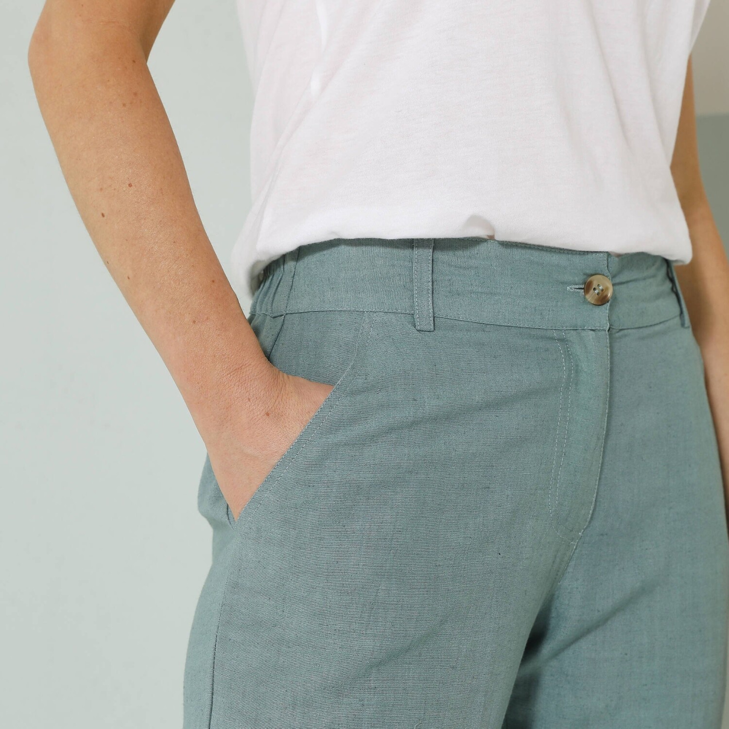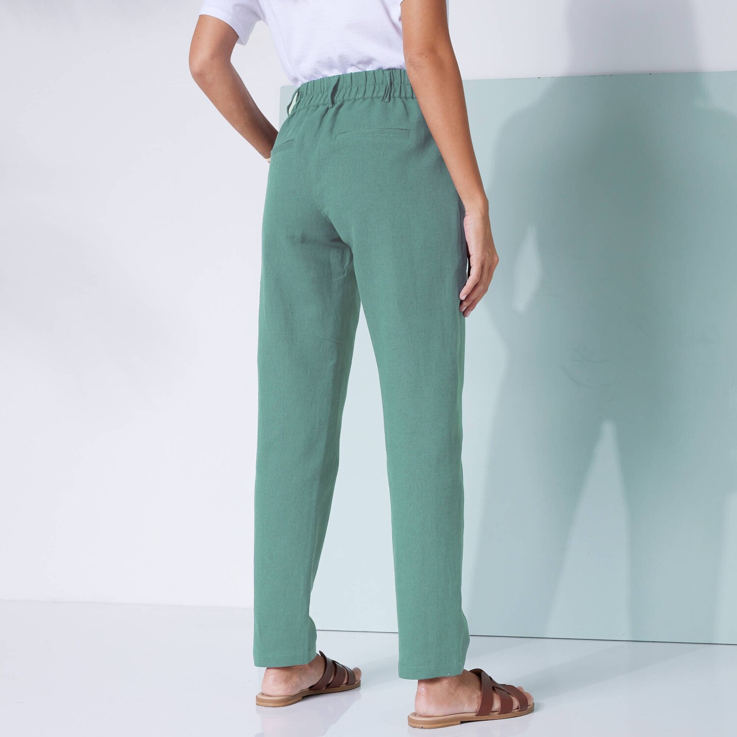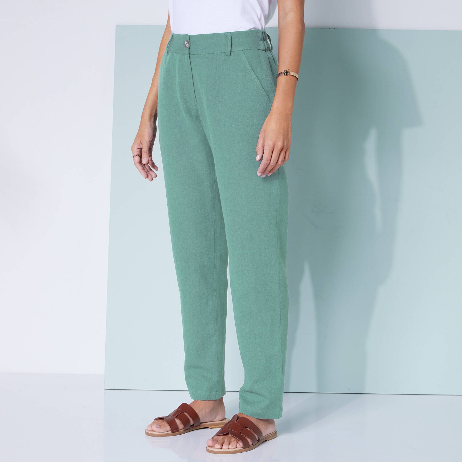 Легкість у догляді та зручність в носінні - головні переваги брюк популярного крою чінос. До того ж, виготовлені зі свіжої бавовняно-лляної суміші. Крій чінос (не тисне на стегна), нормальна висота талії. Фігурний пояс з петлями для ременя, ззаду на резинці. Застібка на блискавку та ґудзики. 2 прорізні кишені. 2 накладні кишені з прорізною кишенею ззаду. Можна прати при температурі 30 °C.