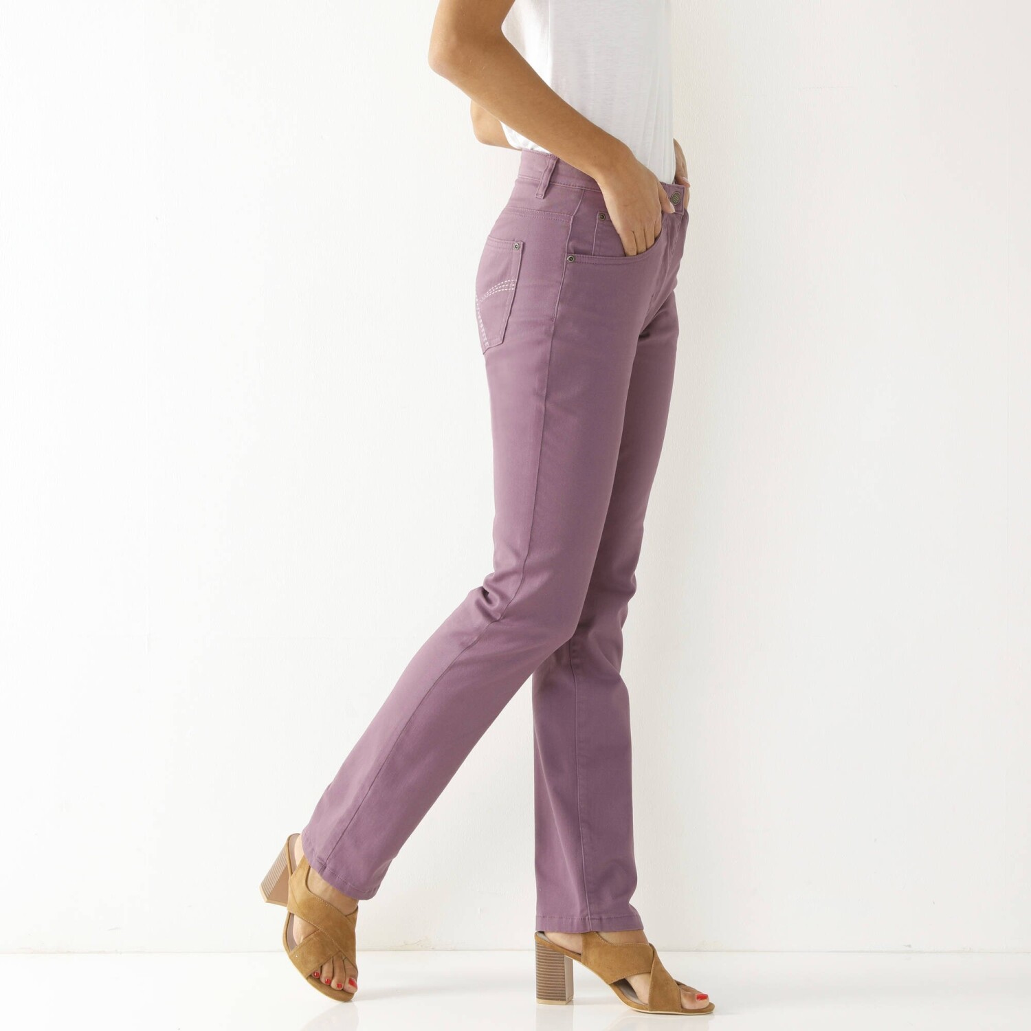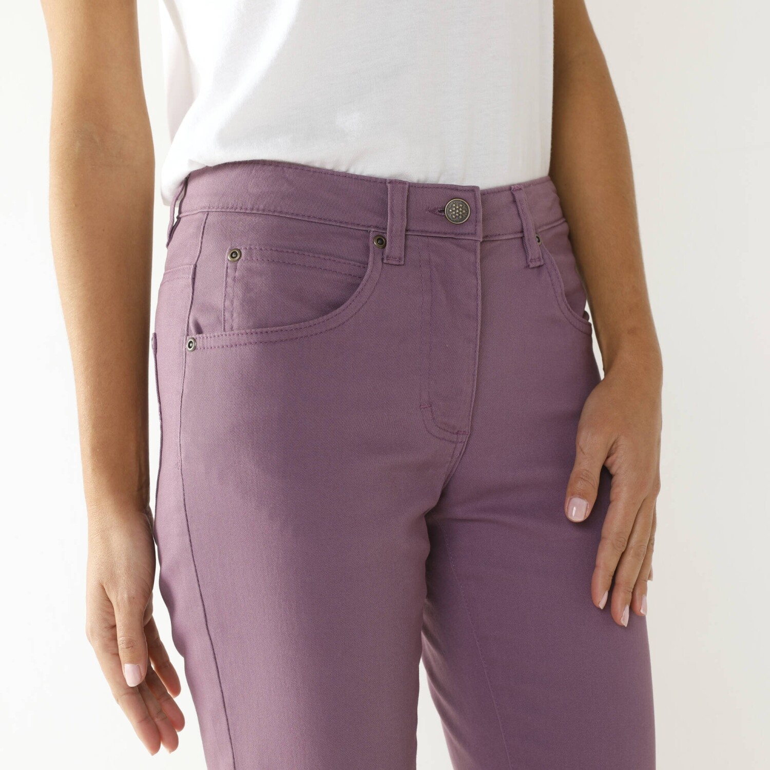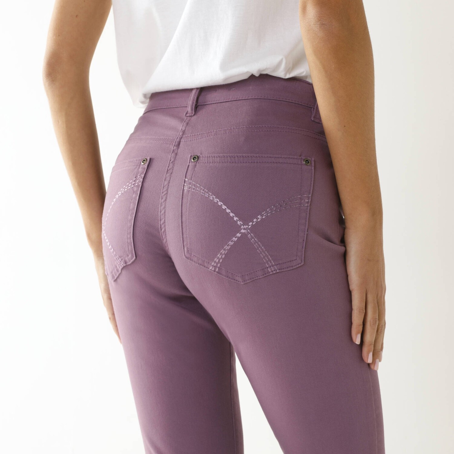 Рок-стиль грайливо підкреслюють вузькі штани 7/8 зі шкіри. Приталений крій. Висока талія. Вставлена фігурна талія. Піднята спинка. 5 шлевок для ременя. Застібка-блискавка спереду + кнопка. 5 кишень: прорізна кишеня, передні кишені та накладні кишені ззаду. Штани оздоблені низом.