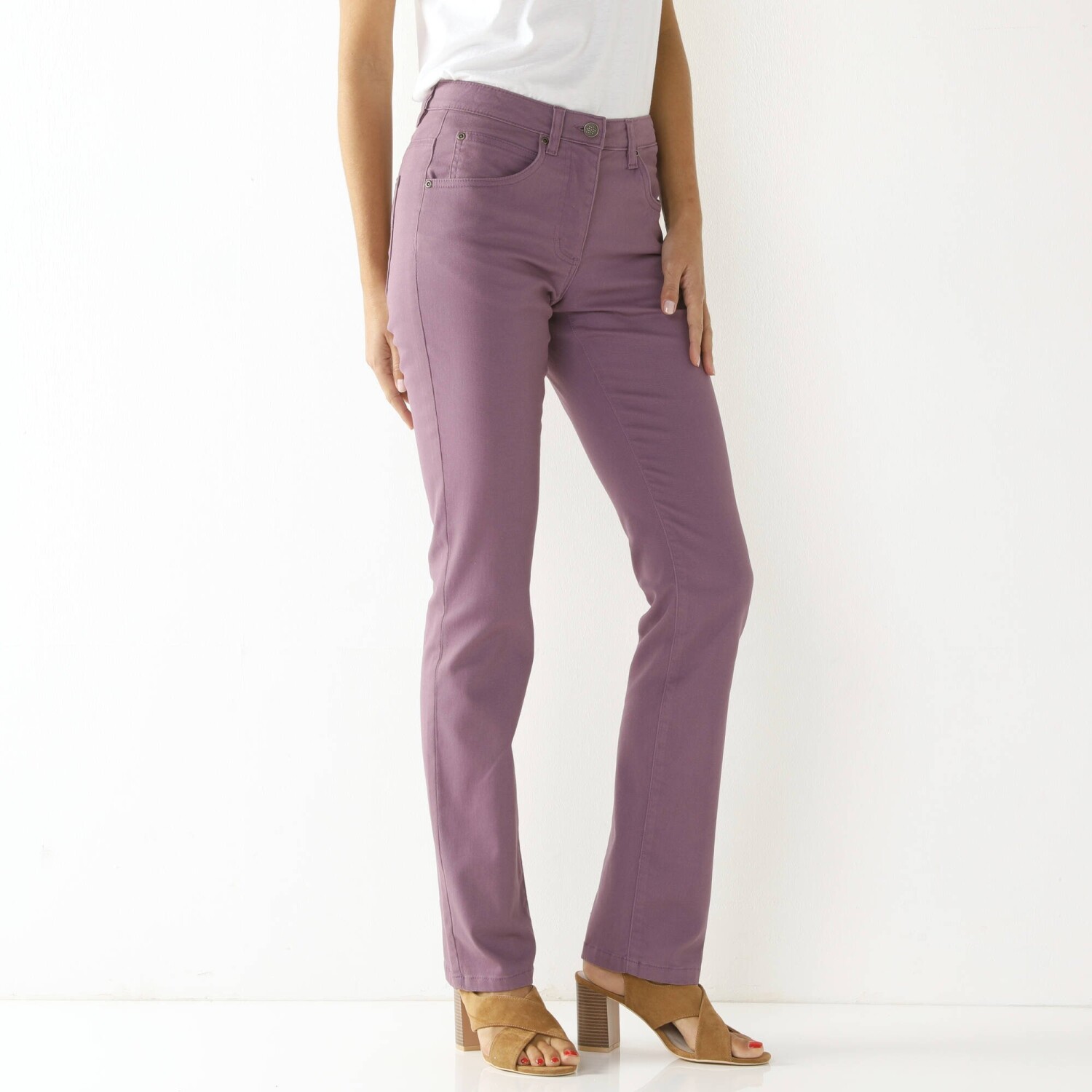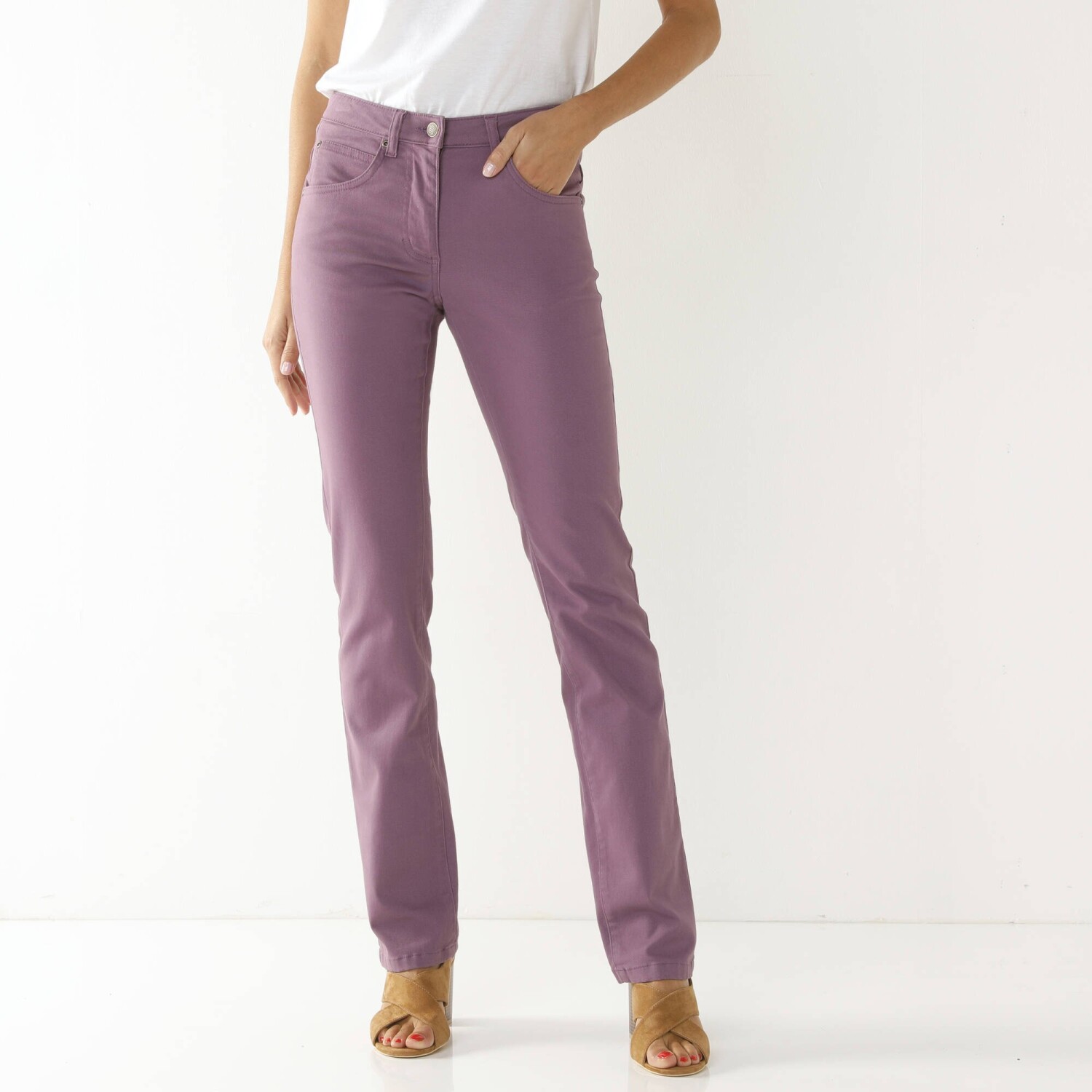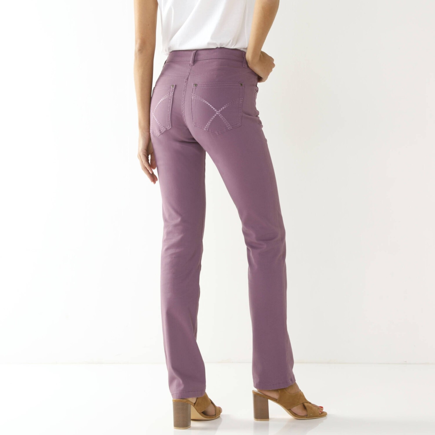 Рок-стиль грайливо підкреслюють вузькі штани 7/8 зі шкіри. Приталений крій. Висока талія. Вставлена фігурна талія. Піднята спинка. 5 шлевок для ременя. Застібка-блискавка спереду + кнопка. 5 кишень: прорізна кишеня, передні кишені та накладні кишені ззаду. Штани оздоблені низом.