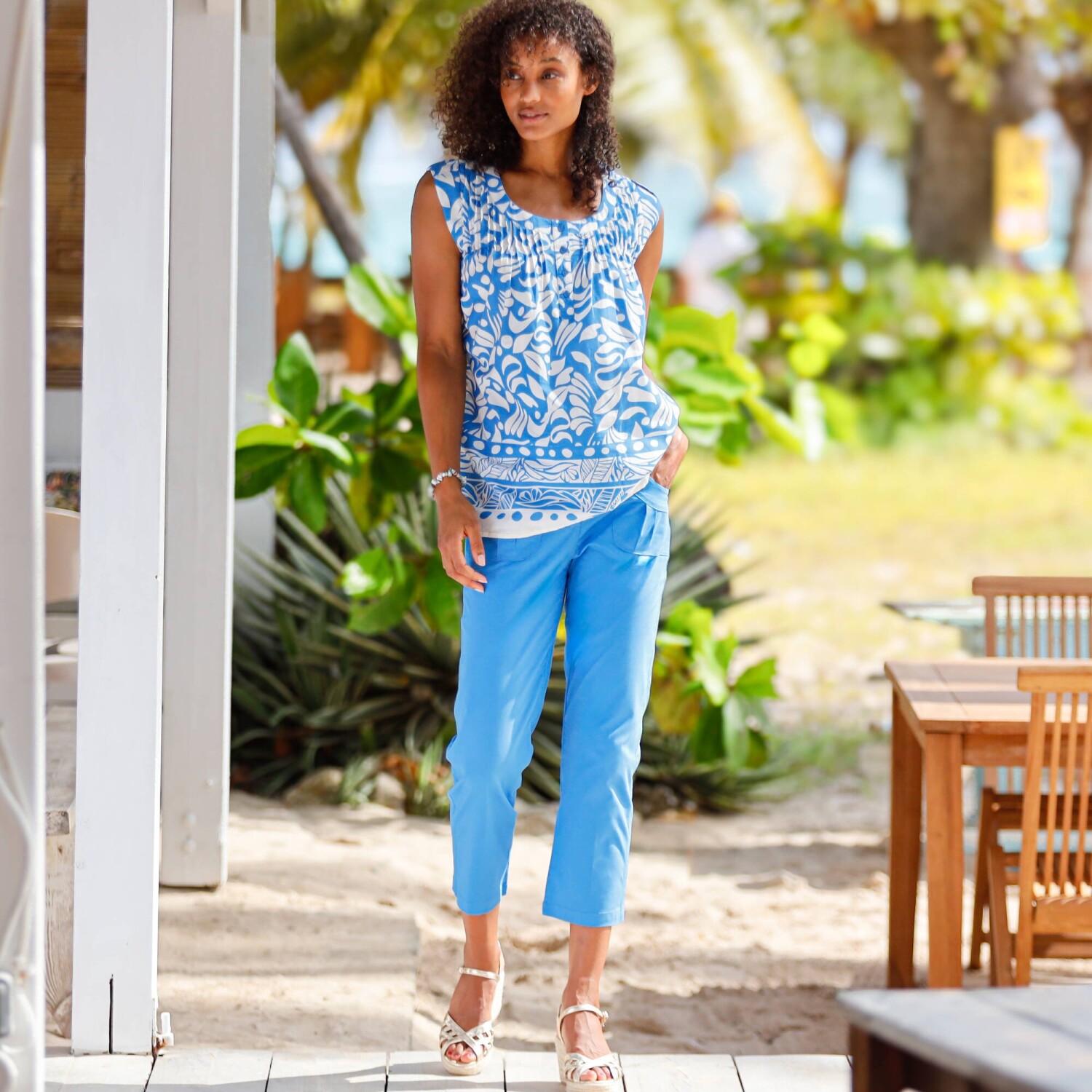 Туніка з планкою на ґудзиках та принтом додасть романтичного образу. Виготовлена з чистої бавовни, зручна у використанні. Блузка з круглим вирізом та складками спереду. Планка на 4 ґудзиках. Короткі рукави з клапаном + ґудзики. Можна прати в пральній машині.