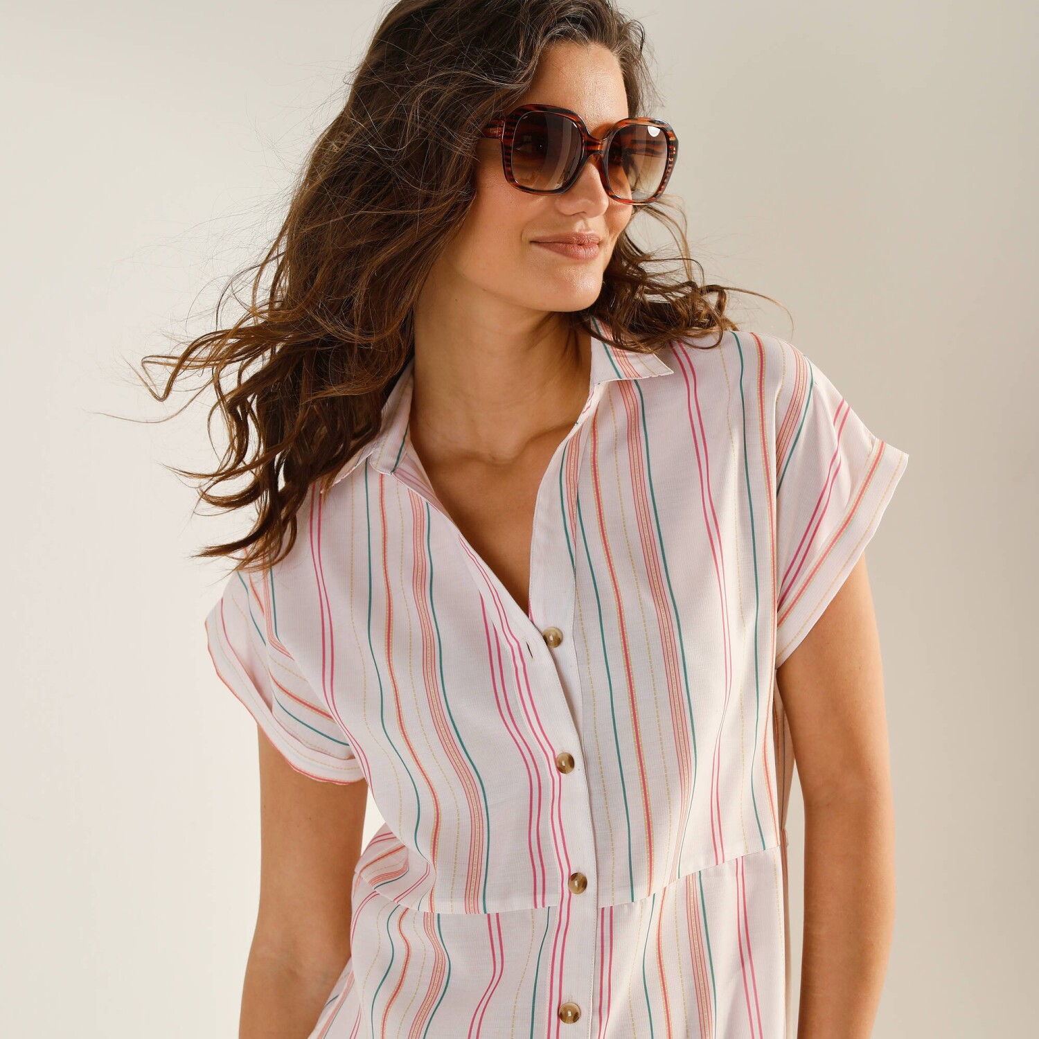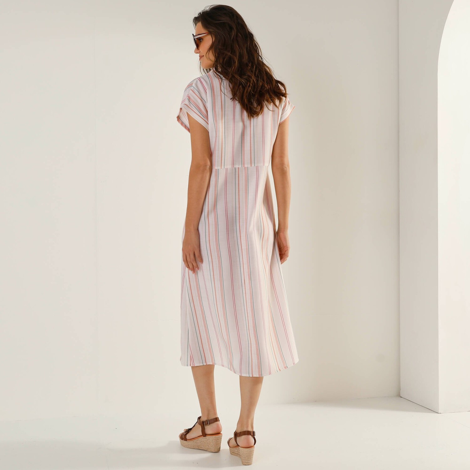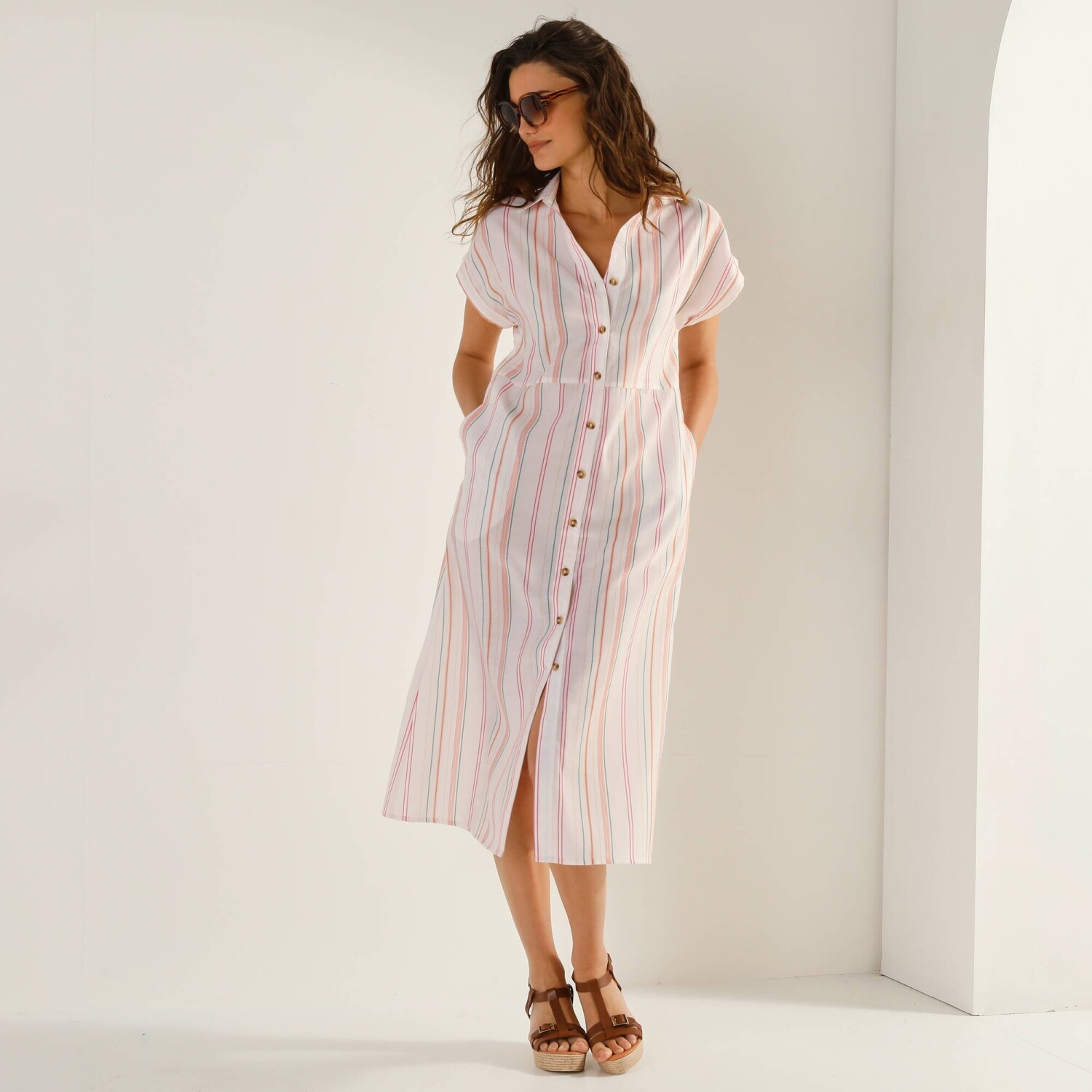 Ми розробили позачасову сукню-сорочку в оригінальному варіанті з принтом. Ідеальний виріб для літньої погоди. М'яка та повітряна в'язана тканина з принтом. Туніський виріз горловини з розрізом. Повна довжина переду на ґудзиках. Спущені пройми. Короткі рукави з підворотами. 2 нагрудні вшиті закруглені кишені. Кулиска на талії зі стопорами. Прямий низ з боковими розрізами. Можна прати в пральній машині.