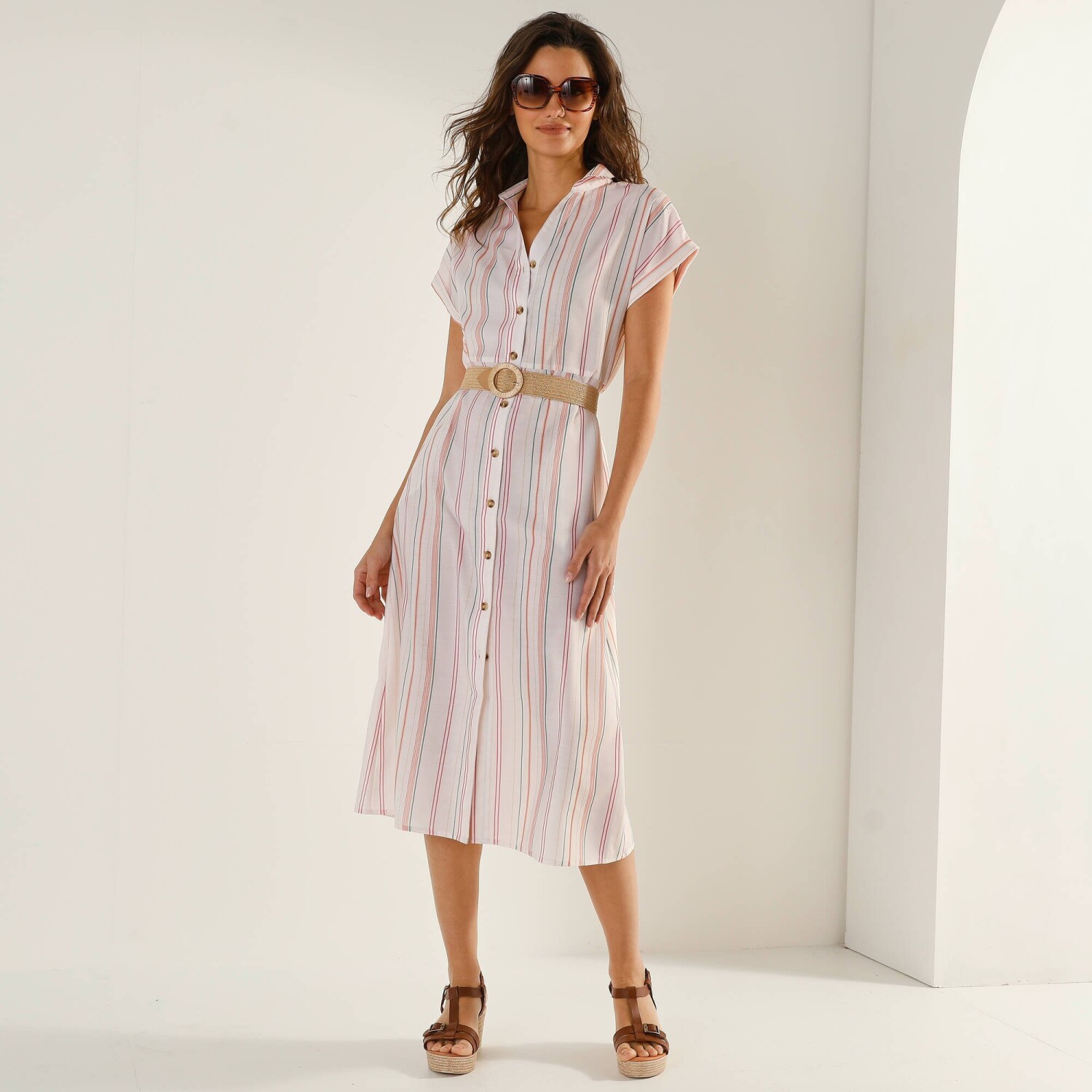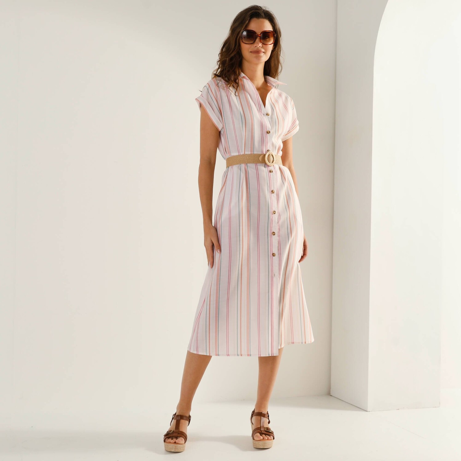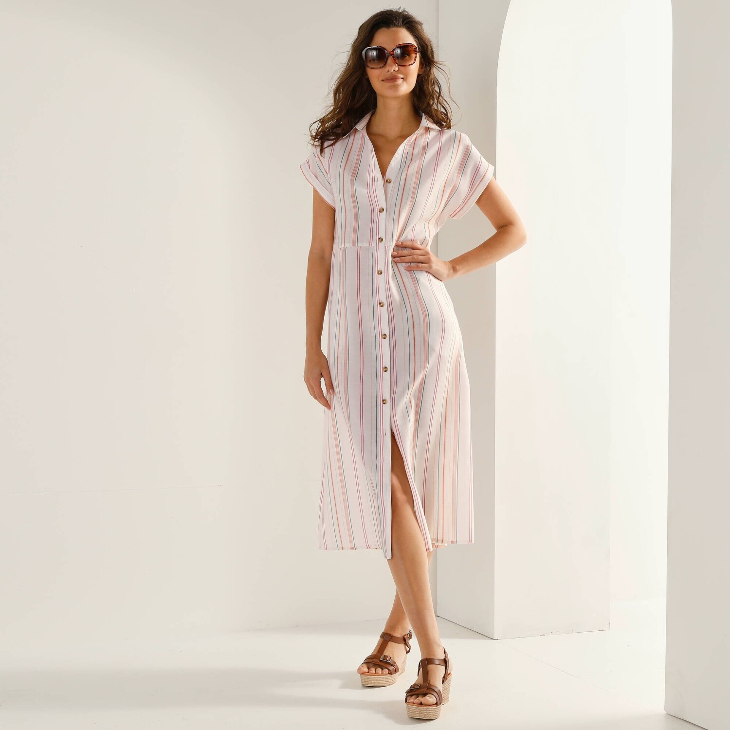 Ми розробили позачасову сукню-сорочку в оригінальному варіанті з принтом. Ідеальний виріб для літньої погоди. М'яка та повітряна в'язана тканина з принтом. Туніський виріз горловини з розрізом. Повна довжина переду на ґудзиках. Спущені пройми. Короткі рукави з підворотами. 2 нагрудні вшиті закруглені кишені. Кулиска на талії зі стопорами. Прямий низ з боковими розрізами. Можна прати в пральній машині.
