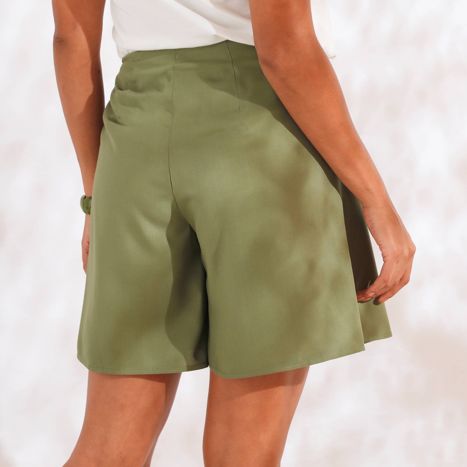 Шорти-спідниці із зав'язками, що відкривають ваші ноги, та зручні у використанні. Повітряна, м'яка тканина. Стандартна талія. Фігурний внутрішній пояс. Прихована блискавка з лівого боку. Закруглений поділ спідниці спереду. 2 виточки ззаду. Можна прати в пральній машині.