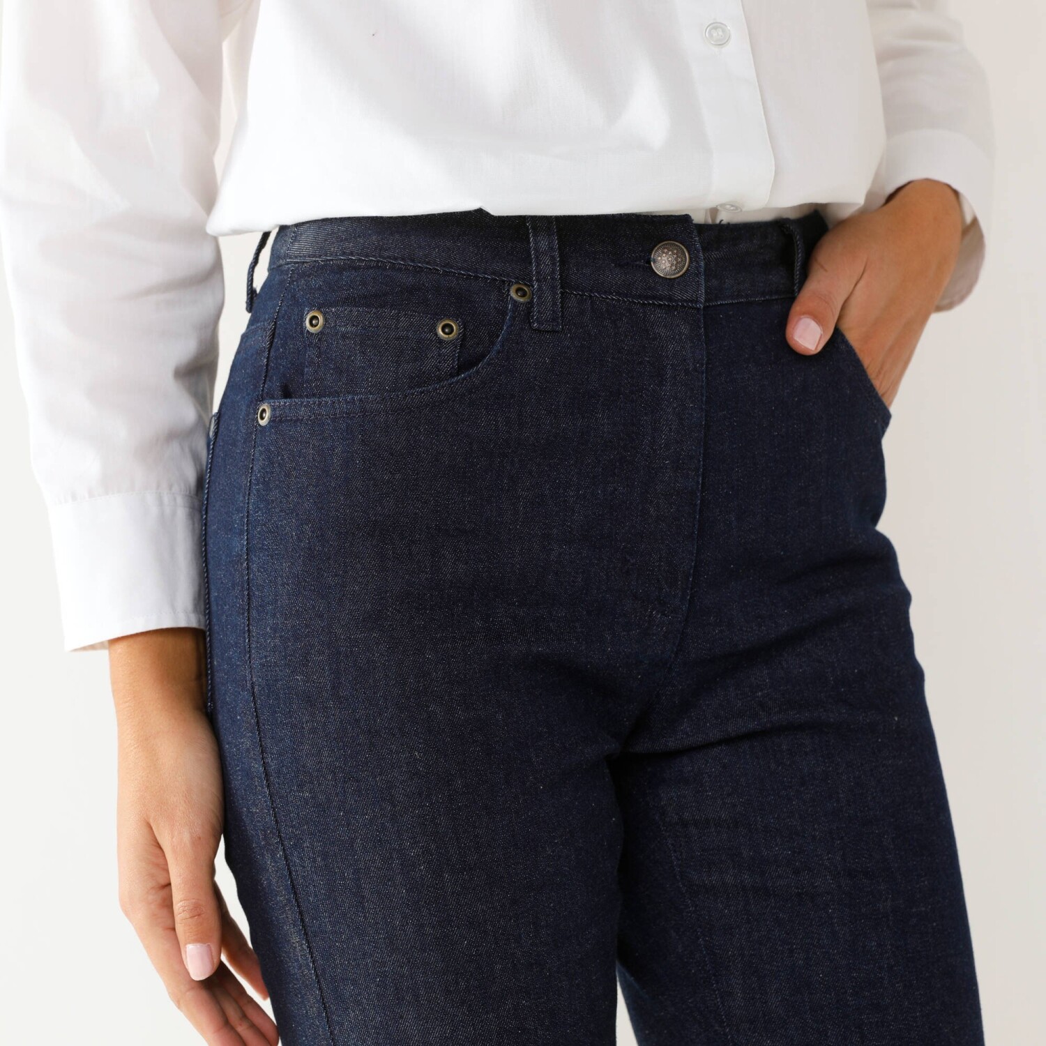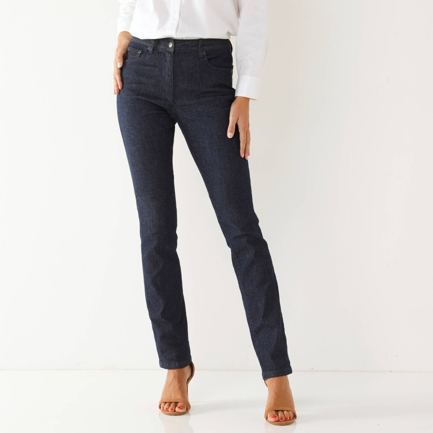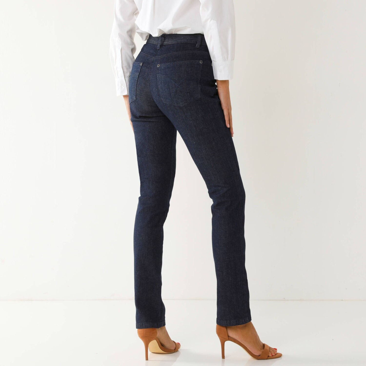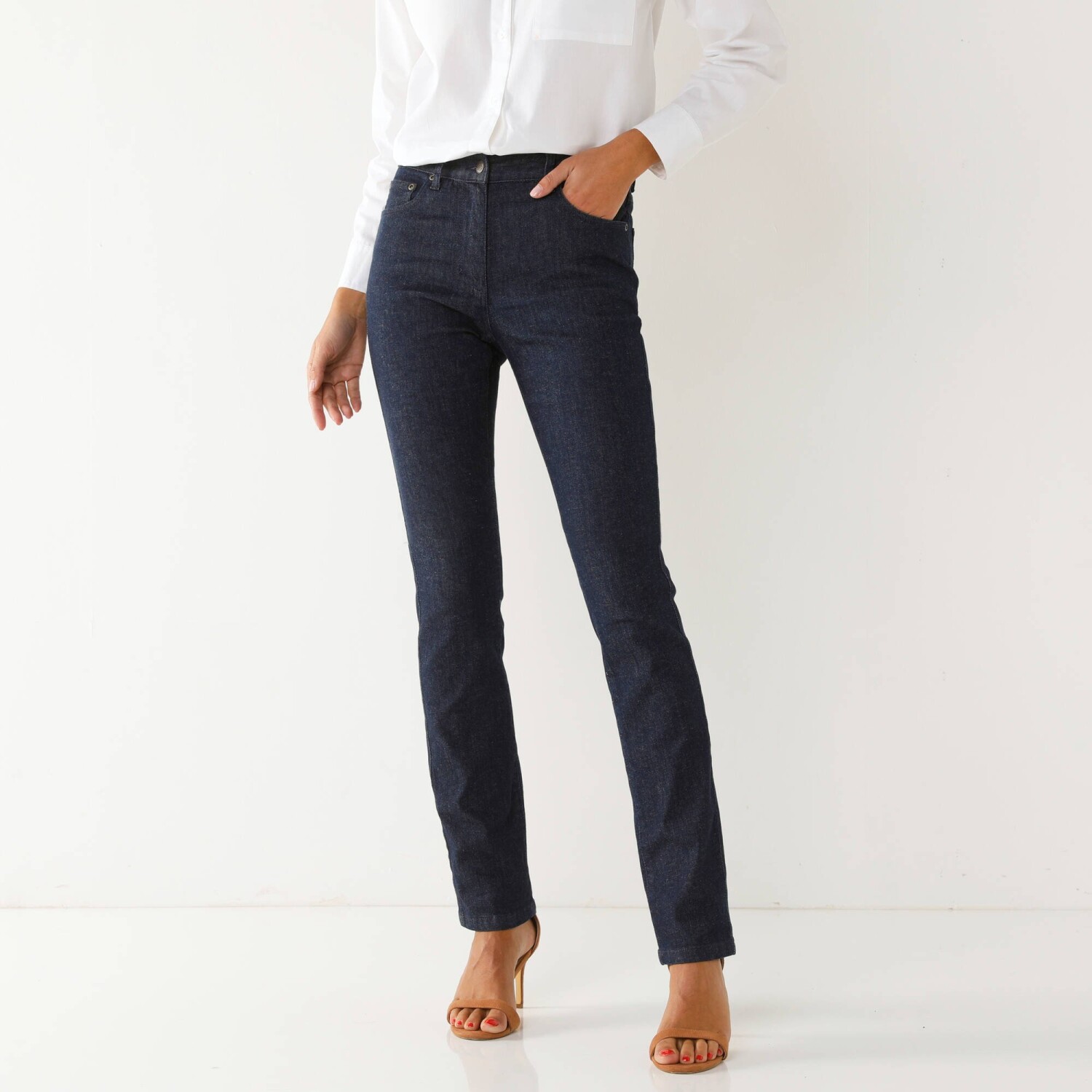 Стандартна висота талії. Фігурний пояс з петлями для ременя, еластичний ззаду та з боків до 44-го розміру. 2 кишені + 1 передня кишеня. 2 вшиті кишені ззаду. Піднята спинка. Стандарт 100 відповідно до Oeko-Tex (n° CQ 1216 / 3 IFTH). Цей знак ідентифікує текстильні вироби, які пройшли лабораторні випробування на вміст широкого спектру шкідливих речовин, і продукт є безпечнішим за чинні стандарти. Можна прати в пральній машині.