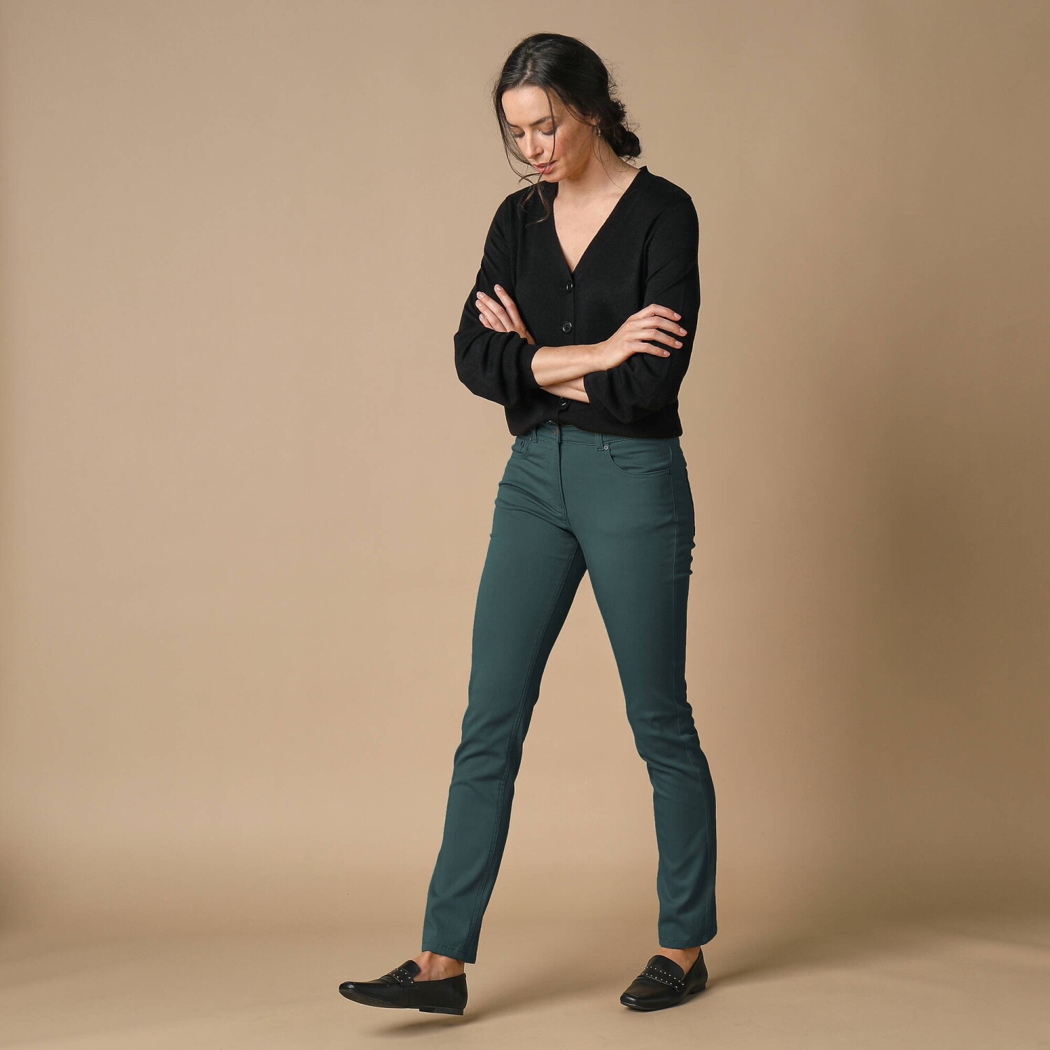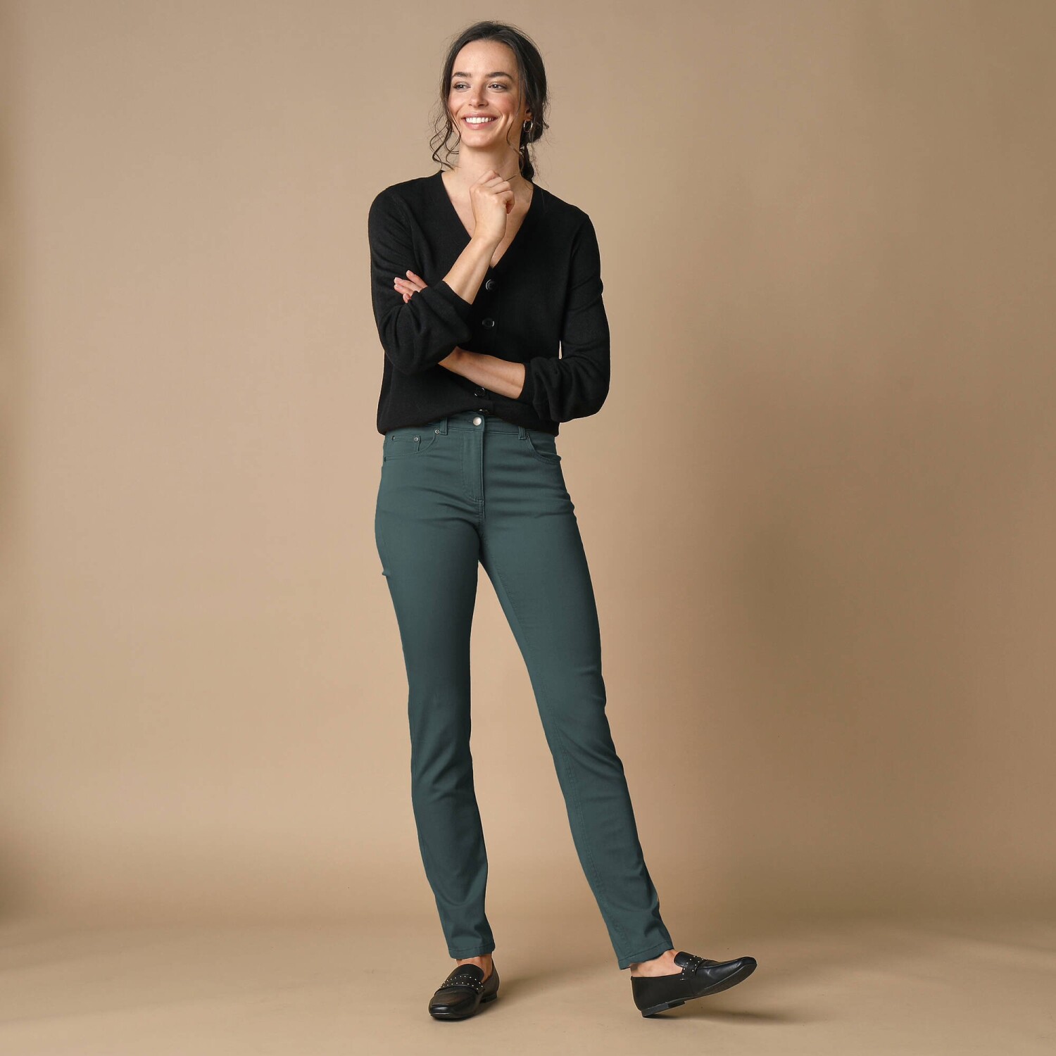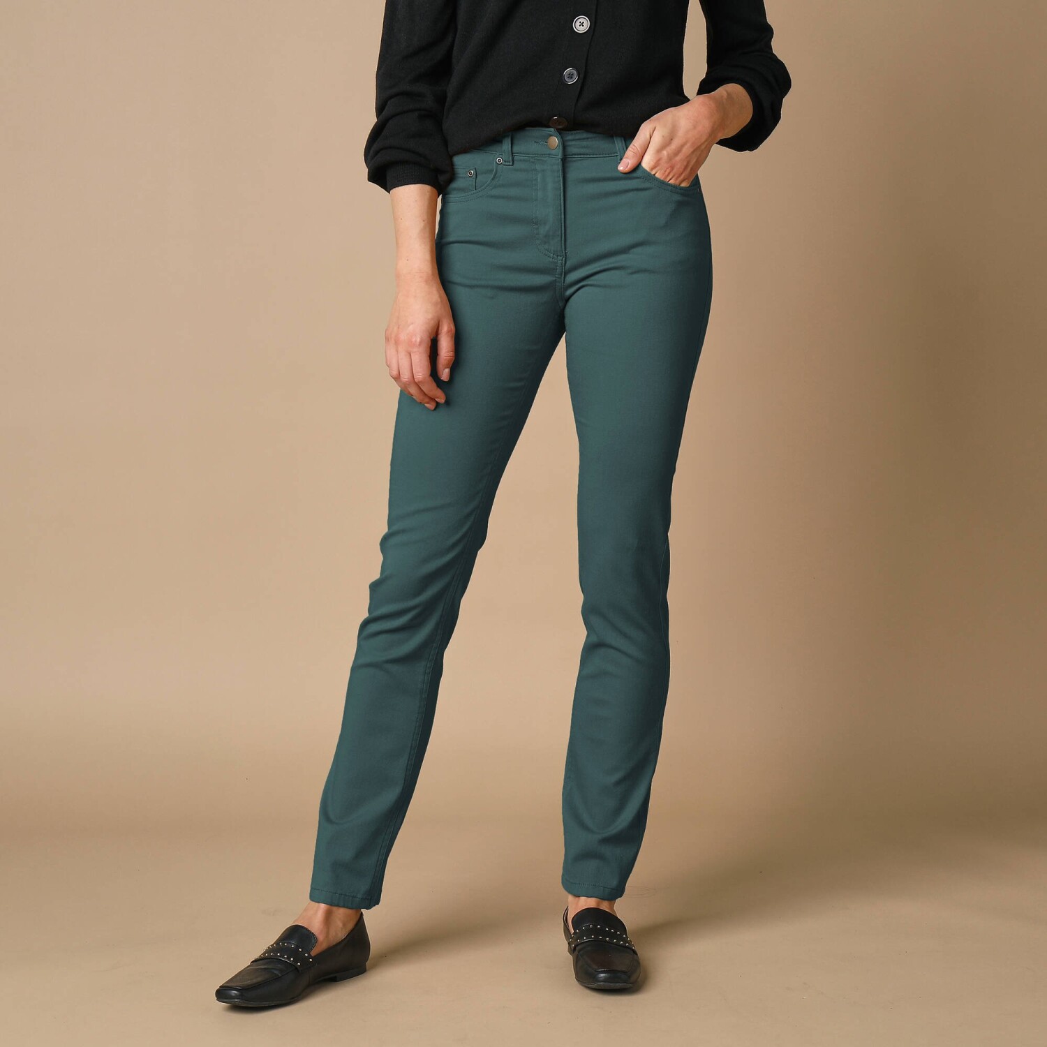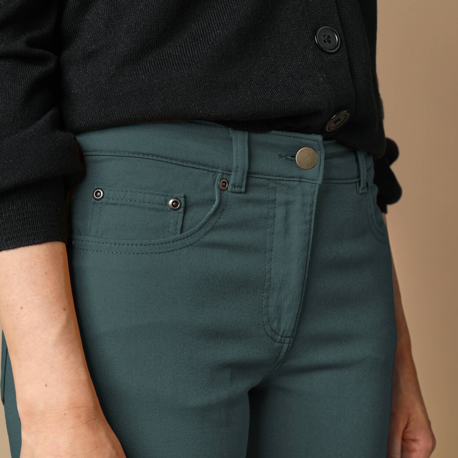Карго-штани з кишенями - чудова ідея для літа. Звичайна висота талії. Карго-крій. Фігурний пояс з аплікацією та куліскою зі шнурком. Застібка на блискавку + 1 ґудзик. 2 врізні кишені + 2 кишені для зберігання спереду. Бічні накладні кишені з клапаном. 2 накладні кишені та 2 прорізні кишені ззаду. Можна прати у пральній машині.