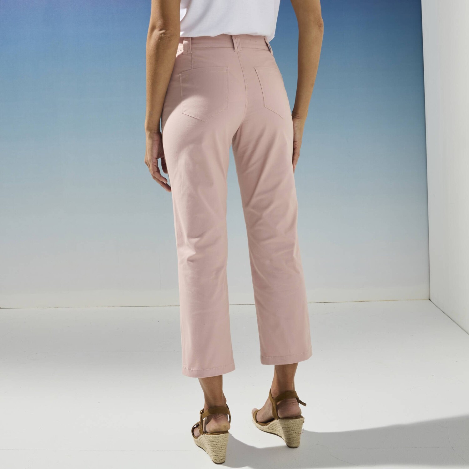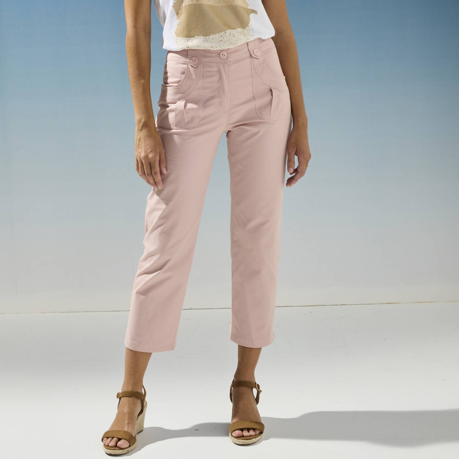 Модні брюки 7/8 легко комбінувати та зручно носити. Прямий крій. Фігурний пояс, з 44 розміру підвернутий ззаду для ще більшого комфорту. Застібка на блискавку та ґудзики. Петлі для ременя, 2 з яких застібаються на ґудзики спереду. 2 застібки ззаду. Еластична комфортна тканина. Стандарт 100 відповідно до Oeko-Tex (n° CQ 1216 / 3 IFTH). Цей знак ідентифікує текстильні вироби, які пройшли лабораторні випробування на вміст широкого спектру шкідливих речовин, і продукт є безпечнішим за чинні стандарти. Можна прати в пральній машині.