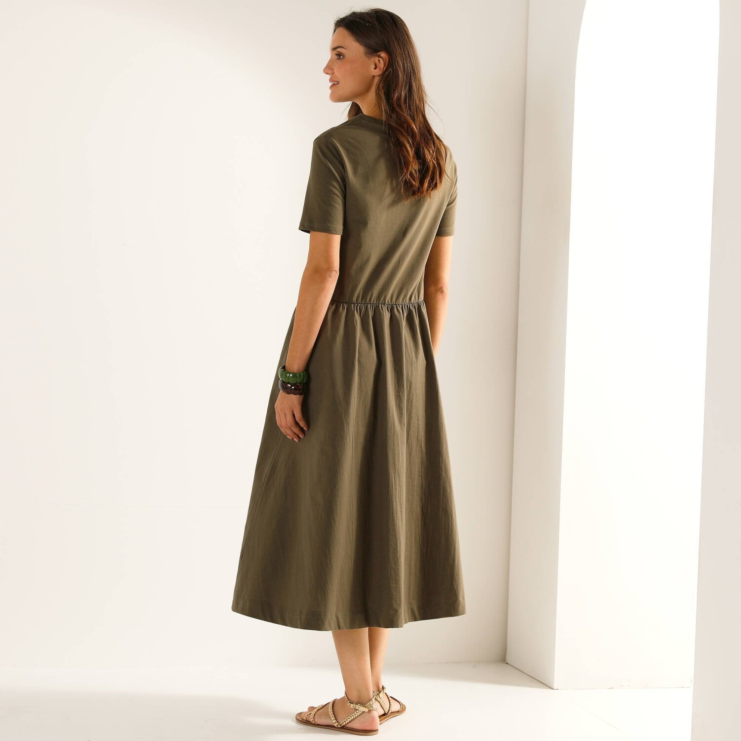 Маленькі чорні сукні мають бути невід'ємною частиною гардеробу кожної жінки. Ми пропонуємо їх вам у більш повсякденному варіанті з дрібним принтом та вишуканими складками. Розкльошений крій. Довжина вище коліна. V-подібний виріз зі складками спереду. Довгі рукави-блузи з манжетами з рюшами. Рюші спереду під плечима. Можна прати в пральній машині.