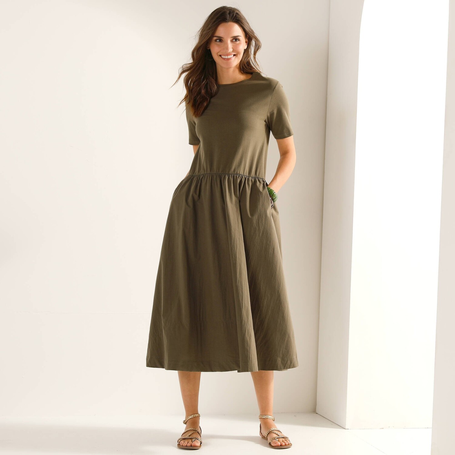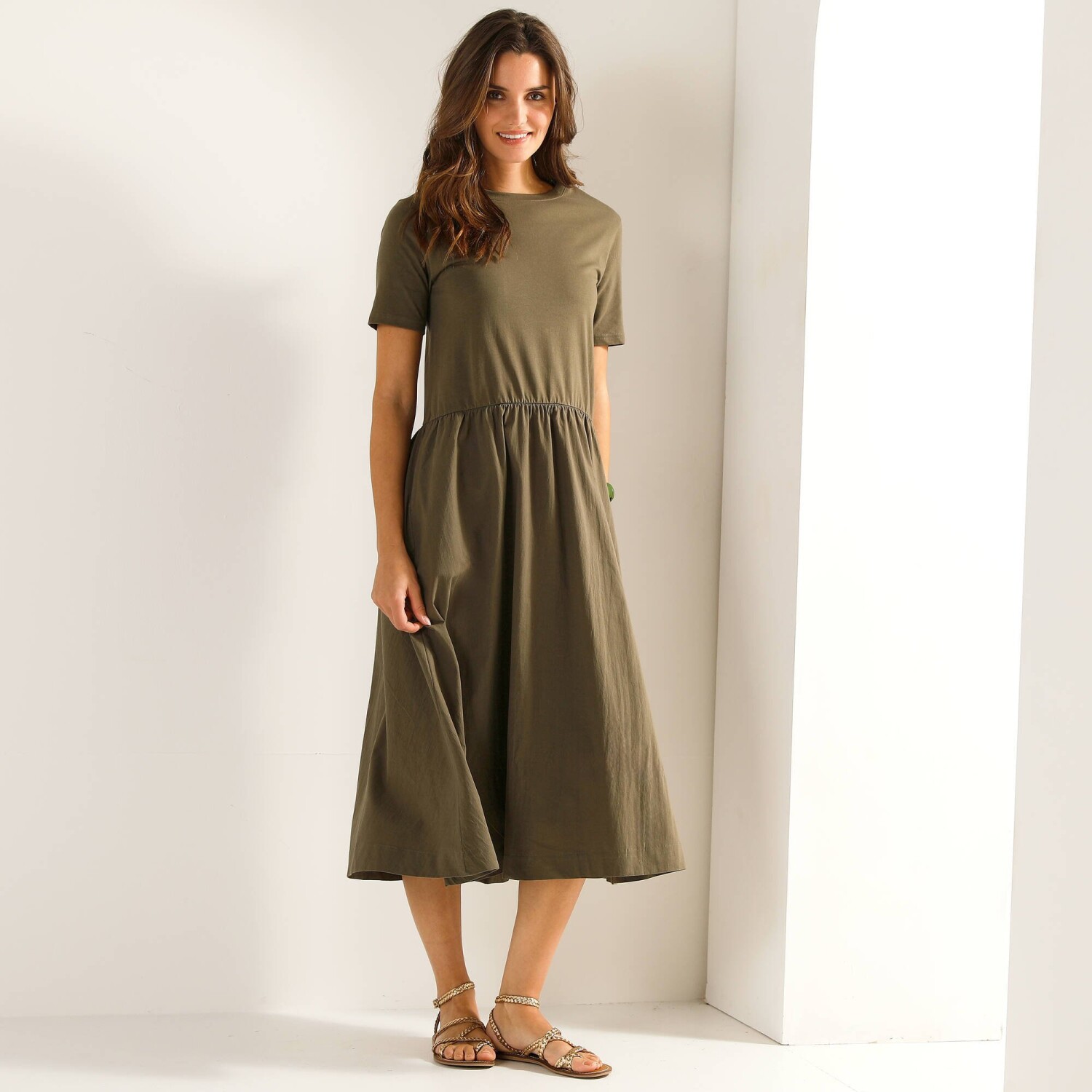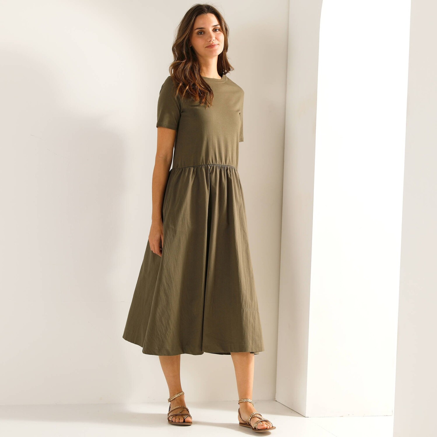 Двоколірна коротка сукня зі складками та однотонним принтом у вигляді листя