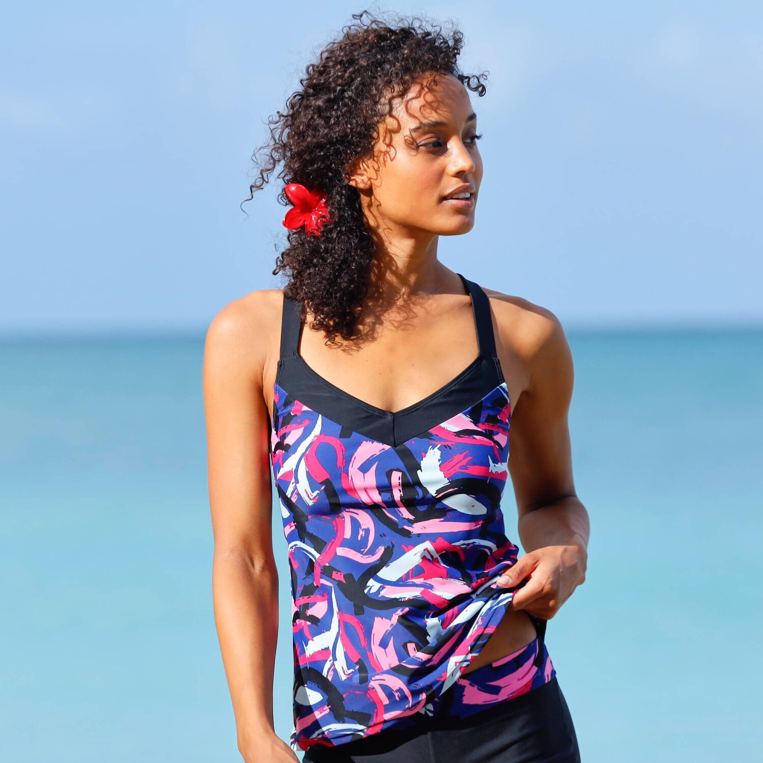 Ефект блузки змушує забути про комплекси, а візерунок зебри відповідає модному тренду: в результаті виходить купальник-танкіні. Інтегрований бюстгальтер з чашками. Під грудьми еластична резинка. Поділ блузки із зав'язкою збоку. Регульовані бретелі на спині. Оздоблення однотонне. Стандарт Oeko-Tex 100 (n° CQ 1216 / 3 IFTH). Цей знак ідентифікує текстильні вироби, які пройшли лабораторні випробування на вміст широкого спектру шкідливих речовин, і виріб є безпечним понад діючі стандарти. Можна прати у пральній машині. Рекомендуємо полоскати в чистій воді після кожного використання. Стійкий до морської води та хлору, підходить для пляжу та басейну.