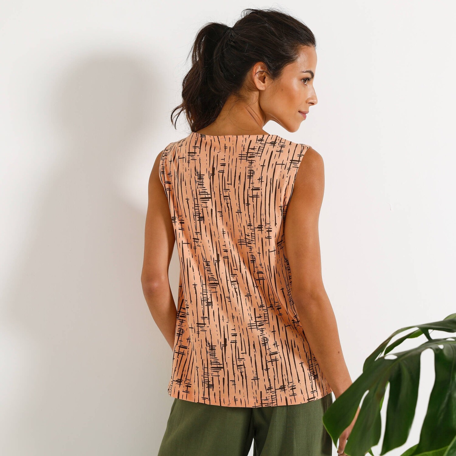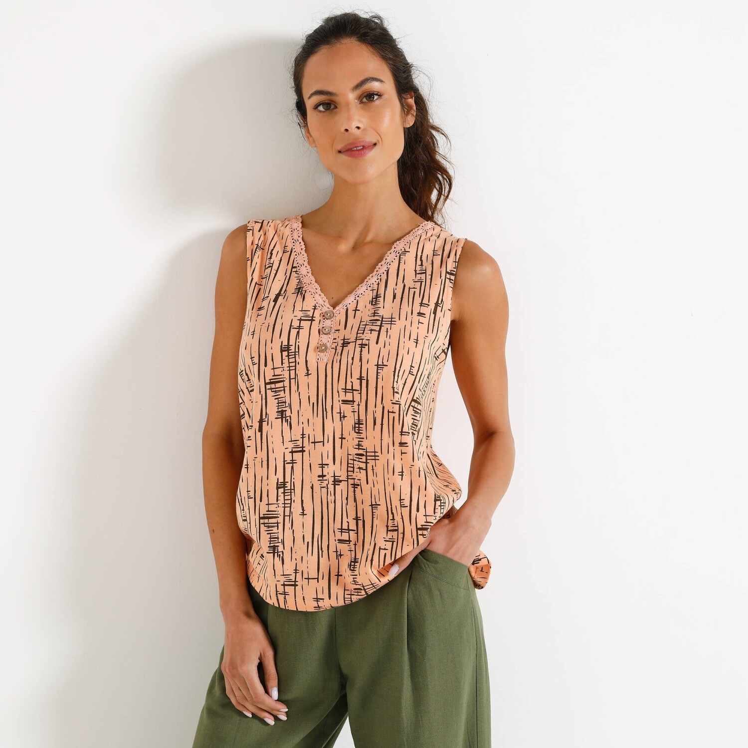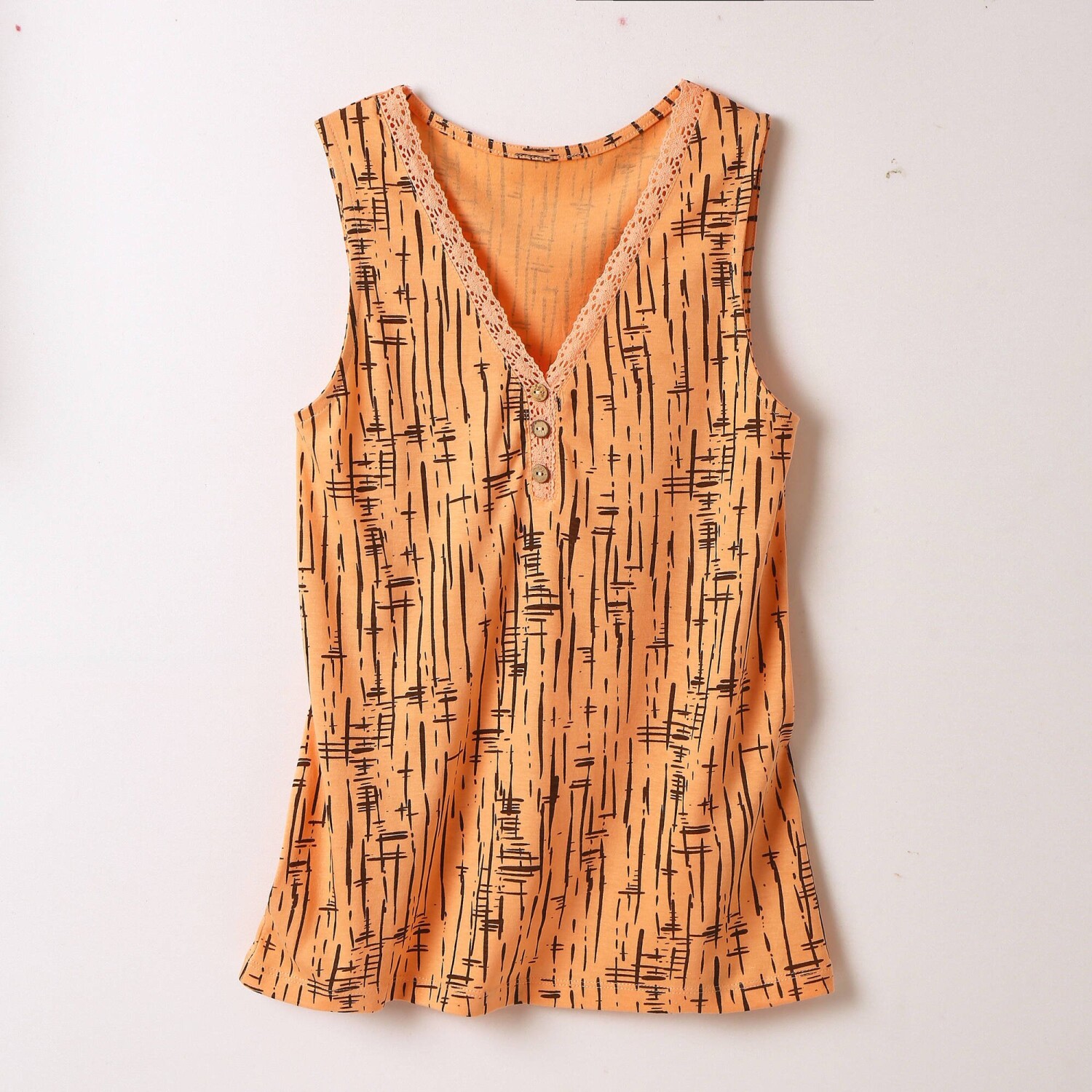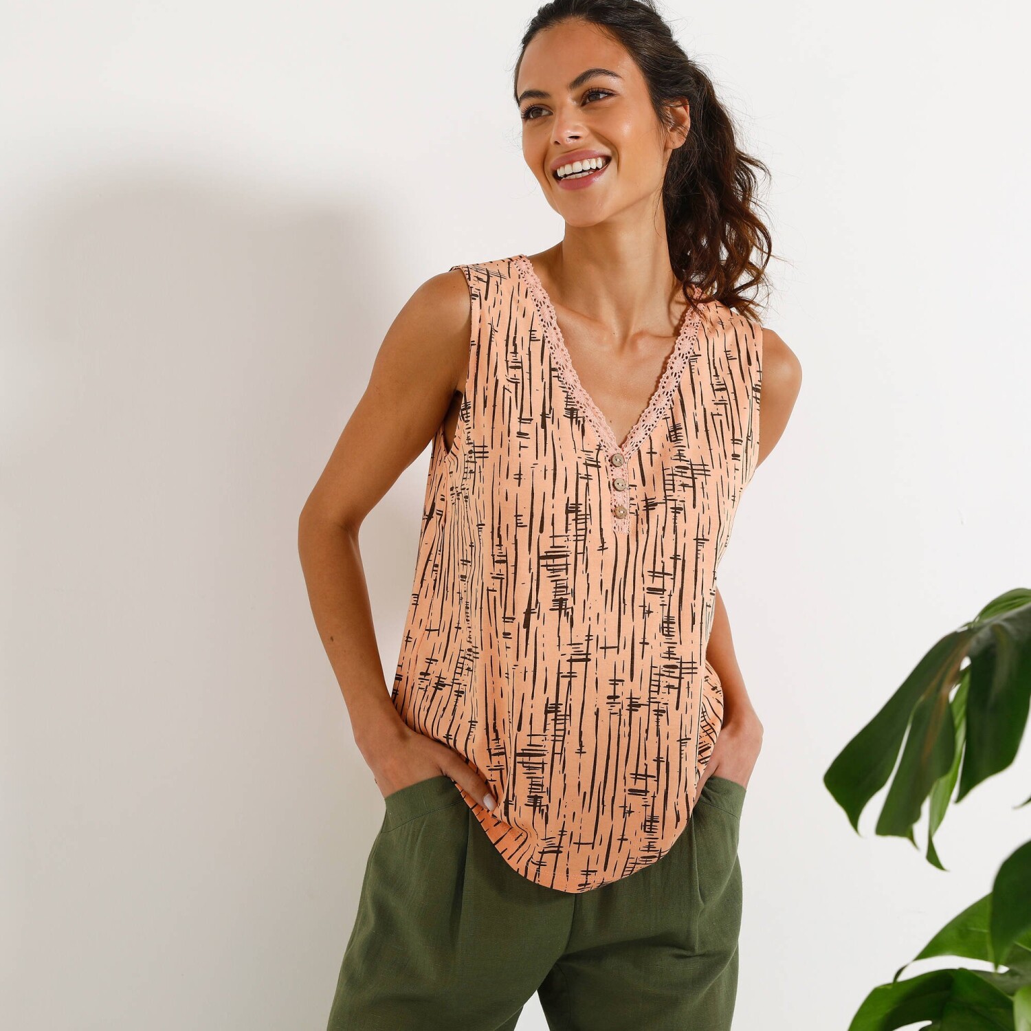 Ви оціните цей принтований топ з V-подібним вирізом для різних випадків. Повітряна в'язка, легка у догляді. V-подібний виріз на підкладці з макраме. Планка на 3 ґудзики під кокос. Прямий поділ. Можна прати в пральній машині.