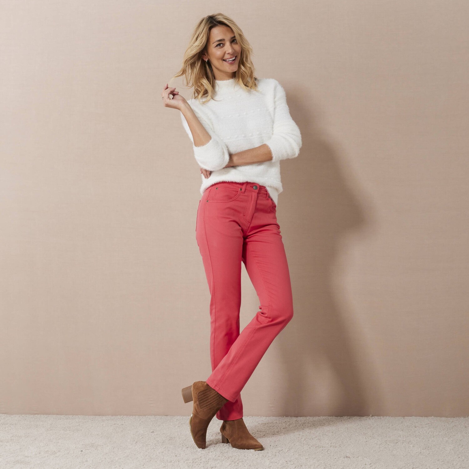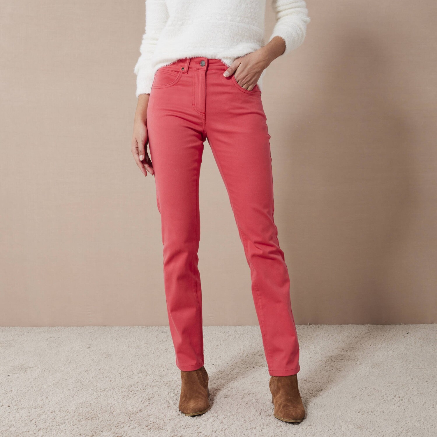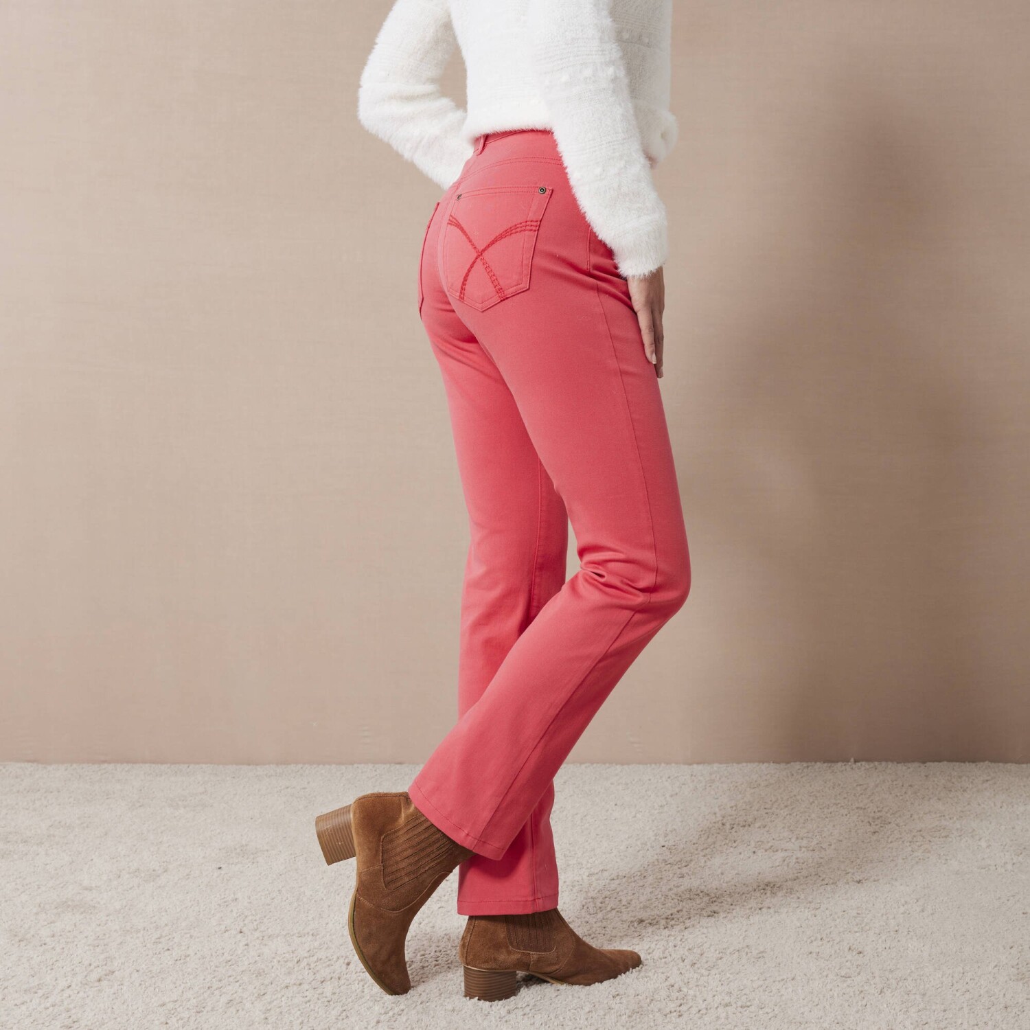 Виготовлені з еластичного матеріалу, ці штани зменшують сідниці та формують стегна! Стандартна висота талії. Еластичний пояс ззаду з боків, починаючи з 44 розміру. Піднята частина ззаду. Застібка на блискавку та ґудзики. 2 передні кишені. 2 вишиті задні кишені. Виготовлені з еластичного матеріалу для свободи рухів. Сертифікат «Зроблено в зеленому» від OEKO-TEX®. Окрім перевірки кількох сотень хімічних речовин (СТАНДАРТ 100), що сприяє високій безпеці, цей знак гарантує дотримання уважних принципів виробництва та контрольованих соціальних практик (сертифікат STeP). Можна прати в пральній машині.