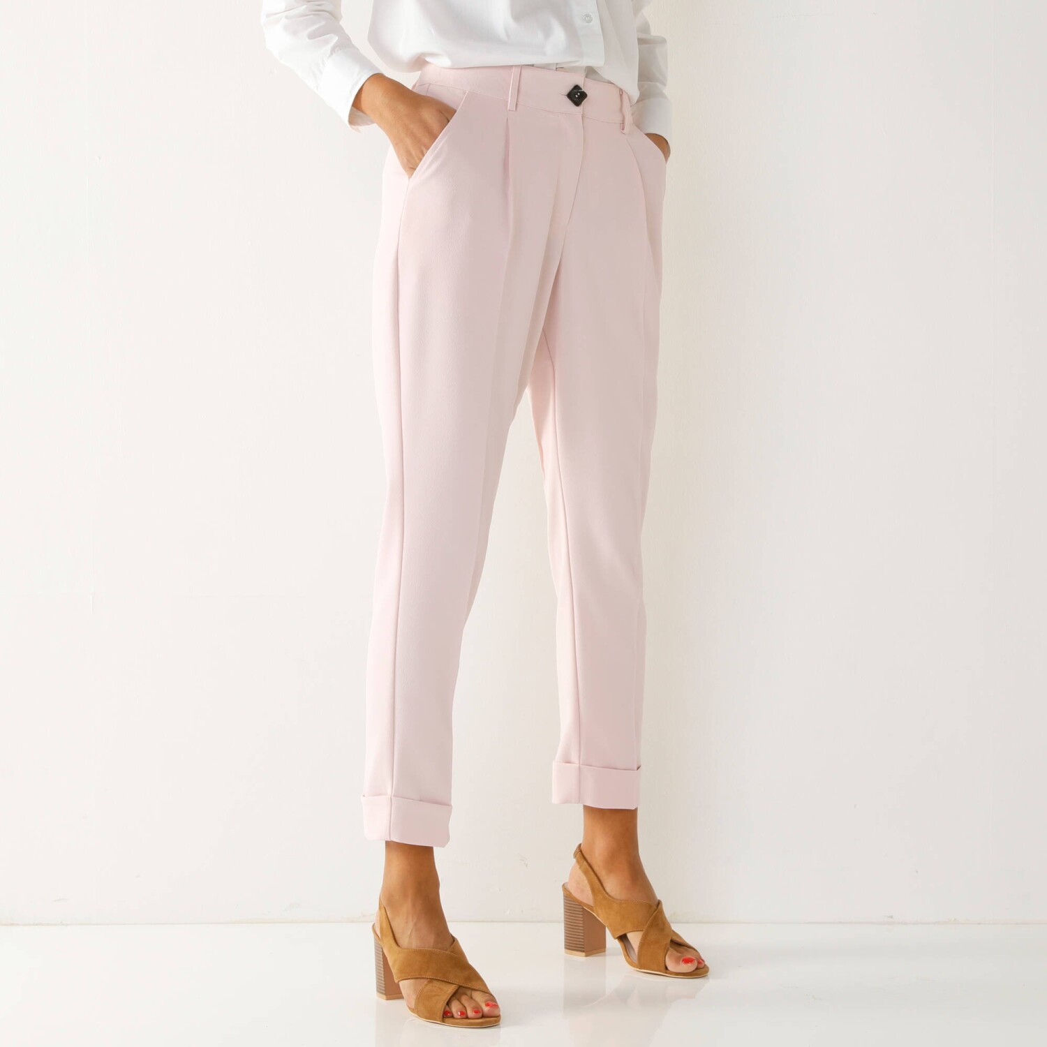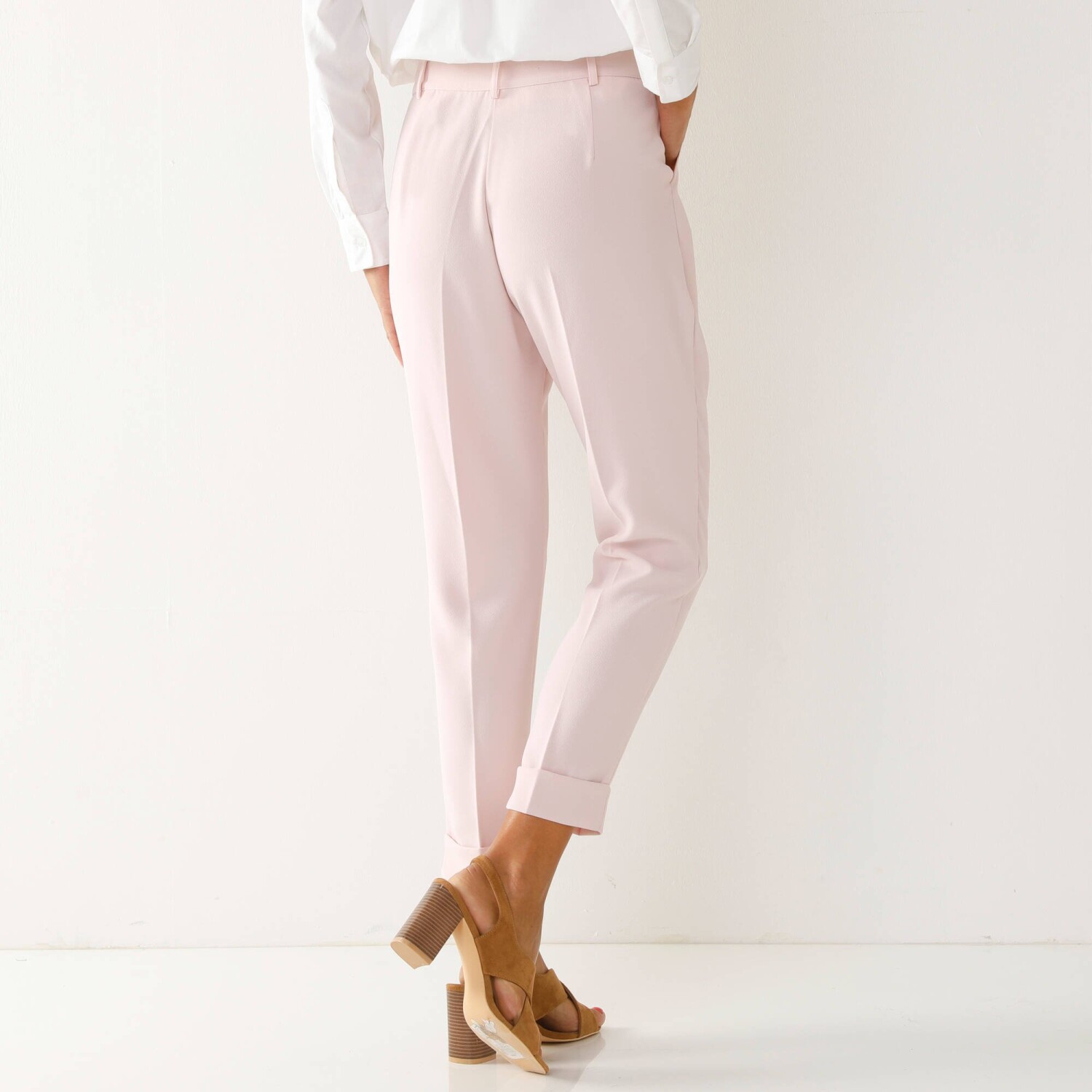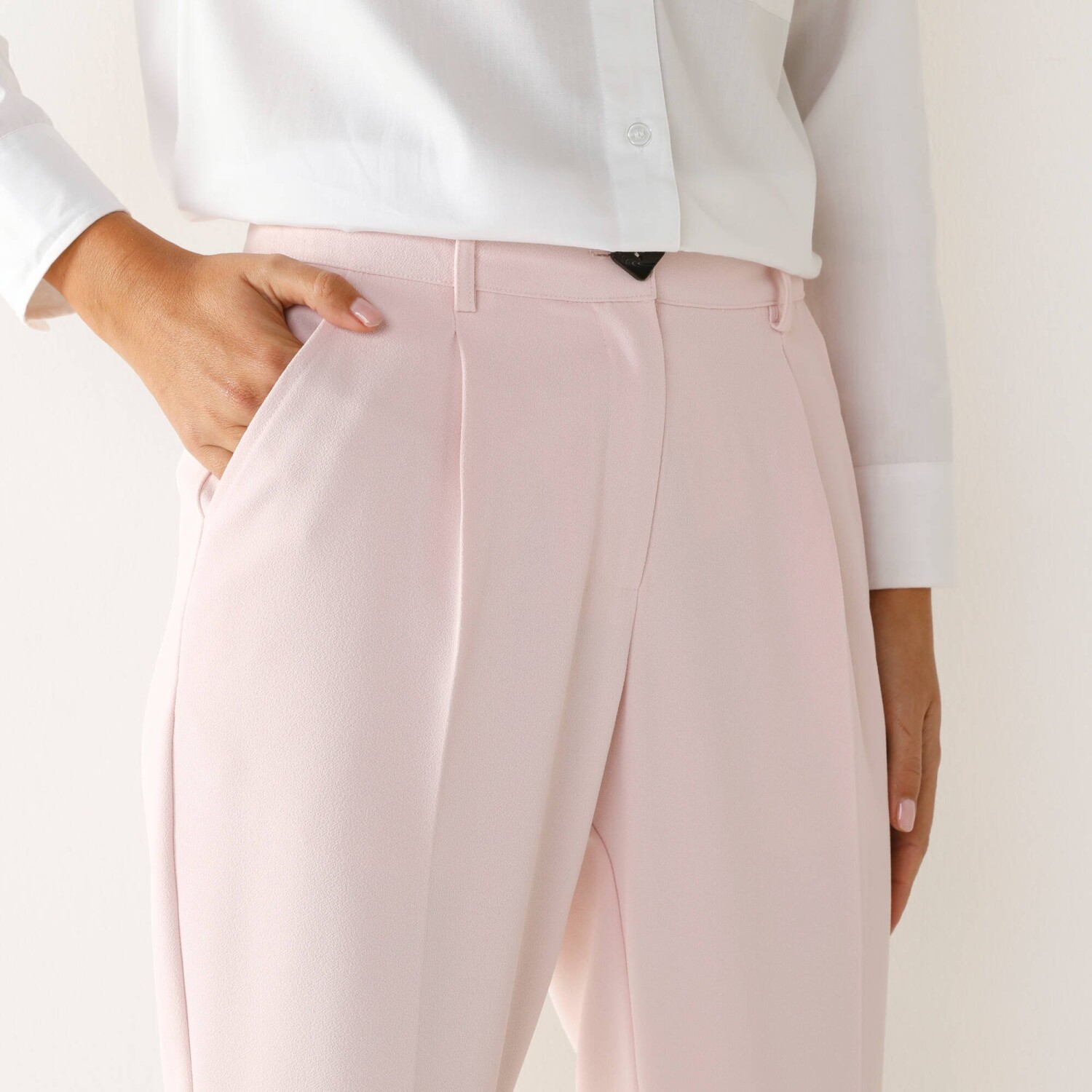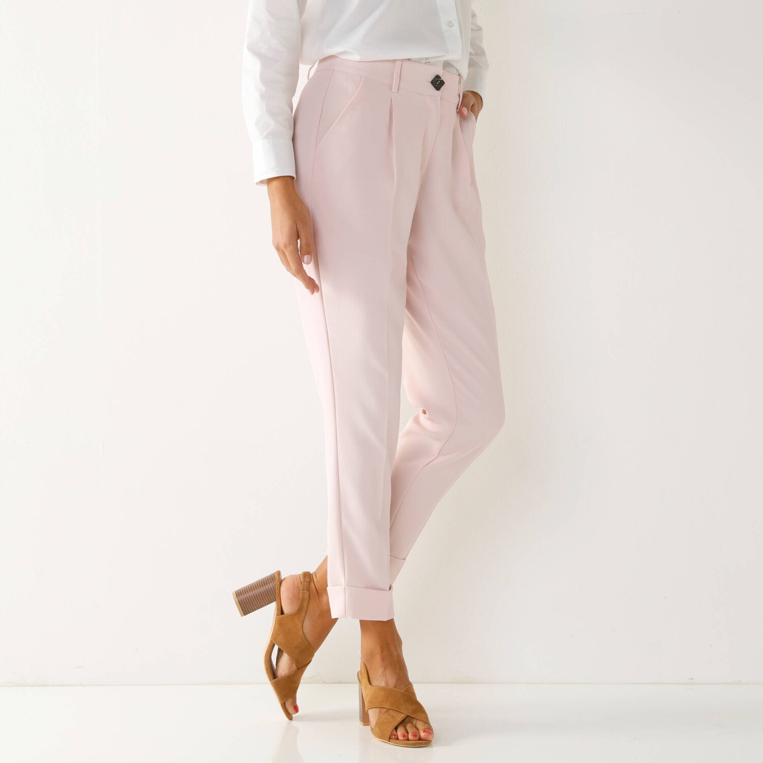 Приталений, фігурний пояс, який з 44-го розміру переходить в резинку ззаду на стегнах. Нормальна висота талії. Петлі для ременя. 2 передні кишені + 1 кишеня. Ззаду підвищення + 2 вшиті кишені. Можна прати у пральній машині.